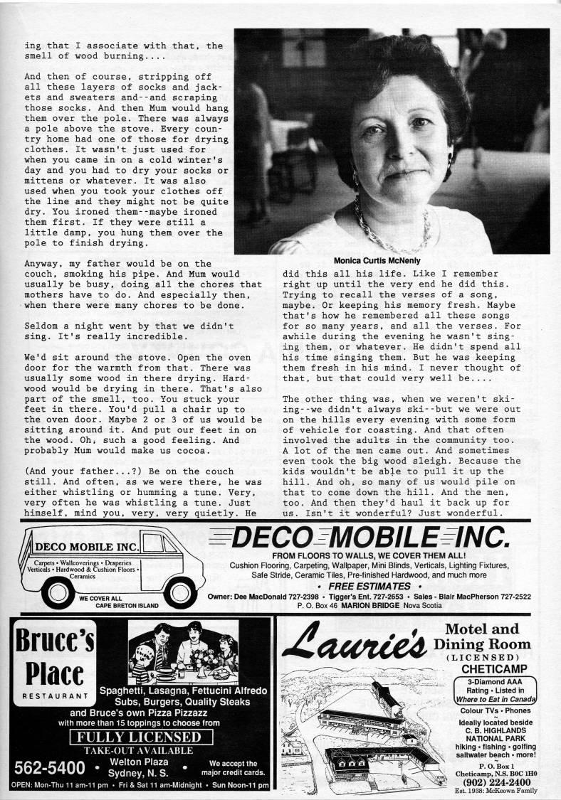 ing that I associate with that, the smell of wood burning.... And then of course, stripping off all these layers of socks and jack? ets and sweaters and--and scraping those socks. And then Mum would hang them over the pole. There was always a pole above the stove. Every coun? try home had one of those for drying clothes. It wasn't just used for when you came in on a cold winter's day and you had to dry your socks or mittens or whatever. It was also used when you took your clothes off the line and they might not be quite dry. You ironed them--maybe ironed them first. If they were still a little damp, you hung them over the pole to finish drying. Anyway, my father would be on the couch, smoking his pipe. And Mum would usually be busy, doing all the chores that mothers have to do. And especially then, when there were many chores to be done. Seldom a night went by that we didn't sing. It's really incredible. We'd sit around the stove. Open the oven door for the warmth from that. There was usually some wood in there drying. Hard? wood would be drying in there. That's also part of the smell, too. You stuck your feet in there. You'd pull a chair up to the oven door. Maybe 2 or 3 of us would be sitting around it. And put our feet in on the wood. Oh, such a good feeling. And probably Mum would make us cocoa. (And your father...?) Be on the couch still. And often, as we were there, he was either whistling or humming a tune. Very, very often he was whistling a tune. Just himself, mind you, very, very quietly. He Monica Curtis McNenly did this all his life. Like I remember right up until the very end he did this. Trying to recall the verses of a song, maybe. Or keeping his memory fresh. Maybe that's how he remembered all these songs for so many years, and all the verses. For awhile during the evening he wasn't sing? ing them, or whatever. He didn't spend all his time singing them. But he was keeping them fresh in his mind. I never thought of that, but that could very well be.... The other thing was. when we weren't ski? ing- -we didn't always ski--but we were out on the hills every evening with some form of vehicle for coasting. And that often involved the adults in the community too. A lot of the men came out. And sometimes even took the big wood sleigh. Because the kids wouldn't be able to pull it up the hill. And oh. so many of us would pile on that to come down the hill. And the men. too. And then they'd haul it back up for us. Isn't it wonderful? Just wonderful. DECO MOBILE INC. Carpets • Wallcoverings • Draperies / Verticals • Hardwood & Cushion Floors 'Ceramics DECOmOBILE'NC. FROM FLOORS TO WALLS, WE COVER THEM ALL! Cushion Flooring, Carpeting, Wallpaper, Mini Blinds, Verticals, Lighting Fixtures, Safe Stride, Ceramic Tiles, Pre-finished Hardwood, and much more • FREE ESTIMATES • Owner: Dee MacDonald 727-2398 • Tigger's Ent. 727-2653 • Sales - Blair MacPherson 727-2522 P. O. Box 46 MARION BRIDGE Nova Scotia Spaghetti, Lasagna, Fettucini Alfredo Subs, Burgers, Quality Steaks and Bruce's own Pizza Pizzazz with more than 15 toppings to choose from I FULLY LICENSED | TAKE-OUT AVAILABLE /inn • Welton Plaza weacceptthe 'UU Sydney, N.S. major credit cards. 'aunicA Motel and Dining Room (LICENSED) CHETICAMP 3-Diamond AAA Rating • Listed in y/here to Eat in Canad' Colour TVs • Phones Ideally located beside C. B. HIGHLANDS NATIONAL PARK hiking • fishing • golfing saltwater beach • more! P. O. Box 1 Cheticamp, N.S. BOC IHO (902) 224-2400 Est. 1938: McKeown Family