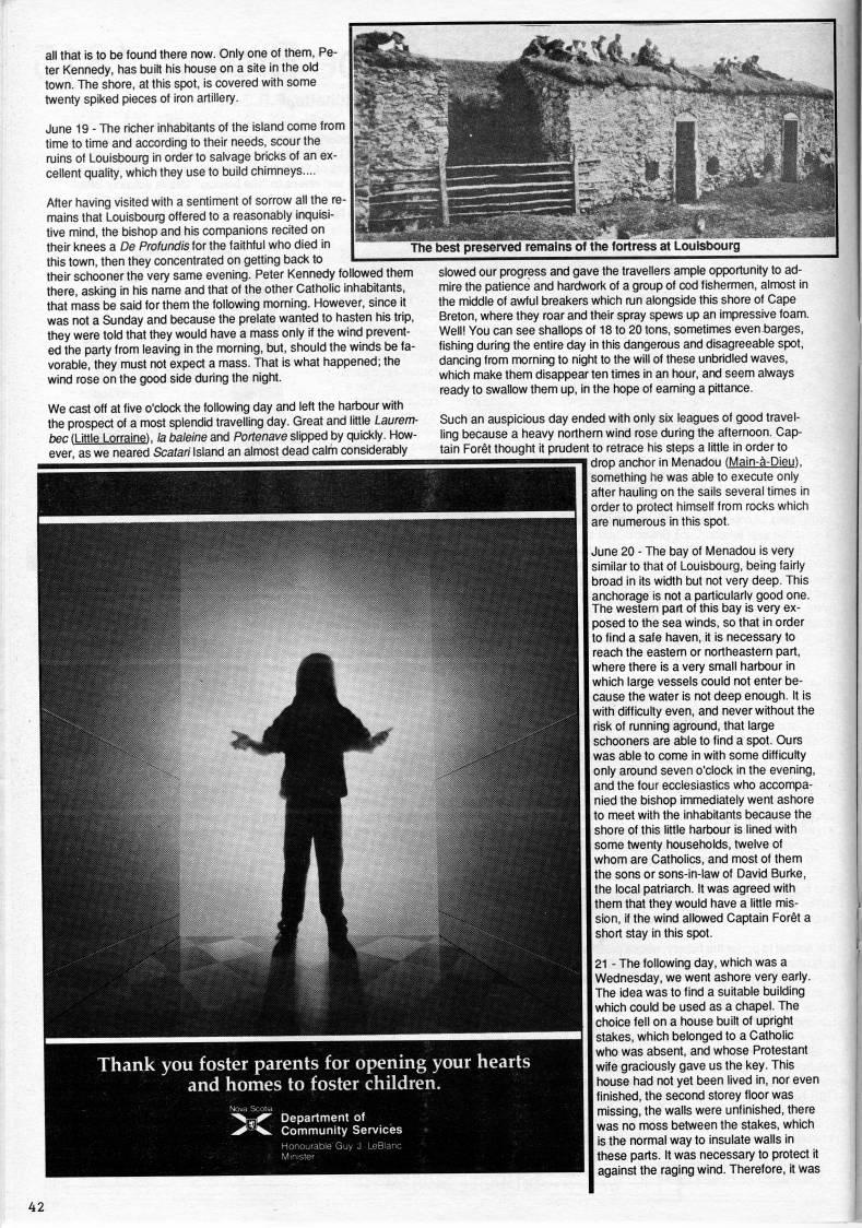 Published by Ronald Caplan on 1990/8/1 (364 reads)all that is to be found there now. Only one of them, Pe? ter Kennedy, has built his house on a site in the old town. The shore, at this spot, is covered with some twenty spiked pieces of iron artillery. June 19 - The richer inhabitants of the island come from time to time and according to their needs, scour the ruins of Louisbourg in order to salvage bricks of an ex? cellent quality, which they use to build chimneys.... After having visited with a sentiment of sorrow all the re? mains that Louisbourg offered to a reasonably inquisi? tive mind, the bishop and his companions recited on their knees a De Profundis for the faithful who died in this town, then they concentrated on getting back to their schooner the very same evening. Peter Kennedy followed them there, asking in his name and that of the other Catholic inhabitants, that mass be said for them the following morning. However, since it was not a Sunday and because the prelate wanted to hasten his trip, they were told that they would have a mass only if the wind prevent? ed the party from leaving in the morning, but, should the winds be fa? vorable, they must not expect a mass. That is what happened; the wind rose on the good side during the night. We cast off at five o'clock the following day and left the harbour with the prospect of a most splendid travelling day. Great and little Laurem- bec (Little Lorraine), /a baleine and Portenave slipped by quickly. How? ever, as we neared Scatari Island an almost dead calm considerably Thank you foster parents for opening your hearts and homes to foster children. Department of Community Services slowed our progress and gave the travellers ample opportunity to ad? mire the patience and hardwork of a group of cod fishermen, almost in the middle of awful breakers which run alongside this shore of Cape Breton, where they roar and their spray spews up an impressive foam. Well! You can see shallops of 18 to 20 tons, sometimes evenbarges, fishing during the entire day in this dangerous and disagreeable spot, dancing from morning to night to the will of these unbridled waves, which make them disappear ten times in an hour, and seem always ready to swallow them up, in the hope of earning a pittance. Such an auspicious day ended with only six leagues of good travel? ling because a heavy northern wind rose during the afternoon. Cap? tain Foret thought it prudent to retrace his steps a little in order to drop anchor in Menadou (Main-a-Dieu). something he was able to execute only after hauling on the sails several times in order to protect himself from rocks which are numerous in this spot. June 20 - The bay of Menadou is very similar to that of Louisbourg, being fairly broad in its width but not very deep. This anchorage is not a particularly good one. The western part of this bay is very ex? posed to the sea winds, so that in order to find a safe haven, it is necessary to reach the eastern or northeastern part, where there is a very small harbour in which large vessels could not enter be? cause the water is not deep enough. It is with difficulty even, and never without the risk of running aground, that large schooners are able to find a spot. Ours was able to come in with some difficulty only around seven o'clock in the evening, and the four ecclesiastics who accompa? nied the bishop immediately went ashore to meet with the inhabitants because the shore of this little harbour is lined with some twenty households, twelve of whom are Catholics, and most of them the sons or sons-in-law of David Burke, the local patriarch. It was agreed with them that they would have a little mis? sion, if the wind allowed Captain Foret a short stay in this spot. 21 - The following day, which was a Wednesday, we went ashore very early. The idea was to find a suitable building which could be used as a chapel. The choice fell on a house built of upright stakes, which belonged to a Catholic who was absent, and whose Protestant wife graciously gave us the key. This house had not yet been lived in, nor even finished, the second storey floor was missing, the walls were unfinished, there was no moss between the stakes, which is the normal way to insulate walls in these parts, it was necessary to protect it against the raging wind. Therefore, it was