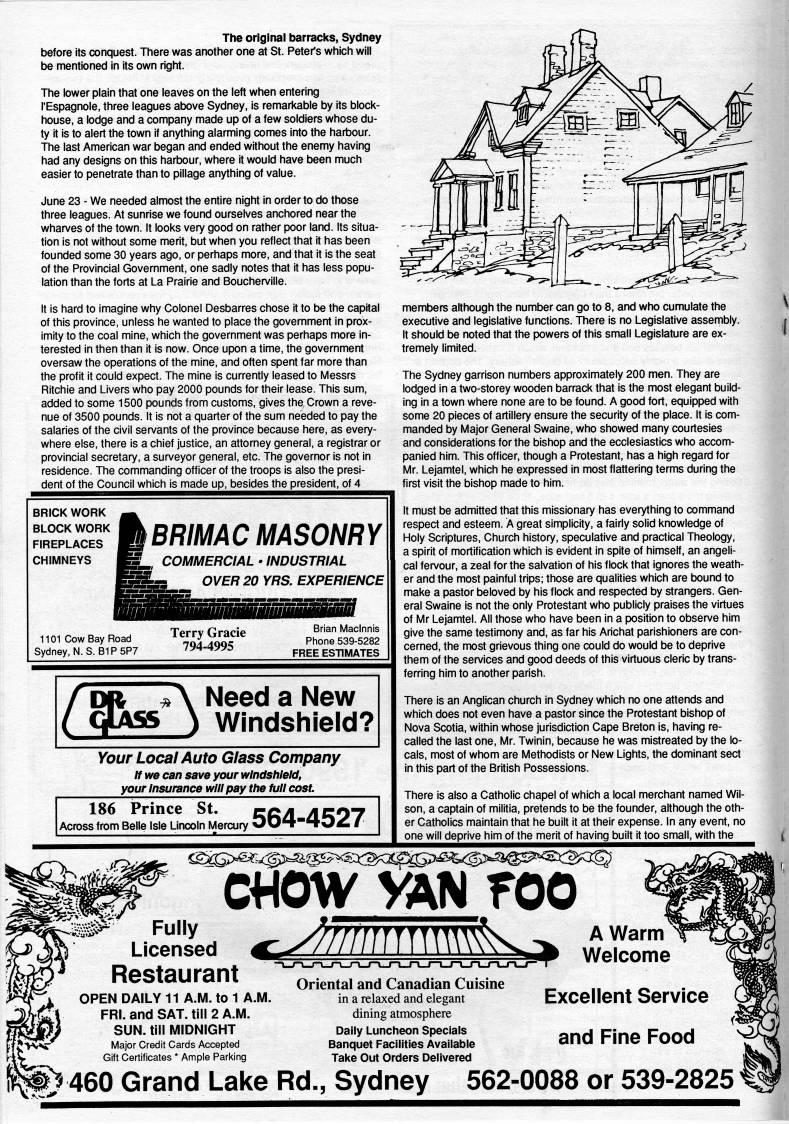 Published by Ronald Caplan on 1990/8/1 (279 reads)The original barracks, Sydney before its conquest. There was another one at St. Peter's which will be mentioned in its own right. The lower plain that one leaves on the left when entering I'Espagnole, three leagues above Sydney, is remarkable by its block? house, a lodge and a company made up of a few soldiers whose du? ty it is to alert the town if anything alarming comes into the harbour. The last American war began and ended without the enemy having had any designs on this harbour, where it would have been much easier to penetrate than to pillage anything of value. June 23 - We needed almost the entire night in order to do those three leagues. At sunrise we found ourselves anchored near the wharves of the town. It looks very good on rather poor land. Its situa? tion is not without some merit, but when you reflect that it has been founded some 30 years ago, or perhaps more, and that it is the seat of the Provincial Government, one sadly notes that it has less popu? lation than the forts at La Prairie and Boucherville. It is hard to imagine why Colonel Desbarres chose it to be the capital of this province, unless he wanted to place the government in prox? imity to the coal mine, which the government was perhaps more in? terested in then than it is now. Once upon a time, the government oversaw the operations of the mine, and often spent far more than the profit it could expect. The mine is currently leased to Messrs Ritchie and Livers who pay 2000 pounds for their lease. This sum, added to some 1500 pounds from customs, gives the Crown a reve? nue of 3500 pounds. It is not a quarter of the sum needed to pay the salaries of the civil servants of the province because here, as every? where else, there is a chief justice, an attorney general, a registrar or provincial secretary, a surveyor general, etc. The governor is not in residence. The commanding officer of the troops is also the presi- dent of the Council which is made up, besides the president, of 4 BRICK WORK BLOCK WORK FIREPLACES CHIMNEYS 1101 Cow Bay Road Sydney, N.S. BIP 5P7 BRIMAC MASONRY COMMERCIAL • INDUSTRIAL OVER 20 YRS. EXPERIENCE Brian Maclnnis Phone 539-5282 FREE ESTIMATES ('' Need a New Windshield? Your Local Auto Glass Company If we can save your windshield, your Insurance will pay the lull cost. 186 Prince St. Across from Belle Isle Lincoln Mercury 564-4527 members although the number can go to 8, and who cumulate the executive and legislative functions. There is no Legislative assembly. It should be noted that the powers of this small Legislature are ex? tremely limited. The Sydney garrison numbers approximately 200 men. They are lodged in a two-storey wooden barrack that is the most elegant build? ing in a town where none are to be found. A good fort, equipped with some 20 pieces of artillery ensure the security of the place. It is com? manded by Major General Swaine, who showed many courtesies and considerations for the bishop and the ecclesiastics who accom? panied him. This officer, though a Protestant, has a high regard for Mr. Lejamtel, which he expressed in most flattering terms during the first visit the bishop made to him. It must be admitted that this missionary has everything to command respect and esteem. A great simplicity, a fairly solid knowledge of Holy Scriptures, Church history, speculative and practical Theology, a spirit of mortification which is evident in spite of himself, an angeli? ca! fervour, a zeal for the salvation of his flock that ignores the weath? er and the most painful trips; those are qualities which are bound to make a pastor beloved by his flock and respected by strangers. Gen? eral Swaine is not the only Protestant who publicly praises the virtues of Mr Lejamtel. All those who have been in a position to observe him give the same testimony and, as far his Arichat parishioners are con? cerned, the nnost grievous thing one could do would be to deprive them of the services and good deeds of this virtuous cleric by trans? ferring him to another parish. There is an Anglican church in Sydney which no one attends and which does not even have a pastor since the Protestant bishop of Nova Scotia, within whose jurisdiction Cape Breton is, having re? called the last one, Mr. Twinin, because he was mistreated by the lo? cals, most of whom are Methodists or New Lights, the dominant sect in this part of the British Possessions. There is also a Catholic chapel of which a local merchant named Wil? son, a captain of militia, pretends to be the founder, although the oth? er Catholics maintain that he built it at their expense. In any event, no one will deprive him of the merit of having built it too small, with the wow VAN f 00 Restaurant A Warm Welcome OPEN DAILY 11 A.M. to 1 A.M. FRI. and SAT. till 2 A.M. SUN. till MIDNIGHT Major Credit Cards Accepted Gift Certificates * Ample Parking Oriental and Canadian Cuisine in a relaxed and elegant dining atmosphere Daily Luncheon Specials Banquet Facilities Available Take Out Orders Delivered Excellent Service and Fine Food 460 Grand Lake Rd., Sydney 562-0088 or 539-2825