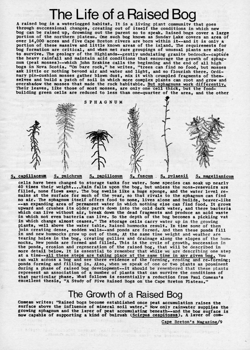 Published by Ronald Caplan on 1975/12/1 (792 reads)The Life of a Raised Bog A raised bog is a waterlogged habitat. It is a living plant community that goes through successional changes, creating out of itself the conditions in which new bog can be raised up, drowning out the parent so to speak. Raised bogs cover a large portion of the northern plateau. One such bog known as Sunday Lake covers an area of over 14,000 acres and five Cape Breton rivers are born within it • and it is only a portion of these massive and little known areas of the island. The requirements for bog formation are critical, and vrtien raet rare groupings of unusual plants are able to survive* The geology of the Highlands • gently undulating granite bedrock • capture the heavy rainfall and maintain acid conditions that encourage the growth of sphag? num (peat mosses) • which John Erskine calls the beginning and the end of all high bogs in Nova Scotia. "On bare rock," he writes, "trees can find no food, but mosses ask little or nothing beyond air and water and light, and so flourish there. Ordi? nary pin-cushion mosses gather blown dust, mix it with crumpled fragments of them? selves and build a patch of soil in which more complex plants can root and grow and overshadow the mosses that made the rock habitable. But sphagnums work differently. Their leaves, like those of most mosses, are only one cell thick, but the food- building green cells are reduced to less than one-quarter of the area, and the other H A G N U M S. capillaceum S* pulchrura S* papillosum S. pvlaesii S. magellanicura cells have been changed to storage tanks for water* Some species can soak up nearly 40 times their weight*.**Rain falls upon the bog, but unless the moss-resevoirs are filled, none flows away. The bog swells like a huge sponge, and the water level re? mains at the surface for much of the year, so that rivals to the sphagnum can find no air. The sphagnum itself offers food to none, lives alone and builds, beaver-like • an expanding area of permanent water in which nothing else can find food. It grows upward and crushes its older parts down into the cold dark water, and there bacteria which can live without air, break down the dead fragments and produce an acid waste in vrihiich not even bacteria can live. So the depth of the bog becomes a pickling vat in which change almost ceases*" The storage cells carry water up in the growing plants, well above the water table. Raised hummocks result. In time some of them join creating dense, sodden walls • and ponds are formed. And then these ponds fill in and new hummocks grow up out of them. At the same time weight and weather are tearing holes in the bog, creating gullies and drainage along the slopes of the hum? mocks. New ponds are formed and filled. This is the cvcle of growth, succession in the ponds, erosion and regeneration of the raised bog, that will be described in more detail below. It is essential to remember that while we are describing one step at a time • all these steps are taking place at the same time in any given bog. You can walk across a bog and see there evidence of the forming, eroding and re-torming; ponds forming and filling in. Also, when we speak of one or two plants as prominent during a phase of raised bog development • it should be remembered that these plants represent an association of a number of plants that can survive the conditions of that particular phase* What follovre is essentially a reduction from Paul Comeau's excellent thesis, "A Study of Five Raised Bogs on the Cape Breton Plateau*" The Growth of a Raised Bog Comeau writes: "Raised bogs become established once peat accumulation raises the surface above the influence of mineral soil water*" Now only rainwater supplies the growing sphagnum and the layer of peat accumulating beneath • and the bog surface is now capable of supporting a kind of bulrush (Scirpus cespitosus)* A layer of cora- Cape Breton's Mafiazine/9