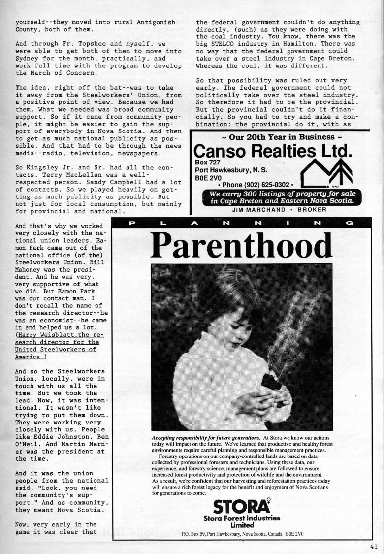 Published by Ronald Caplan on 1991/8/1 (228 reads)yourself--they moved into rural Antigonish County, both of them. And through Fr. Topshee and myself, we were able to get both of them to move into Sydney for the month, practically, and work full time with the program to develop the March of Concern. The idea, right off the bat--was to take it away from the Steelworkers' Union, from a positive point of view. Because we had them. What we needed was broad community support. So if it came from community peo? ple, it might be easier to gain the sup? port of everybody in Nova Scotia. And then to get as much national publicity as pos? sible. And that had to be through the news media--radio, television, newspapers. So Kingsley Jr. and Sr. had all the con? tacts. Terry MacLellan was a well- respected person. Sandy Campbell had a lot of contacts. So we played heavily on get? ting as much publicity as possible. But not just for local consumption, but mainly for provincial and national. the federal government couldn't do anything directly, (such) as they were doing with the coal industry. You know, there was the big STELCO industry in Hamilton. There was no way that the federal government could take over a steel industry in Cape Breton. Whereas the coal, it was different. So that possibility was ruled out very early. The federal government could not politically take over the steel industry. So therefore it had to be the provincial. But the provincial couldn't do it finan? cially. So you had to try and make a com? bination: the provincial do it, with as ~ Our 20th Year in Business • Canso Realties Ltd Box 727 Port Hawkesbury, N. S. BOE 2V0 . Phone (902) 625-0302 • We carry 300 listings of property for sale in Cape Breton and Eastern Nova Scotia. JIM MARCHAND And that's why we worked very closely with the na? tional union leaders. Ea- mon Park came out of the national office (of the) Steelworkers Union. Bill Mahoney was the presi? dent. And he was very, very supportive of what we did. But Eamon Park was our contact man. I don't recall the name of the research director--he was an economist--he came in and helped us a lot. (Harry Weisblatt.the re? search director for the United Steelworkers of America.) And so the Steelworkers Union, locally, were in touch with us all the time. But we took the lead. Now, it was inten? tional. It wasn't like trying to put them down. They were working very closely with us. People like Eddie Johnston, Ben O'Neil. And Martin Mern? er was the president at the time. And it was the union people from the national said, "Look, you need the community's sup? port." And as community, they meant Nova Scotia. Now, very early in the game it was clear that Parenthood Accepting responsibility for future generations. At Stora we know our actions today will impact on the future. We've learned that productive and healthy forest environments require careful planning and responsible management practices. Forestry operations on our company-controlled lands are based on data collected by professional foresters and technicians. Using these data, our experience, and forestry science, management plans are followed to ensure increased forest productivity and protection of wildlife and the environment. As a result, we're confident that our harvesting and reforestation practices today will ensure a rich forest legacy for the benefit and enjoyment of Nova Scotians for generations to come. STORA Stora Forest Industries P.O. Box 59, Port Hawkesbury, Nova Scotia, Canada BOE 2V0