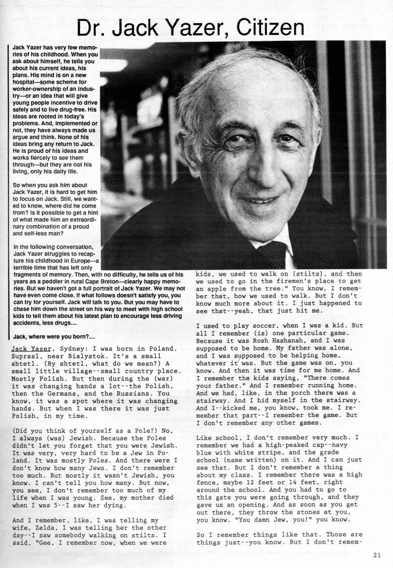 Published by Ronald Caplan on 1992/1/1 (1339 reads)Dr. Jack Yazer, Citizen Jack Yazer has very few memo? ries of his childhood. When you ask about himself, he tells you about his current ideas, his plans. His mind is on a new hospital • some scheme for worker-ownership of an indus? try • or an idea that will give young people incentive to drive safely and to live drug-free. His ideas are rooted in today's problems. And, implemented or | not, they have always made us argue and think. None of his ideas bring any return to Jack. He is proud of his ideas and works fiercely to see them through • but they are not his living, only his daily life. So when you ask him about Jack Yazer, it is hard to get him to focus on Jack. Still, we want? ed to know, where did he come from? Is it possible to get a hint of what made him an extraordi? nary combination of a proud and self-less man? In the following conversation, Jack Yazer struggles to recap? ture his childhood in Europe • a terrible time that has left only fragments of memory. Then, with no difficulty, he tells us of his years as a peddler in rural Cape Breton • clearly happy memo? ries. But we haven't got a full portrait of Jack Yazer. We may not have even come close. If what follows doesn't satisfy you, you can try for yourself. Jack will talk to you. But you may have to chase him down the street on his way to meet with high school kids to tell them about his latest plan to encourage less driving accidents, less drugs.... Jack, where were you born?.... Jack Yazer. Sydney: I was born in Poland. Suprasl, near Bialystok. It's a small shtetl. (By shtetl, what do we mean?) A small little village--small country place. Mostly Polish. But then during the (war) it was changing hands a lot--the Polish, then the Germans, and the Russians. You know, it was a spot where it was changing hands. But when I was there it was just Polish, in my time. (Did you think of yourself as a Pole?) No, I always (was) Jewish. Because the Poles didn't let you forget that you were Jewish. It was very, very hard to be a Jew in Po? land. It was mostly Poles. And there were I don't know how many Jews. I don't remember too much. But mostly it wasn't Jewish, you know. I can't tell you how many. But now, you see, I don't remember too much of my life when I was young. See, my mother died when I was 5--I saw her dying. And I remember, like, I was telling my wife, Zelda, I was telling her the other day--I saw somebody walking on stilts. I said, "Gee, I remember now, when we were kids, we used to walk on (stilts), and then we used to go in the firemen's place to get an apple from the tree." You know, I remem? ber that, how we used to walk. But I don't know much more about it. I just happened to see that--yeah, that just hit me. I used to play soccer, when I was a kid. But all I remember (is) one particular game. Because it was Rosh Hashanah, and I was supposed to be home. My father was alone, and I was supposed to be helping home, whatever it' was. But the game was on, you know. And then it was time for me home. And I remember the kids saying, "There comes your father," And I remember running home. And we had, like, in the porch there was a stairway. And I hid myself in the stairway. And I--kicked me, you know, took me. I re? member that part--I remember the game. But I don't remember any other games. Like school, I don't remember very much. I remember we had a high-peaked cap--navy blue with white stripe, and the grade school (name written) on it. And I can just see that. But I don't remember a thing about my class. I remember there was a high fence, maybe 12 feet or 14 feet, right around the school. And you had to go to this gate you were going through, and they gave us an opening. And as soon as you get out there, they throw the stones at you, you know. "You damn Jew, you!" you know. So I remember things like that. Those are things just--you know. But I don't remem-