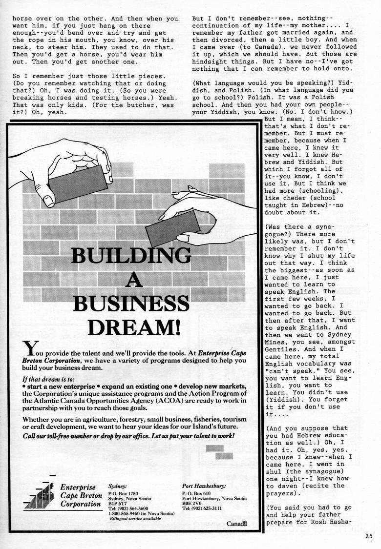 Published by Ronald Caplan on 1992/1/1 (476 reads)horse over on the other. And then when you want him, if you just hang on there enough--you'd bend over and try and get the rope in his mouth, you know, over his neck, to steer him. They used to do that. Then you'd get a horse, you'd wear him out. Then you'd get another one. So I remember just those little pieces. (Do you remember watching that or doing that?) Oh, I was doing it. (So you were breaking horses and testing horses.) Yeah. That was only kids. (For the butcher, was it?) Oh, yeah. BUILDING A BUSINESS DREAM! Y Lou provide the talent and we'll provide the tools. At Enterprise Cape Breton Corporation, we have a variety of programs designed to help you build your business dream. If that dream is to: * start a new enterprise • expand an existing one • develop new markets, the Corporation's unique assistance programs and the Action Program of the Atlantic Canada Opportunities Agency (ACOA) are ready to work in partnership with you to reach those goals. Whether you are in agriculture, forestry, small business, fisheries, tourism or craft development, we want to hear your ideas for our Island's future. CaU our toll-free number or drop by our office. Let us pit your talent to work! |||P' Enterprise ||; Cape Breton "'' Corporation Sydney: P.O. Box 1750 Sydney, Nova Scotia BIP 6T7 Tel: (902) 564-3600 1-800-565-9460 (in Nova Scotia) Bilingual service available Port Hawkesbury: P. O. Box 610 Port Hawkesbury, Nova Scotia BOE 2V0 Tel: (902) 625-3111 But I don't remember--see, nothing-- continuation of my life--my mother.... I remember my father got married again, and then divorced, then a little boy. And when I came over (to Canada), we never followed it up, which we should have. But those are hindsight things. But I have no--I've got nothing that I can remember to hold onto. (What language would you be speaking?) Yid? dish, and Polish. (In what language did you go to school?) Polish. It was a Polish school. And then you had your own people-- your Yiddish, you know. (No, I don't know.) • But I mean, I think-- that's what I don't re? member. But I must re? member, because when I came here, I knew it very well. I knew He? brew and Yiddish. But which I forgot all of --you know, I don't I use it. But I think we had more (schooling), like cheder (school taught in Hebrew)--no doubt about it. (Was there a syna? gogue?) There more likely was, but I don't remember it. I don't know why I shut my life out that way. I think the biggest--as soon as I came here, I just wanted to learn to speak English. The first few weeks, I wanted to go back. I wanted to go back. But then after that, I want to speak English. And then we went to Sydney Mines, you see, amongst Gentiles. And when I came here, my total English vocabulary was "can't speak." You see, you want to learn Eng? lish, you want to learn. You didn't use (Yiddish). You forget it if you don't use it... . (And you suppose that you had Hebrew educa? tion as well.) Oh, I had it. Oh, yes, yes, because I knew--when I came here, I went in shul (the synagogue) one night--I knew how to daven (recite the prayers). (You said you had to go and help your father prepare for Rosh Hasha- Canada