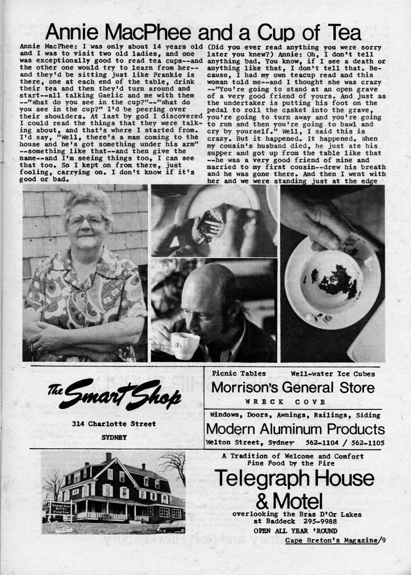 Published by Ronald Caplan on 1976/6/1 (809 reads)Annie MacPhee and a Cud of Tea Annie MacPhee: I was only about 14 years old and I was to visit two old ladies, and one was exceptionally good to read tea cups • and the other one would try to learn from her • and they'd be sitting just like Frankie is there, one at each end of the table, drink their tea and then they'd turn around and start • all talking Gaelic and me with them • "What do you see in the cup?" • "What do you see in the cup?" I'd be peering over their shoulders. At last by god I discovered I could read the things that they were talk? ing about, and that's where I started from. I'd say, "Well, there's a man coming to the house and he's got something under his arm" • something like that • and then give the name • and I'm seeing things too, I can see that too. So I kept on from there, just fooling, carrying on. I don't know if it's good or bad. (Did you ever read anything you were sorry later you knew?) Annie; Oh, I don't tell anything bad. You know, if I see a death or anything like that, I don't tell that. Be? cause, I had my own teacup read and this woman told me • and I thought she was crazy • "You're going to stand at an open grave of a very good friend of yours. And just as the undertaker is putting his foot on the pedal to roll the casket into the grave, you're going to turn away and you're going to run and then you're going to bawl and cry by yourself." Well, I said this is crazy. But it happened. It happened. When my cousin's husband died, he just ate his supper and got up from the table like that • he was a very good friend of mine and married to my first cousin • drew his breath and he was gone there. And then I went with her and we were standing ''ma/itl'ka' 314 Charlotte Street SYDNEY Picnic Tables Well-water Ice Cubes Morrison's General Store WRECK COVE Windows, Doors, Awnings, Railings, Siding Modern Aluminum Products tWlton Street, Sydner 562-1104 / 562-1105 A Tradition of Welcome and Comfort Pine Pood by the Fire Telegraph House & Motel overlooking the Bras D'Or Lakes at Baddeck 295-9988 OPEN ALL YEAR 'ROUND Cape Breton's Magazine/9