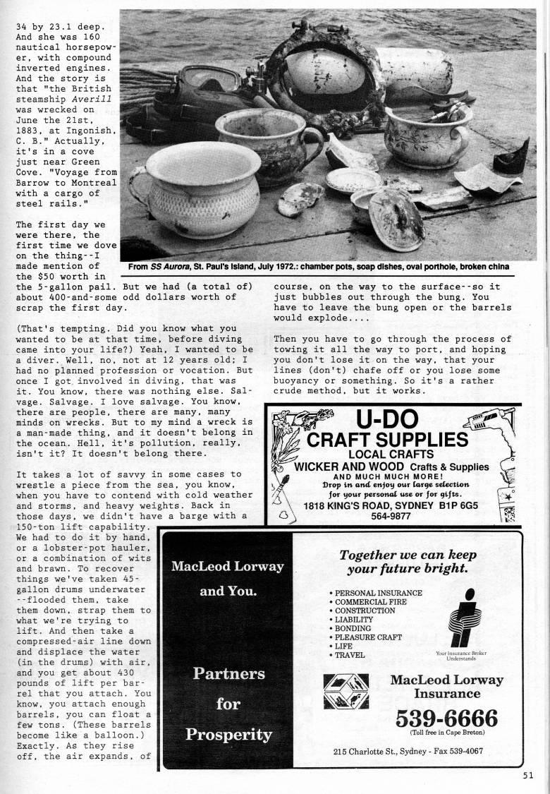 Published by Ronald Caplan on 1992/1/1 (242 reads)34 by 23.1 deep. And she was 160 nautical horsepow? er, with compound inverted engines. And the story is that "the British steamship Averill was wrecked on June the 21st, 1883, at Ingonish, C. B." Actually, it's in a cove just near Green Cove. "Voyage from Barrow to Montreal with a cargo of steel rails." The first day we were there, the first time we dove on the thing--I made mention of the $5 0 worth in the 5-gallon pail. But we had (a total of) about 400-and-some odd dollars worth of scrap the first day. (That's tempting. Did you know what you wanted to be at that time, before diving came into your life?) Yeah, I wanted to be a diver. Well, no, not at 12 years old; I had no planned profession or vocation. But once I got, involved in diving, that was it. You know, there was nothing else. Sal? vage. Salvage. I love salvage. You know, there are people, there are many, many minds on wrecks. But to my mind a wreck is a man-made thing, and it doesn't belong in the ocean,. Hell, it's pollution, really, isn't it? It doesn't belong there. It takes a lot of savvy in some cases to wrestle a piece from the sea, you know, when you have to contend with cold weather and storms, and heavy weights. Back in those days, we didn't have a barge with a 150-ton lift capability. We had to do it by hand, or a lobster-pot hauler, or a combination of wits and brawn. To recover things we've taken 45- gallon drums underwater --flooded them, take them down, strap them to what we're trying to lift. And then take a compressed-air line down and displace the water (in the drums) with air, and you get about 430 pounds of lift per bar? rel that you attach. You know, you attach enough barrels, you can float a few tons. (These barrels become like a balloon.) Exactly. As they rise off, the air expands, of From SS Aurora, St. Paul's Island, July 1972.: chamber pots, soap dishes, oval porthole, broken china course, on the way to the surface--so it just bubbles out through the bung. You have to leave the. bung open or the barrels would explode.... Then you have to go through the process of towing it all the way to port, and hoping you don't lose it on the way, that your lines (don't) chafe off or you lose some buoyancy or something. So it's a rather crude method, but it works. U-DO CRAFT SUPPLIES LOCAL CRAFTS WICKER AND WOOD Crafts & Supplies AND MUCH MUCH MORE! Drop In and enjoi) our large selection jor your personal tse or Jor gijts. y w 1818 KING'S ROAD, SYDNEY B1P6G5 <3' 564-9877 MacLeod Lorway and You. Partners Prosperity Together we can keep your future bright • PERSONAL INSURANCE • COMMERCIAL FIRE • CONSTRUCTION • LIABILITY • BONDING • PLEASURE CRAFT LIFE • TRAVEL '' MacLeod Lorway Insurance 539-6666 (Toll free in Cape Breton) 215 Charlotte St., Sydney - Fax 539-4067