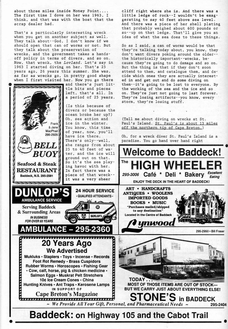 Published by Ronald Caplan on 1992/1/1 (201 reads)about three miles inside Money Point.... The first time I dove on her was 1963, I think, and that was with the boat that the scrap dealer had. That's a particularly interesting wreck when you get on another subject as well. They talk about--God, I don't know if we should open that can of worms or not. But they talk about the preservation of wrecks, and the government takes a hands- off policy in terms of divers, and so on. Now, that wreck, the Lovland. Let's say in 1963 I started diving on her. That's 25 years ago. 26 years this summer. She was, as far as wrecks go, in pretty good shape when I first visited her. Now you go there and there's just lit? tle bits and pieces left, that's all. In a period of 25 years. (Is this because of divers or because the ocean broke her up?) Oh, sea action and ice in the winter. You know, this,time of year, now. you'll have ice there. There's only--well, she ranges from about 25 to 40 feet of wa? ter, and the ice will ground out on that. So it's the sea play? ing havoc with her. In fact there was a piece of that wreck-- it was a very sheer TJXBELL BUOYl H Seafood & Steak ' ; RESTAURANT I Baddeck, N.S. 295-2581 cliff right where she is. And there was a little ledge of rock--I wouldn't be exag? gerating to say 40 feet above sea level. And there was a piece of her shell plating that probably weighed about 600 pounds or so--up on that ledge. That'll give you an idea of what the sea does to these things. So as I said, a can of worms would be that they're talking today about, you know, they don't want divers poking around the older-- the historically important--wrecks, be? cause they're going to do damage and so on. But the thing is that if they don't soon attend to them, and catalogue them, and de? cide which ones they are actually interest? ed in and get out and do some diving on them--it's going to be lost to everyone. By the working of the sea and the ice and so on. They're just not going to last forever. They're losing artifacts--you know, every storm, they're losing stuff. (Tell me about diving on wrecks at St. Paul's Island. St. Paul's is about 13 miles off the northern tip of Cape Breton.) Oh, for a wreck diver St. Paul's Island is a paradise. You go hand over hand right DUNLOP'S AMBULANCE SERVICE Serving Baddeck & Surrounding Areas IN BUSINESS FOR OVER 65 YEARS 24 HOUR SERVICE • QUALIFIED AHENDANTS. AMBULANCE - 295-2360 Welcome to Baddeck! The HIGH WHEELER 295-3006 Cafe * Deli * Bakery %l%f ENJOY THE DECK IN THE HEART OF BADDECK! ART • HANDCRAFTS ANTIQUES • WOOLENS IMPORTED GOODS BOOKS • MUSIC "Purchases mailed/shipped to any destination" Located in the Centre of Baddeck /9ynt4fooel 295-2950 • Bill Fraser yi?i?i?i?ififgggi?i?i?i?i?i?i?gggi?i?i?i?i?i?i?i?i?i?i?gi?i?i?i?' 20 Years Ago We Advertised Mukluks • Staplers • Toys • Incense • Records Foot Rot Remedy • Brass Cuspidors Rubber Worms • Horoscopes • Fishing Gear • Cow, calf, horse, pig & chicken medicine • Salmon Eggs • Muskrat Pelt Stretchers 100 Ice Cream Cones • China Hunting Knives • Ant Traps * Kerosene Lamps IN SUPPORT OF Cape Breton's Magazine TODAYS MOST OF THOSE ITEMS ARE OUT OF STOCK- BUT WE CARRY JUST ABOUT EVERYTHING ELSE! STONE'S in BADDECK ~ We Provide All Your Gift, Personal, and Pharmaceutical Needs 295-2404 Baddeck: on Highway 105 and the Cabot Trail