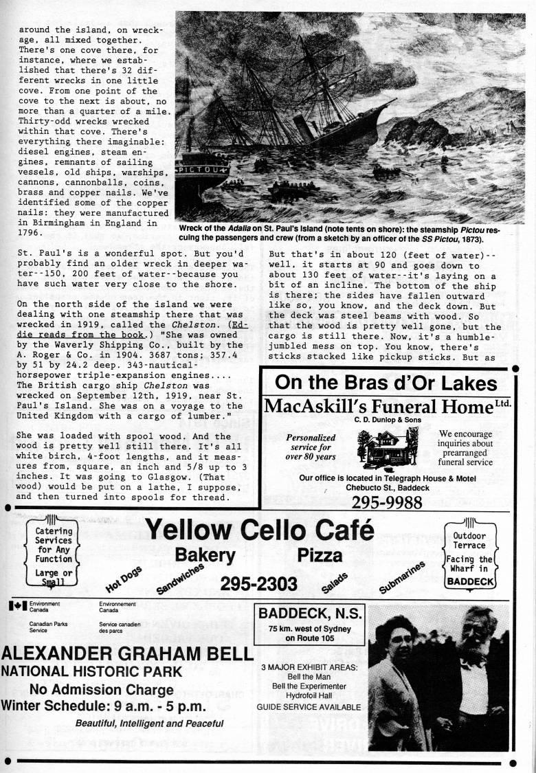 Published by Ronald Caplan on 1992/1/1 (197 reads)w-'''S around the island, on wreck? age, all mixed together. There's one cove there, for instance, where we estab? lished that there's 32 dif? ferent wrecks in one little cove. From one point of the cove to the next is about, no more than a quarter of a mile. Thirty-odd wrecks wrecked within that cove. There's everything there imaginable: diesel engines, steam en? gines, remnants of sailing vessels, old ships, warships, cannons, cannonballs, coins, brass and copper nails. We've identified some of the copper nails: they were manufactured in Birmingham in England in 1796. Wreck of the Adalla on St. Paul's Island (note tents on shore): the steamship Pictou res? cuing the passengers and crew (from a sketch by an officer of the 55 Pictou, 1873). St. Paul's is a wonderful spot. But you'd probably find an older wreck in deeper wa? ter- -150, 200 feet of water--because you have such water very close to the shore. On the north side of the island we were dealing with one steamship there that was wrecked in 1919, called the Chelston. (Ed' die reads from the book.) "She was owned by the Waverly Shipping Co., built by the A. Roger & Co. in 1904. 3687 tons; 357.4 by 51 by 24.2 deep. 343-nautical- horsepower triple-expansion engines.... The British cargo ship Chelston was wrecked on September 12th, 1919, near St. Paul's Island. She was on a voyage to the United Kingdom with a cargo of lumber." She was loaded with spool wood. And the wood is pretty well still there. It's all white birch, 4-foot lengths, and it meas? ures from, square, an inch and 5/8 up to 3 inches. It was going to Glasgow. (That wood) would be put on a lathe, I suppose, and then turned into spools for thread. But that's in about 120 (feet of water)-- well, it starts at 90 and goes down to about 130 feet of water--it's laying on a bit of an incline. The bottom of the ship is there; the sides have fallen outward like so, you know, and the deck down. But the deck was steel beams with wood. So that the wood is pretty well gone, but the cargo is still there. Now, it's a humble- jumbled mess on top. You know, there's sticks stacked like pickup sticks. But as On the Bras d'Or Lakes MacAskiirs Funeral Home Ltd. C. D. Dunlop & Sons Personalized service for over 80 years We encourage inquiries about prearranged funeral service Our office is located in Telegraph House & Motel Chebucto St., Baddeck 295-9988 Yellow Cello Cafe Bakery Pizza >6* ''"' .''' 295-2303 c'' ??>' .'<' .''' Outdoor J Terrace l JFacing the! < Wharf in > [baddeck) l'Vc BADDECK, N.S. 75 km. west of Sydney on Route 105 ALEXANDER GRAHAIVI BELL NATIONAL HISTORIC PARK No Admission Charge Winter Schedule: 9 a.m. - 5 p.m. Beautiful, Intelligent and Peaceful 3 MAJOR EXHIBIT AREAS: Bell the Man Bell the Experimenter Hydrofoil Hall GUIDE SERVICE AVAILABLE