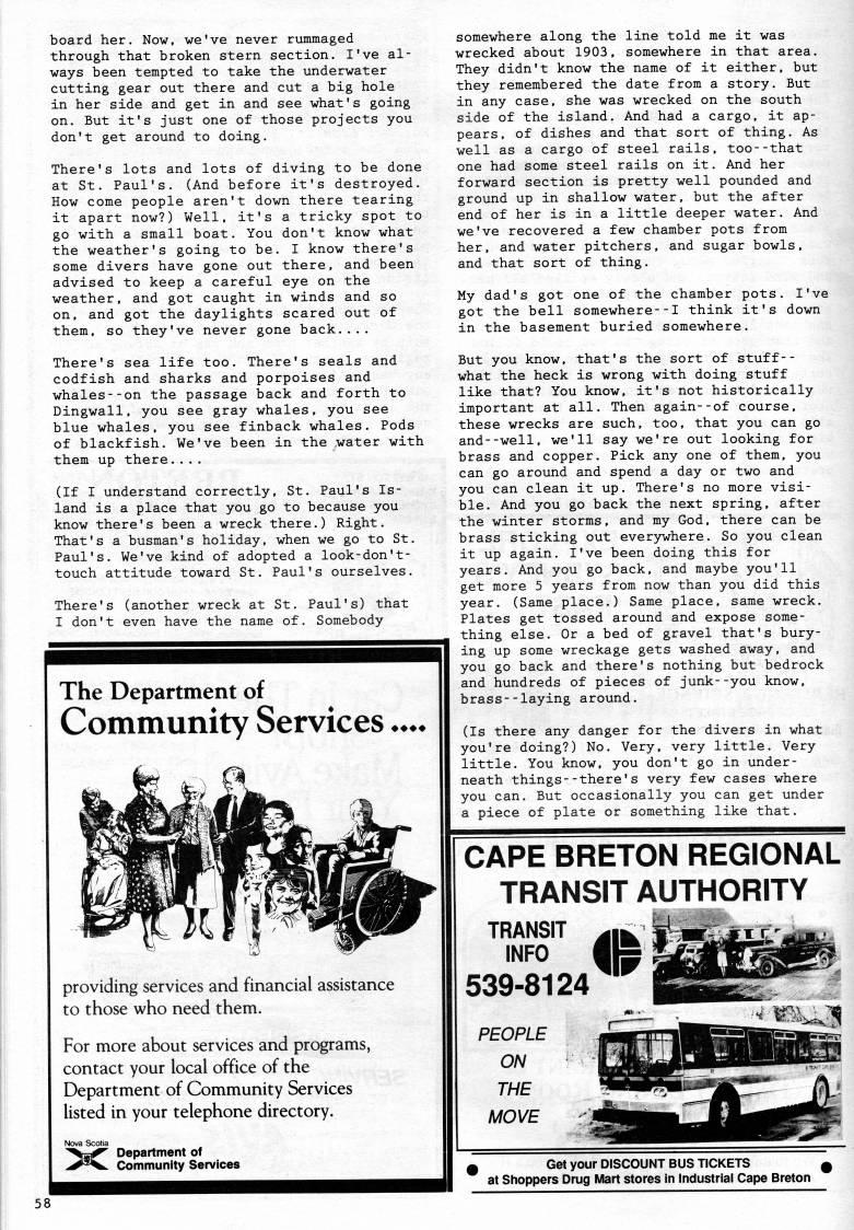 Published by Ronald Caplan on 1992/1/1 (203 reads)board her. Now, we've never rummaged through that broken stern section. I've al? ways been tempted to take the underwater cutting gear out there and cut a big hole in her side and get in and see what's going on. But it's just one of those projects you don't get around to doing. There's lots and lots of diving to be done at St. Paul's. (And before it's destroyed. How come people aren't down there tearing it apart now?) Well, it's a tricky spot to go with a small boat. You don't know what the weather's going to be. I know there's some divers have gone out there, and been advised to keep a careful eye on the weather, and got caught in winds and so on, and got the daylights scared out of them, so they've never gone back.... There's sea life too. There's seals and codfish and sharks and porpoises and whales--on the passage back and forth to Dingwall, you see gray whales, you see blue whales, you see finback whales. Pods of blackfish. We've been in the water with them up there.... (If I understand correctly, St. Paul's Is? land is a place that you go to because you know there's been a wreck there.) Right. That's a busman's holiday, when we go to St. Paul's. We've kind of adopted a look-don't- touch attitude toward St. Paul's ourselves. There's (another wreck at St. Paul's) that I don't even have the name of. Somebody The Department of Community Services providing services and financial assistance to those who need them. For more about services and programs, contact your local office of the Department of Community Services listed in your telephone directory. Department of Community Services somewhere along the line told me it was wrecked about 1903, somewhere in that area. They didn't know the name of it either, but they remembered the date from a story. But in any case, she was wrecked on the south side of the island. And had a cargo, it ap? pears, of dishes and that sort of thing. As well as a cargo of steel rails, too--that one had some steel rails on it. And her forward section is pretty well pounded and ground up in shallow water, but the after end of her is in a little deeper water. And we've recovered a few chamber pots from her, and water pitchers, and sugar bowls, and that sort of thing. My dad's got one of the chamber pots. I've got the bell somewhere--! think it's down in the basement buried somewhere. But you know, that's the sort of stuff-- what the heck is wrong with doing stuff like that? You know, it's not historically important at all. Then again--of course, these wrecks are such, too, that you can go and--well, we'll say we're out looking for brass and copper. Pick any one of them, you can go around and spend a day or two and you can clean it up. There's no more visi? ble. And you go back the next spring, after the winter storms, and my God, there can be brass sticking out everywhere. So you clean it up again, I've been doing this for years. And you go back, and maybe you'll get more 5 years from now than you did this year, (Same place.) Same place, same wreck. Plates get tossed around and expose some? thing else. Or a bed of gravel that's bury? ing up some wreckage gets washed away, and you go back and there's nothing but bedrock and hundreds of pieces of junk--you know, brass--laying around. (Is there any danger for the divers in what you're doing?) No. Very, very little. Very little. You know, you don't go in under? neath things--there's very few cases where you can. But occasionally you can get under a piece of plate or something like that. CAPE BRETON REGIONAL TRANSIT AUTHORITY TRANSIT INFO 539-8124 PEOPLE ON THE MOVE Get your DISCOUNT BUS TICKETS at Shoppers Drug Mart stores In Industrial Cape Breton 58