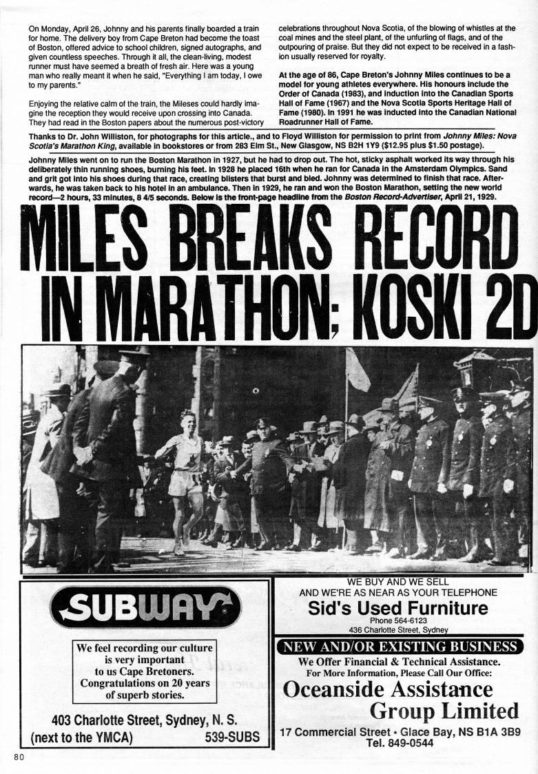 Published by Ronald Caplan on 1992/1/1 (236 reads)On Monday, April 26, Johnny and his parents finally boarded a train for home. The delivery boy from Cape Breton had become the toast of Boston, offered advice to school children, signed autographs, and given countless speeches. Through it all, the clean-living, modest runner must have seemed a breath of fresh air. Here was a young man who really meant it when he said, "Everything I am today, I owe to my parents." Enjoying the relative calm of the train, the Mileses could hardly ima? gine the reception they would receive upon crossing into Canada. They had read in the Boston papers about the numerous post-victory celebrations throughout Nova Scotia, of the blowing of whistles at the coal mines and the steel plant, of the unfurling of flags, and of the outpouring of praise. But they did not expect to be received in a fash? ion usually reserved for royalty. At the age of 86, Cape Breton's Johnny Miles continues to be a model for young athletes everywhere. His honours include the Order of Canada (1983), and induction into the Canadian Sports Hall of Fame (1967) and the Nova Scotia Sports Heritage Hail of Fame (1980). In 1991 he was inducted into the Canadian National Roadrunner Hall of Fame. Thanks to Dr. John Williston, for ptiotographs for this article., and to Floyd Williston for permission to print from Jotinny Miles: Nova Scotia's Marattion King, available in bookstores or from 283 Elm St., New Glasgow, NS B2H 1Y9 ($12.95 plus $1.50 postage). Johnny Miles went on to run the Boston Marathon in 1927, but he had to drop out. The hot, sticky asphalt worked its way through his deliberately thin running shoes, burning his feet. In 1928 he placed I6th when he ran for Canada in the Amsterdam Olympics. Sand I and grit got into his shoes during that race, creating blisters that burst and bled. Johnny was determined to finish that race. After- { wards, he was taken back to his hotel in an ambulance. Then in 1929, he ran and won the Boston Marathon, setting the new world record • 2 hours, 33 minutes, 8 4/5 seconds. Betow is the front-page headline from the Boston Record-Advertiser, April 21,1929. MILES BREAKS RECORD IN MARATHON; KOSKI 2D ?SUBUJ(1V' We feel recording our culture is very important to us Cape Bretoners. Congratulations on 20 years of superb stories. 403 Charlotte Street, Sydney, N. S. (nexttotheYMCA) 539-SUBS WE BUY AND WE SELL AND WE'RE AS NEAR AS YOUR TELEPHONE Sid's Used Furniture Phone 564-6123 ''''''436Chaj1ott'treet'ydi' NEW AND/OR EXISTING BUSINESS We Offer Financial & Technical Assistance. For More Information, Please Call Our Office: Oceanside Assistance Group Limited 17 Commercial Street • Glace Bay, NS B1A 389 Tel. 849-0544