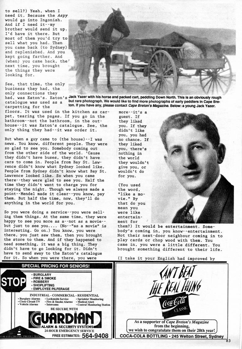 Published by Ronald Caplan on 1992/1/1 (195 reads)to sell?) Yeah, when I need it. Because the Aspy would go into Ingonish. And if I need it--my brother would send it up. w'., i,;',_'''''m-'"''' I' d have it there. But ', '.''l'.'.''''''y; -' "''W ../-'??*. most of them you'd try to-??'-"'??'''''''''"''*''*'' sell what you had. Then you came back (to Sydney) and replenished. And you kept going farther. And (when) you came back, the next time, you brought the things they were looking for. See, that time, the only business they had, the only connections they had, was Eaton' s . Eaton' s "'''' Yazer with his horse and packed cart, peddling Down North. This is an obviously rough catalogue was used as a but rare photograph. We would like to find more photographs of early peddlers in Cape Bre- carpetting for the ton. If you have any, please contact Cape Breton's Magazine. Below: a young Jack Yazer. floors. It was used in the kitchen as car? pet, tearing the pages. If you go in the bathroom--not the bathroom, in the out? house- -it was Eaton's catalogue. See, the only thing they had--it was order it. But when a guy came to (the house)--I was news. You know, different people. They were so glad to see you. Somebody coming out from the other side of the world. 'Cause they didn't have buses, they didn't have cars to come in. People from Bay St. Law? rence didn't know what Sydney looked like. People from Sydney didn't know what Bay St. Lawrence looked like. So when you came there--they were glad to see you. Half the time they didn't want to charge you for staying the night. Though we always made a point--Mendel made it clear--you know, pay them. But half the time, now, they'll do anything in the world for you. So you were doing a service--you were sell? ing them things. At the same time, they were happy to see you more as a--not as a movie-- but just to see you.... (No--"as a movie" is interesting. Go on.) You know, you were there, you just saw them, then you brought the store to them. And if they happened to need something, it was a big thing. They didn't have to go looking for it. Didn't have to send away to the Eaton's catalogue for it. So when you were there, you were more--It's a guest. If they liked you. If they didn't like you, you had no chance. If they liked you, there's nothing in the world they wouldn't give you, or wouldn't do for you. (You used the word, "like a mo? vie . " By that do you mean you were like entertain? ment for them?) It would be entertainment. Some? body's coming in, you know--entertainment. Not their next-door neighbour coming in to play cards or chop wood with them. You came in, you were a little different. You brought something different to their life. (I take it your English had improved by SPECIAL PRICING FOR SENIORS! • BURGLARY • FIRE & SMOKE • ROBBERY • SHOPLIFTING • EMPLOYEE PILFERAGE INDUSTRIAL - COMMERCIAL - RESIDENTIAL • Burglary Alarms • Locksmith Service • Sprinkler Monitoring • Close Circuit TV • Fire & Smoke Alarms • Me