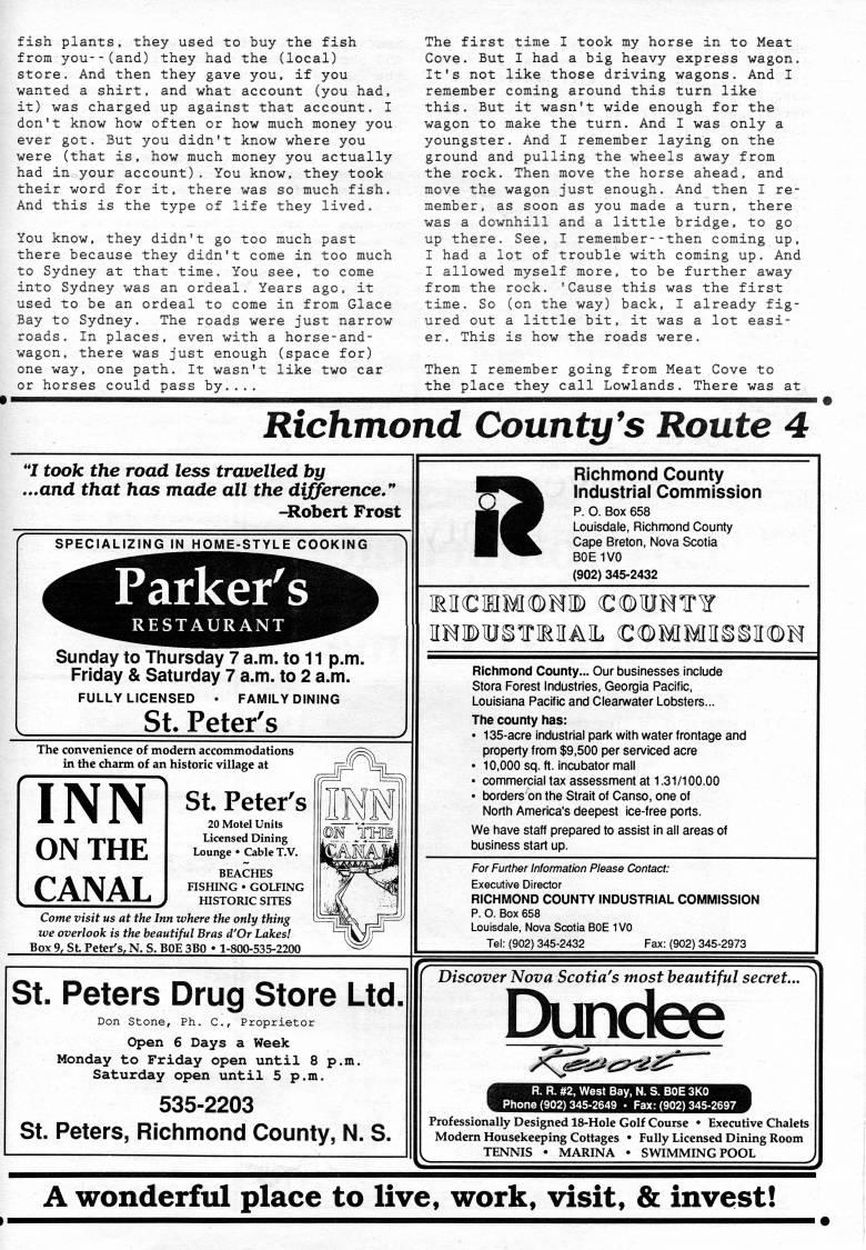 Published by Ronald Caplan on 1992/1/1 (180 reads)fish plants, they used to buy the fish from you--(and) they had the (local) store. And then they gave you, if you wanted a shirt, and what account (you had, it) was charged up against that account. I don't know how often or how much money you ever got. But you didn't know where you were (that is, how much money you actually had in your account). You know, they took their word for it, there was so much fish. And this is the type of life they lived. You know, they didn't go too much past there because they didn't come in too much to Sydney at that time. You see, to come into Sydney was an ordeal. Years ago. it used to be an ordeal to come in from Glace Bay to Sydney. The roads were just narrow roads. In places, even with a horse-and- wagon, there was just enough (space for) one way, one path. It wasn't like two car or horses could pass by.... The first time I took my horse in to Meat Cove. But I had a big heavy express wagon. It's not like those driving wagons. And I remember coming around this turn like this. But it wasn't wide enough for the wagon to make the turn. And I was only a youngster. And I remember laying on the ground and pulling the wheels away from the rock. Then move the horse ahead, and move the wagon just enough. And then I re? member, as soon as you made a turn, there was a downhill and a little bridge, to go up there. See, I remember--then coming up, I had a lot of trouble with coming up. And I allowed myself more, to be further away from the rock. 'Cause this was the first time. So (on the way) back, I already fig? ured out a little bit, it was a lot easi? er. This is how the roads were. Then I remember going from Meat Cove to the place they call Lowlands. There was at Richmond County's Route 4 "I took the road less travelled by ...and that has made all the difference.** -Robert Frost SPECIALIZING IN HOME-STYLE COOKING Parker's RESTAURANT Sunday to Thursday 7 a.m. to 11 p.m. Friday & Saturday 7 a.m. to 2 a.m. FULLY LICENSED • FAMILY DINING St. Peter's The convenience of modern accommodations in the charm of an historic village at INN ON THE CANAL St. Peter's 20 Motel Units Licensed Dining Lounge • Cable T.V. BEACHES FISHING • GOLFING HISTORIC SITES Come visit us at the Inn where the only thing ??we overlook is the beautiful Bras d'Or Lakes! Box 9, St Peter's, N. S. BOE 3B0 * 1-800-535-2200 ?? Richmond County Industrial Commission p. O. Box 658 Louisdale, Richmond County Cape Breton, Nova Scotia BOE 1V0 (902) 345-2432 11]I • IEIM?NI0) • ?IUNT?? nNiDmsiriEnAiL c?mmiis??ii?n Richmond County... Our businesses include Stora Forest Industries, Georgia Pacific, Louisiana Pacific and Cleanwater Lobsters... The county has: • 135-acre industrial park with water frontage and property from $9,500 per serviced acre • 10,000 sq. ft. incubator mall • commercial tax assessment at 1.31/100.00 • borders on the Strait of Canso, one of North America's deepest ice-free ports. We have staff prepared to assist in all areas of business start up. For Furttier Information Please Contact: Executive Director RICHMOND COUNTY INDUSTRIAL COMMISSION P. O. Box 658 Louisdale, Nova Scotia BOE 1VO Tel: (902) 345-2432 Fax: (902) 345-2973 St. Peters Drug Store Ltd, Don Stone, Ph. C, Proprietor Open 6 Days a Week Monday to Friday open until 8 p.m. Saturday open until 5 p.m. 535-2203 St. Peters, Richmond County, N. S. Discover Nova Scotia's most beautiful secret... IXjndee '' • :::?'t R. R. #2, West Bay, N. S. BOE 3K0 ne (902) 345-2649 • Fax: f902i 345-2 Professionally Desigtied 18-Hole Golf Course • Executive Chalets Modern Housekeeping Cottages • Fully Licensed Dining Room TENNIS • MARINA • SWIMMING POOL A wonderful place to live, work, visit, & invest!