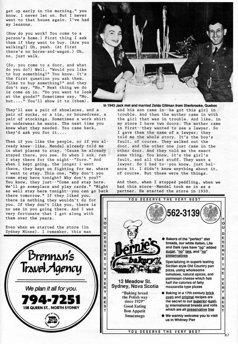 Published by Ronald Caplan on 1992/1/1 (181 reads)get up early in the morning," you know. I never let on. But I never went to that house again. I've had my lessons. (How do you work? You come to a person's home.) First thing I ask them if they want to buy. (Are you walking?) Oh, yeah. (At first there's no horse-and-wagon.) Oh, no, just walk. (So, you come to a door, and what do you do?) Well, "Would you like to buy something?" You know. It's the first question you ask them, "Like to buy something?" And they don't say, "No." Next thing we do is come on in. "Do you want to lookl at the goods?" Sometimes say, "No, but...." You'll show it to (them). ??v:JI H'Hv m ''m, i lis S' '1 '''''??< '''''''''''''1 "-' l'J They'll see a pair of shoelaces, and a pair of socks, or a tie, or housedress, a pair of stockings. Sometimes a work shirt or underwear he wants. The next time you knew what they needed. You came back, they'd ask you for it.... Then if you like the people, or if you al? ready knew--like, Mendel already told me in what places to stay. 'Cause he already stayed there, you see. So when I ask, can I stay there for the night--"Sure." And when I kept going, the longer I went there, they kept on fighting for me, where I want to stay. This one, "Why don't you come stay here tonight? Why don't you?" You know, they just--"Come and stay here. We'll go someplace and play cards." "Might as well stay here tonight--you can go back there tomorrow." If they liked you, there is nothing they wouldn't do for you. If they don't like you, there is no use in you going there. And I was very fortunate that I got along with them over the years. In 1943 Jack met and married Zelda Glllman from Sherbrooke, Quebec and his son came in--he got this girl in a trouble. And then the mother came in with the girl that was in trouble. And like, in my store I have two doors. The mother came in first--they wanted to see a lawyer. So I gave them the name of a lawyer; they told me the whole story. It's the boy's fault, of course. They walked out the door, and the other one just came in the other door. And they told me the exact same thing. You know, it's the girl's fault, and all that stuff. They want a lawyer. So I had to--you know, just bal? ance it. I didn't know anything about it, of course. But those were the things. And then, when I stopped peddling, when we had this store--Mendel took me in as a partner. He started the store in 1930. Even when we started the store (in Sydney Mines). I remember, this man We plan it all for you. 794-7251 )5S QUEEN ST., NORTH SYDNEY YOU DESERVE THE VERY BEST 562-3139 12 Meadow St. Sydney, Nova Scotia "Baking bread the Polish way since 1929" Good Eating Bon Appetit Smacznego I Bakers of the "perfect" diet breads, our white Italian, Lite and Dark ryes have "no" added sugar, "no" fats, and "no" preservatives Specializing in superb tasting Sicilian style Old Country pan pizza, using wholesome tomatoes, natural spices, and parmesan cheese which has half the calories of fatty mozzarella type pizzas > Baking in a 17th century brick oven and original recipes are the secret to our superior quali- ty international breads and roils which are all preservative free ?? We warmly welcome you to visit us in Whitney Pier YOU DESERVE THE VERY BEST