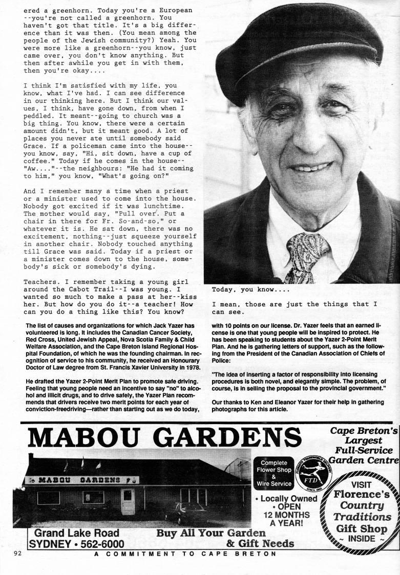 Published by Ronald Caplan on 1992/1/1 (207 reads)ered a greenhorn. Today you're a European --you're not called a greenhorn. You haven't got that title. It's a big differ? ence than it was then. (You mean among the people of the Jewish community?) Yeah. You were more like a greenhorn--you know, just came over, you don't know anything. But then after awhile you get in with them, then you're okay.... I think I'm satisfied with my life, you know, what I've had. I can see difference in our thinking here. But I think our val? ues, I think, have gone down, from when I peddled. It meant--going to church was a big thing. You know, there were a certain amount didn't, but it meant good. A lot of places you never ate until somebody said Grace. If a policeman came into the house-- you know, say, "Hi, sit down, have a cup of coffee." Today if he comes in the house-- "Aw...."--the neighbours: "He had it coming to him," you know, "What's going on?" And I remember many a time when a priest or a minister used to come into the house. Nobody got excited if it was lunchtime. The mother would say, "Pull over'. Put a chair in there for Fr. So-and-so," or whatever it is. He sat down, there was no excitement, nothing--just squeeze yourself in another chair. Nobody touched anything till Grace was said. Today if a priest or a minister comes down to the house, some? body's sick or somebody's dying. Teachers. I remember taking a young girl around the Cabot Trail--I was young. I wanted so much to make a pass at her--kiss her. But how do you do it--a teacher! How can you do a thing like this? You know? The list of causes and organizations for which Jack Yazer has volunteered is long. It includes the Canadian Cancer Society, Red Cross, United Jewish Appeal, Nova Scotia Family & Child Welfare Association, and the Cape Breton Island Regional Hos? pital Foundation, of which he was the founding chairman. In rec? ognition of service to his community, he received an Honourary Doctor of Law degree from St. Francis Xavier University in 1978. He drafted the Yazer 2-Point Merit Plan to promote safe driving. Feeling that young people need an incentive to say "no" to alco? hol and illicit drugs, and to drive safely, the Yazer Plan recom? mends that drivers receive two merit points for each year of conviction-freedriving • rather than starting out as we do today, ''m'' Today, you know.. I mean, those are just the things that I can see. with 10 points on our license. Dr. Yazer feels that an earned li? cense is one that young people will be Inspired to protect. He has been speaking to students about the Yazer 2-Point Merit Plan. And he is gathering letters of support, such as the follow? ing from the President of the Canadian Association of Chiefs of Police: 'The Idea of inserting a factor of responsibility into licensing procedures is both novel, and elegantly simple. The problem, of course, is in selling the proposal to the provincial government." Our thanks to Ken and Eleanor Yazer for their help in gathering photographs for this article. MABOU GARDENS Grand Lake Road SYDNEY • 562-6000 Complete Flower Shop i & Wire Service illy • OPEN 12 MONTHS A YEAR! Buy All Your Garden & Gift Needs A COMMITMENT TO CAPE BRETON Cape Breton's Largest Full-Service Garden Centre ' VISIT Florence*! Country -' Traditions ' Gift Shop '~ INSIDE h. ..,.18 i top J