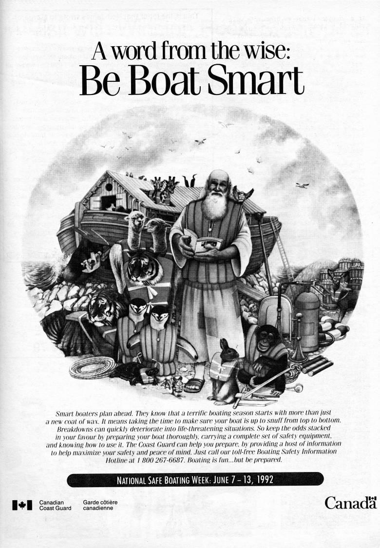 Published by Ronald Caplan on 1992/6/1 (300 reads)A wwd from the wise: Be Boat Smart Smart boaters plan ahead. They know that a terrific boating season starts with more than just a new coat of wax. It means taking the time to make sure your boat is up to snuff from top to bottom. Breakdowns can quickly deteriorate into life-threatening situations. So keep the odds stacked in your favour by preparing your boat thoroughly carrying a complete set of safety equipment, and knowing how to use it. The Coast Guard can help you prepare, by providing a host of information to help maximize your safety and peace of mind. Just call our toll-free Boating Safety Information Hotline at I 800 267-6687. Boating is fun...but be prepared. NATIONAL SAFE BOATING WEEK: JUNE 7 - 13, 1992 1'1 (Canadian ?? tB Coast Guar Garde cotiere canadienne Canada
