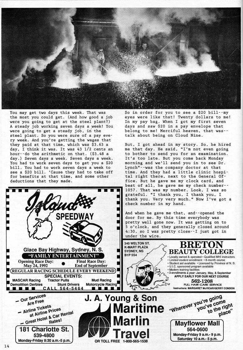 Published by Ronald Caplan on 1992/6/1 (288 reads)You may get two days this week. That was the most you could get. (And how good a job were you going to get at the steel plant?) A steady job working seven days a yeekl You were going to get a steady job, in the steel plant. So you were sure of a pay eve? ry week. And you're getting the wages that they paid at that time, which was $3.63 a day, I think it was. It was 43 1/2 cents an hour--do the arithmetic on that. ($3.48 a day.) Seven days a week. Seven days a week. You had to work seven days to get you a $20 bill. You had to work seven days a week to see a $20 bill. 'Cause they had to take off for benefits at that time, and some other deductions that they made. Glace Bay Highway, Sydney, N. S. "FAMILY ENTERTAINMENT" Opening Race Day: May 24,1992 Final Race Day: End of September (REGULAR RACING SCHEDULE EVERY WEEKEND) SPECIAL EVENTS: MASCAR Racing Tractor Pulls Mud Racing Demolition Derbies Stunt Drivers Motorcycle Racing' ?? ?? ?? ?? CALL 564-5464 ??. So in order for you to see a $20 bill--my eyes were like that! Twenty dollars to me! In my pay bag. When I got my first seven days and saw $20 in a pay envelope that belong to me! Merciful heaven, that was-- talk about being on Cloud Nine. But, I got ahead in my story. So, he hired me that day. He said, "I'm not even going to bother to send you for an examination. It's too late. But you come back Monday morning and we'll send you in to see Dr. Lynch"--was the company doctor at that time. And they had a little clinic hospi? tal right there, next to the General Of? fice. But he gave me my clock card, and best of all, he gave me my check number-- 105 7. That was my number. Look, I was so grateful. "I thank you, I thank you, I thank you. Very very much." Now I've got a check number in my hand. And when he gave me that, and--opened the door for me. By this time everybody was pretty well gone now. It was getting on to 5 o'clock, and they generally closed around 4:30, so I was pretty close--I just got in under the wire. 340 WELTON ST. K-MART PLAZA SYDNEY, NS B1P5S4 BRETON BEAUTY COLLEGE • Locally owned & operated • Qualified MHI instructors • Limited student enrollment • 8-month course • Student aid available • Licensed by Province of N. S. • U.I.C. sponsored program available • Modern training facilities 3 enrollments a year: January, May, & September APPLY EARLY FOR OUR NEXT COURSE 562-1208 FULL HAIR CARE SERVICE Instructors: MARGARET McVICAR/GERRY CONDON 181 Charlotte St. 539-4800 ' Monday-Friday 8:30 a.m.-5 p.m.' J. A. Young & Son Maritime Marlin 'fl''l' Travel OR TOLL FREE 1-800-565-1538 90V W9 ..>rHete' .MevVO':;,eCO?'f ''nox'ejg' Mayflower Mall' 564-0600 Monday-Friday 9 a.m.- 9 p.m. Saturday 10 a.m.- 5 p.m.