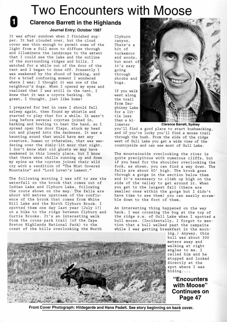 Published by Ronald Caplan on 1992/8/1 (638 reads)Two Encounters with Moose Clarence Barrett in the Highlands Journal Entry: October 1987 It was after sundown when I finished sup? per. It had clouded over, but the cloud cover was thin enough to permit some of the light from a full moon to diffuse through and illuminate the landscape to the extent that I could see the lake and the outline of the surrounding ridges and hills. I watched for a while out of the door of the tent and I began to doze off. Presently I was awakened by the s'ound of barking, and for a brief confusing moment I wondered where I was; I thought it was one of the neighbour's dogs. Wnen 1 opened my eyes and realized that I was still in the tent, I knew that it was a coyote barking. Oh great, I thought, just like home! I prepared for bed in case I should fall asleep again, then found my whistle and started to play that for a while. It wasn't long before several coyotes joined in, barking and howling to beat the band, so I spread open the door flaps, stuck my head out and played into the darkness. It was a haunting sound that would have met any creature, human or otherwise, that was wan? dering over the dimly-lit moor that night. I don't know what old ghosts we may have awakened in this lonely place, but I know that there were chills running up and down my spine as the coyotes joined their wild cry with a rendition of "The Mist Covered Mountains" and "Lord Lovat's Lament." The following morning I was off to see the waterfall on the brook that comes out of Indian Lake and Clyburn Lake, following the route shown on the map. The falls are about 400 metres upstream of the conflu? ence of the brook that comes from White Hill Lake and the North Clyburn Brook. I spotted them one day last year (July 17) on a hike to the ridge between Clyburn and Curtis Brooks. It's an interesting walk from the cross-park trail (of the Cape Breton Highlands National Park) to the crest of the hills overlooking the North Clyburn canyon. There's a bit of tuckamoor and woods, but most of it's easy going through shrubs and bogs . If you walk west along the trail from Dau- phiney Lake for a lit? tle less than a ki- 1 omet e r Clarence Barrett, Sydney you'll find a good place to start bushwacking, and if you're lucky you'll find a moose trail through the bush. From the side of the ridge west of Gull Lake you get a wide view of the countryside and can see most of Gull Lake. The mountainside overlooking the river is quite precipitous with numerous cliffs, but if you head for the shoulder overlooking the fork, as shown, you can find a way down. The falls are about 60' high. The brook goes through a gorge in the section below them and it's necessary to climb up high on the side of the valley to get around it. When you get to the largest fall (there are smaller ones within the gorge but I didn't have time to see them) you can easily scram? ble down to the foot of them. An interesting thing happened on the way back. I was the ridge s. bull moose, tion that a while I was 'f'ffl''c ,%'; '-. '-''J:.': crossing the bog at the top of w. of Gull Lake when I spotted a (Incidentally, I forgot to men- bull walked past the campsite getting breakfast in the morn? ing.) Anyway, this bull was about 300 meters away and ?? walking at right angles to me. I called him and he stopped and looked ?? v' directly at the " spot where I was ''* hiding .... I "Encounters '/l with Moose" % • i Continues on Page 47 Front Cover Photograph: Hildegarde and Hans Padelt. See story beginning on back cover.