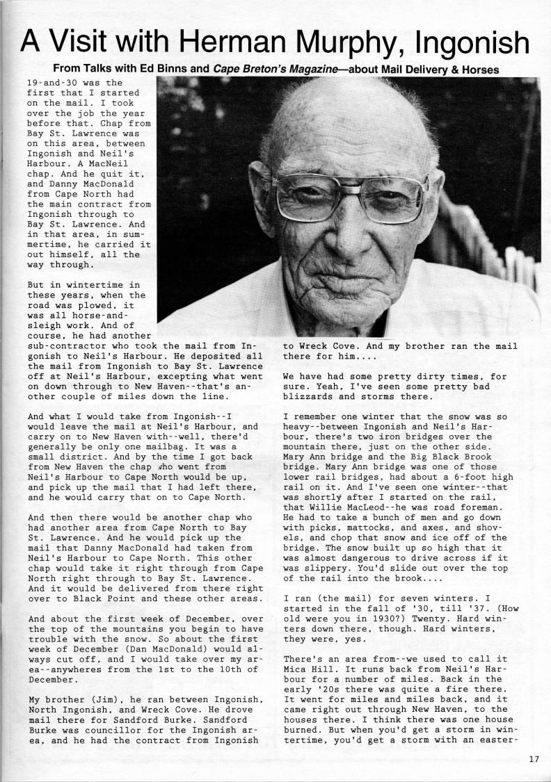 A Visit with Herman Murphy, Ingonish From Talks with Ed Binns and Cape Breton's Magazine • about Mail Delivery & Horses 19-and-30 was the first that I started on the mail. I took over the job the year before that. Chap from Bay St. Lawrence was on this area, between Ingonish and Neil's Harbour. A MacNeil chap. And he quit it, and Danny MacDonald from Cape North had the main contract from Ingonish through to Bay St. Lawrence. And in that area, in sum? mertime, he carried it out himself, all the way through. But in wintertime in these years, when the road was plowed, it was all horse-and- sleigh work. And of course, he had another sub-contractor who took the mail from In? gonish to Neil's Harbour. He deposited all the mail from Ingonish to Bay St. Lawrence off at Neil's Harbour, excepting what went on down through to New Haven--that's an? other couple of miles down the line. to Wreck Cove, there for him. And my brother ran the mail We have had some pretty dirty times, for sure. Yeah, I've seen some pretty bad blizzards and storms there. And what I would take from Ingonish--I would leave the mail at Neil's Harbour, and carry on to New Haven with--well, there'd generally be only one mailbag. It was a small district. And by the time I got back from New Haven the chap vho went from Neil's Harbour to Cape North would be up, and pick up the mail that I had left there, and he would carry that on to Cape North. And then there would be another chap who had another area from Cape North to Bay St. Lawrence. And he would pick up the mail that Danny MacDonald had taken from Neil's Harbour to Cape North. This other chap would take it right through from Cape North right through to Bay St. Lawrence. And it would be delivered from there right over to Black Point and these other areas. And about the first week of December, over the top of the mountains you begin to have trouble with the snow. So about the first week of December (Dan MacDonald) would al? ways cut off, and I would take over my ar? ea- -anywheres from the 1st to the 10th of December. My brother (Jim), he ran between Ingonish, North Ingonish, and Wreck Cove. He drove mail there for Sandford Burke. Sandford Burke was councillor for the Ingonish ar? ea, and he had the contract from Ingonish I remember one winter that the snow was so heavy--between Ingonish and Neil's Har? bour, there's two iron bridges over the mountain there, just on the other side. Mary Ann bridge and the Big Black Brook bridge. Mary Ann bridge was one of those lower rail bridges, had about a 6-foot high rail on it. And I've seen one winter--that was shortly after I started on the rail, that Willie MacLeod--he was road foreman. He had to take a bunch of men and go down with picks, mattocks, and axes, and shov? els, and chop that snow and ice off of the bridge. The snow built up so high that it was almost dangerous to drive across if it was slippery. You'd slide out over the top of the rail into the brook.... I ran (the mail) for seven winters. I started in the fall of '30, till '37. (How old were you in 1930?) Twenty. Hard win? ters down there, though. Hard winters, they were, yes. There's an area from--we used to call it Mica Hill. It runs back from Neil's Har? bour for a number of miles. Back in the early '20s there was quite a fire there. It went for miles and miles back, and it came right out through New Haven, to the houses there. I think there was one house burned. But when you'd get a storm in win? tertime, you'd get a storm with an easter-