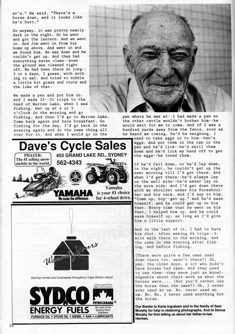 Published by Ronald Caplan on 1993/1/1 (238 reads)er's." He said. "There's a horse down, and it looks like he's hurt." So anyway, it was pretty nearly dark in the night. So he went and got the lantern. And we went in. And Jim went in from his home up above. And went in and we found him. He was down and he couldn't get up. And they had everything eaten clean--even the ground was cleaned right off. He had been there so long-- 3 or 4 days, I guess, with noth? ing to eat. And tried to nibble a little bit grass and roots and the like of that. We made a pen and put him in. And I made 32--31 trips to the head of Warren Lake, when I was fishing. Get up at 4 or 5 o'clock in the morning and go fishing. And then I'd go to Warren Lake. Come back again and have breakfast. Go fishing for the day. I'd go back in the evening again and do the same thing all over for it. And when I would go in the pen where he was at--I had made a pen so the other cattle wouldn't bother him--he would wait for me to come. And if I was a hundred yards away from the fence, soon a he heard me coming, he'd be neighing. I Dave's Cycle Sales PHAZER: ) 455 GRAND LAKE RD., SYDNEY I The #1 selling snow- -'r Mr%An immobile in the world.J 562-4343 Yamaha YAMAHA is your #1 choice WemakethediffeniKe. for 4-wheel drive. Serving homes and businesses throughout Cape Breton Island _'''MiHB ''iBHI'' 't' '''' Maple Leaf Products of SYMOi' ENERGY FUELS 38 Lewis Drive Sydney River 539-6444 FURNACE OIL • STOVE OIL • DIESEL • GAS > LUBRICANTS used to take eggs in to him--hen's eggs. And put them in the can in the pen and he'd lick--he'd swill them down and he'd lick my hand off to get the eggs--he loved them. If he'd fall down, or he'd lay down, in the night, he couldn't get up the next morning till I'd get there. And when I'd get there--he'd always lay on the well side--he'd never lay on the sore side. And I'd get down there with my shoulder under his foreshoul- der and his neck. And I'd say to him, "Come up, boy--get up." And he'd ease himself, and he could get up on his feet. Every time that he went on his feet, I helped him up. And he could ease himself up, as long as I'd give him a little support. And in the last of it, I had to have him shot. After making 64 trips--3- mile walk there in the morning, and the same in the evening after fish? ing. And before fishing. (There were quite a few oxen used down there too, wasn't there?) Oh, yes, the olden days, a lot who didn't have horses had oxen. And they used to use them--they were just as knowl? edgeable about their work as what the horses were.... (But you'd rather use the horse than the oxen?) Oh, I never ever used an ox. No, never used an ox. No. No, I never used anything but the horse. Our thanks to Karia ingraham and to the family of Sam Murphy for help in obtaining photographs. And to Donna Murphy for first telling us about her father-in-law Herman.