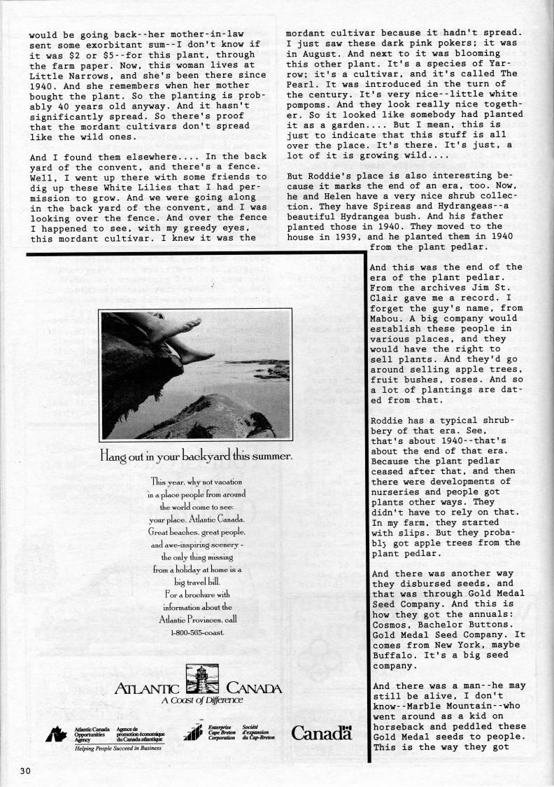 Published by Ronald Caplan on 1993/6/1 (274 reads)would be going back--her mother-in-law sent some exorbitant sum--I don't know if it was $2 or $5--for this plant, through the farm paper. Now, this woman lives at Little Narrows, and she's been there since 1940. And she remembers when her mother bought the plant. So the planting is prob? ably 40 years old anyway. And it hasn't significantly spread. So there's proof that the mordant cultivars don't spread like the wild ones. And I found them elsewhere.... In the back yard of the convent, and there's a fence. Well, I went up there with some friends to dig up these White Lilies that I had per? mission to grow. And we were going along in the back yard of the convent, and I was looking over the fence. And over the fence I happened to see, with my greedy eyes, this mordant cultivar. I knew it was the mordant cultivar because it hadn't spread. I just saw these dark pink pokers; it was in August. And next to it was blooming this other plant. It's a species of Yar? row; it's a cultivar, and it's called The Pearl. It was introduced in the turn of the century. It's very nice--little white pompoms. And they look really nice togeth? er. So it looked like somebody had planted it as a garden.... But I mean, this is just to indicate that this stuff is all over the place. It's there. It's just, a lot of it is growing wild.... But Roddie's place is also interesting be? cause it marks the end of an era, too. Now, he and Helen have a very nice shrub collec? tion. They have Spireas and Hydrangeas--a beautiful Hydrangea bush. And his father planted those in 1940. They moved to the house in 1939, and he planted them in 1940 from the plant pedlar. ilang out m your iDackyard this summer. 1 ms year, wny not vacation in a place people irom around tke world come to see: your place. Atlantic (janada. (jreat beaches, great people, and awe-inspirmg scenery - tke only tkmg missing irom a holiday at kome is a mg travel bill. lor a brockure with mlormation atout the Atlantic rrovmces, call 1-800-565-coast. Atlantic 'E Canada A Cocst of Difference Atlantic Canada Agencede Opportunities promotion ec(Hioinii]iie Agency du Canada adantique Helping People Succeed in Business ??Jf Enterprise Societe B(l Cape Breton d'emansion W Corporation du Qgt-Breton Canada And this was the end of the era of the plant pedlar. From the archives Jim St. Clair gave me a record. I forget the guy's name, from Mabou. A big company would establish these people in various places, and they would have the right to sell plants. And they'd go around selling apple trees, fruit bushes, roses. And so a lot of plantings are dat? ed from that. Roddie has a typical shrub? bery of that era. See, that's about 1940--that's about the end of that era. Because the plant pedlar ceased after that, and then there were developments of nurseries and people got plants other ways. They didn't have to rely on that. In my farm, they started with slips. But they proba? bly got apple trees from the plant pedlar. And there was another way they disbursed seeds, and that was through Gold Medal Seed Company. And this is how they got the annuals: Cosmos, Bachelor Buttons. Gold Medal Seed Company. It comes from New York, maybe Buffalo. It's a big seed company. And there was a man--he may still be alive, I don't know--Marble Mountain--who went around as a kid on horseback and peddled these Gold Medal seeds to people. This is the way they got