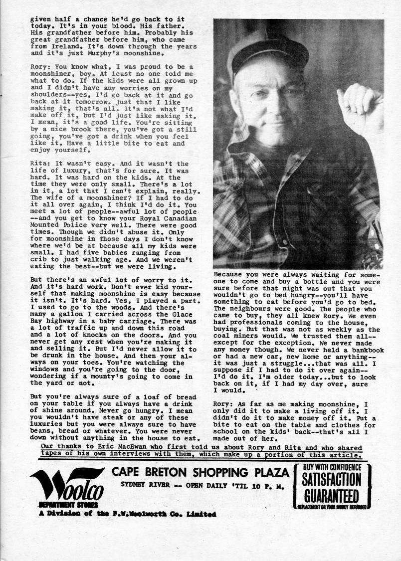Published by Ronald Caplan on 1976/8/1 (849 reads)given half a chance he'd go back to it today. It's in your blood. His father. His grandfather before hira. Probably his great grandfather before him, who carae frora Ireland. It's down through the years and it's just Murphy's moonshine. Rory: You know what, I was proud to be a moonshiner, boy. At least no one told rae what to do. If the kids were all grown up and I didn't have any worries on ray shoulders • yes, I'd go back at it and go back at it tomorrow. Just that I like making it, that's all. It's not what I'd make off it, but I'd just like making it. I mean, it's a good life. You're sitting by a nice brook there, you've got a still going, you've got a drink when you feel like it. Have a little bite to eat and enjoy yourself. Rita: It wasn't easy. And it wasn't the life of luxury, that's for sure. It was hard. It was hard on the kids. At the time they were only small. There's a lot in it, a lot that I can't explain, really. Ihe wife of a moonshiner? If I had to do it all over again, I think I'd do it. You meet a lot of people • awful lot of people • and you get to know your Royal Canadian Mounted BDlice very well. Ihere were good times. Ihough we didn't abuse it. Only for moonshine in those days I don't know where we'd be at because all my kids were small. I had five babies ranging from crib to just walking age. And we weren't eating the best • but we were living. But there's an awful lot of worry to it. And it's hard work. Don't ever kid your? self that making moonshine is easy because it isn't. It's hard. Yes, I played a part. I used to go to the woods. And there's many a gallon I carried across the Glace Bay highway in a baby carriage. There was a lot of traffic up and down this road and a lot of knocks on the doors. And you never get any rest when you're making it and selling it. But I'd never allow it to be drunk in the house. And then your al? ways on your toes. You're watching the windows and you're going to the door, wondering if a mounty's going to come in the yard or not. But you're always sure of a loaf of bread on your table if you always have a drink of shine around. Never go hungry. I mean you wouldn't have steak or any of these Itixuries but you were always sure to have beans, bread or whatever. You were never down without anything in the house to eat. Because you were always waiting for sorae? one to come and buy a bottle and you were sure before that night was out that you wouldn't go to bed hungry • you'll have something to eat before you'd go to bed. The neighbours were good. The people vrtio came to buy, they all knew Rory. We even had professionals coming to the house, buying. But that was not as weekly as the coal miners would. We trusted them all • except for the exception. We never made any money though. We never held a bankbook or had a new car, new home or anything • it was just a struggle...that was all. I suppose if I had to do it over again • I'd do it. I'ra older today.,.but to look back on it, if I had my day over, sure I would. Rory: As far as me making moonshine, I only did it to make a living off it. I didn't do it to make money off it. Put a bite to eat on the table and clothes for school on the kids' back • that's all I made out of her. Our thanks to Eric MacEwan vdio first told us atnjut Rory and Rita and who shared tapes of his own interviews with them, which make up a portion of this article. 'Som CAPE BRETON SHOPPING PLAZA SYDNBT RIVBR _ OKN DAILT 'TIL 10 ?. M. BUYWimcONRDBICE SATISFACTION fiUARANTED A mitUioQ • ?? tlit y>w> • oHi??rtfc Go? Uait?d