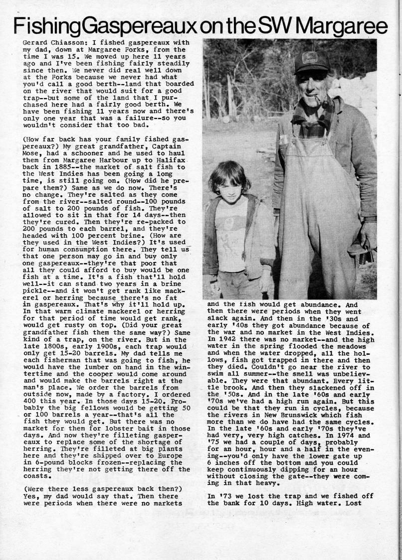 Published by Ronald Caplan on 1976/8/1 (1650 reads)FishingGaspereaux on theSW Margaree Gerard Chiasson: I fished gaspereaux with my dad, down at Margaree Forks, from the tirae I was 15, We moved up here 11 years ago and I've been fishing fairly steadily since then. We never did real well down at the Forks because we never had what you'd call a good berth • land that boarded on the river that would suit for a good trap • but sorae of the land that I pur? chased here had a fairly good berth. We have been fishing 11 years now and there's only one year that was a failure • so you wouldn't consider that too bad, (How far back has your family fished gas? pereaux?) My great grandfather. Captain Mose, had a schooner and he used to haul them frora Margaree Harbour up to Halifax back in 1885 • the market of salt fish to the West Indies has been going a long time, is still going on, (How did he pre? pare them?) Sarae as we do now. There's no change. They're salted as they come from the river • salted round • 100 pounds of salt to 200 pounds of fish. They're allowed to sit in that for 14 days • then they're cured. Then they're re-packed to 200 pounds to each barrel, and they're headed with 100 percent brine, (How are they used in the West Indies?) It's used_ for human consumption there. They tell us that one person raay go in and buy only one gaspereaux--they??re that poor that all they could afford to buy would be one fish at a time. It's a fish that'll hold well • it can stand two years in a brine pickle • and it won't get rank like mack? erel or herring because_there's no fat in gaspereaux. That's why it'll hold up. In that warm cliraate mackerel or herring for that period of time would get rank, would get rusty on top. (Did your great grandfather fish thera the same way?) Same kind of a trap, on the river. But in the late 1800s, early 1900s, each trap would only get 15-20 barrels. My dad tells me each fisherman that was going to fish, he would have the lumber on hand in the win? tertime and the cooper would come around and would raake the barrels right at the raan's place. We order the barrels from outside now, made by a factory, I ordered 400 this year. In those days 15-20. Pro? bably the big fellows would be getting 50 or 100 barrels a year • that's all the fish they would get. But there was no market for thera for lobster bait in those days. And now they're filleting gasper? eaux to replace some of the shortage of herring. They're filleted at big plants here and they're shipped over to Europe in 6-pound blocks frozen • replacing the herring they're not getting there off the coasts. (Were there less gaspereaux back then?) Yes, my dad would say that. Then there were periods when there were no markets and the tish would get abundance. And then there were periods when they went slack again. And then in the '30s and early '40s they got abundance because of the war and no market in the West Indies, In 1942 there was no market • and the high water in the spring flooded the meadows and when the water dropped, all the hol? lows, fish got trapped in there and then they died. Couldn't go near the river to swim all summer • the smell was unbeliev? able. They were that abundant. Every lit? tle brook. And then they slackened off in the '50s. And in the late '60s and early '70s we've had a high run again. But this could be that they run in cycles, because the rivers in New Brunswick which fish more than we do have had the same cycles. In the late '60s and early '70s they've had very, very high catches. In 1974 and '75 we had a couple of days, probably for an hour, hour and a half in the even? ing • you'd only have the lower gate up 6 inches off the bottom and you could keep continuously dipping for an hour without closing the gate • they were com? ing in that heavy. In '73 we lost the trap and we fished off the bank for 10 days. High water. Lost