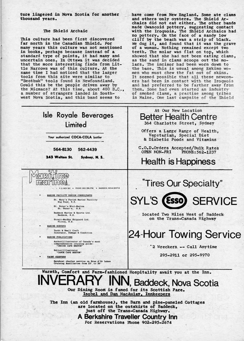 ture lingered in Nova Scotia for another thousand years. Ihe Shield Archaic This culture had been first discovered far north in the Canadian Shield. For many years this culture was not mentioned in books, perhaps because instead of a standard type of points, it had many and uncertain ones. In Ottawa it was decided that the more interesting finds frora Lit? tle Narrows was of this culture. At the same time I had noticed that the larger tools from this site were similar to "Beothuk" tools found in Newfoundland. Could this be the people driven away by the Micmacs? At this time, about 400 B.C., a number of strangers landed in South? west Nova Scotia, and this band seems to have corae frora New England. Some ate clams and others only oysters. Ihe Shield Ar? chaics did not eat either. The other bands made Owascoid pottery, suggesting contact with the Iroquois. The Shield Archaics had no pottery. On the face of a sandy low cliff by the beach was a strip of black. We dug it, and found that it was the grave of a woman. Nothing remained except two teeth. The molar was flat on top, which showed that she had not been eating clams, as the sand in clams scoops out the mo? lars. The incisor had been worn down to the base. This is usual among Eskimo wo? men who must chew the fat out of skins. It seemed possible that all these newcom? ers had been in contact with the Iroquois and had preferred to be farther away from them. Some had even started an industry- of smoked clams, a practise among tribes in Maine, One last campsite of the Shield Isle Royale Beverages Linnited Your authorized COCA-COLA botfler 564-8130 562-4439 24S Welton St. Sydn?y, N. S. At Our New Location Better Health Centre 364 Charlotte Street, Sydney Offers a Large' Range of Health, Vegetarian, Special Diet & Diabetic Foods and Vitamins C.O.D.Orders Accepted/Bulk Rates OPEN MON-FRI PHONE:562-1237 Health is Happiness ]'c "Tires Our Specialty" MARINE FACILITY DESIGN CONSULTANTS St. Mary's Parish Marine Facili larine & Spor :k, N.S. icKay Shipyar Yacht & Small Craft MARINE PUBLICATIONS Author/illustrator of Canada's • comprenhensive cruising guide- "CRUISE CAPE BRETON" YACHT CHARTERS SYL'S ffssd) SERVICE located Two Miles West of Baddeck on the Trans-Canada Highway 24-Hour Towing Service *2 Wreckers. • Call Anytime 295-2911 or 295-9970 Warmth, Comfort and Farm-fashioned Hospitality await you at the INVERARY INN, Baddeck, Nova Scotia Our Dining Room is famed for its Scottish Fare. Isobel and Dan MacAulay. Innkeepers The Inn Can old farmhouse', the Bam and pine-paneled Cottages are located on the outskirts of Baddeck, just off the Trans-Canada Highway. A Berkshire Traveller Country Inn For Reservations Phone 902-295-2674 Inn.