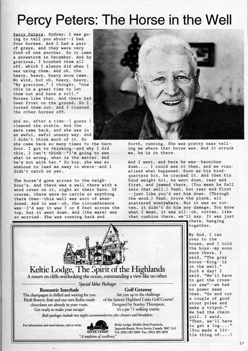 Percy Peters: The Horse in the Well Percy Peters. Sydney: I was go? ing to tell you about--I had four horses. And I had a pair of grays, and they were very fond of one another. So it came a snowstorm in December. And by gracious, I brushed them all off, which I always did when I was using them. And oh, the heavy, heavy, heavy snow came. No wind, but oh, heavy, heavy. "By gracious," I thought, "now this is a great time to let them out and have a roll." Horses like that. And there had been frost on the ground. So I turned them out. And I cleaned the other horses off. And so, after a time--I guess I cleaned the stable. And the mare came back, and she was in an awful, awful uneasy way. And I didn't think much of it. So she came back so many times to the barn door. I got to thinking--and why I did this, I can't think--"I'm going to see what is wrong, what is the matter. And he's not with her." So boy, she was so anxious to lead me away to where--and I didn't catch on yet. The horse'd gone across to the neigh? bour's. And there was a well there with a wood cover on it, right at their barn. Of course, there were no cattle or anything there then--this well was sort of aban? doned. And it was--oh, the circumference was--I'd say it was 7 or 8 feet across the top, but it went down. And (the mare) was so worried. She was running back and Keltic Lodge, The Spirit of the Highlands A resort on clifife overlooking the ocean, commanding a view like no other. Special Value Packages Romantic Interlude The champagne is chilled and waiting for you. Fresh flowers, fruit and our own Keltic-made chocolates are already in your room. Get ready to make your escape! Both packages include two nights accommodatimis phis dinners and breakfasts. For information and reservations, call or write: KELTIC liDneE "' tradition of excellence''' forth, running. She was pretty near tell? ing me where that horse was. And it struck me, he is in there. And I went, and here he was--haunches down.... I could see it then, and we visu? alized what happened. Soon as his hind? quarters hit, he cracked it. And then his hind weight hit, he went down, rear end first, and jammed there. (You mean he fell into that well.) Yeah, but rear end first --just like you'd set him down. (Through the wood.) Yeah. Drove the plank, all scattered everywhere. But it was so rot? ten, it didn't do him any damage. You know what I mean, it was all--oh, rotten, like that cushion there, we'll say. It was just there, hanging together. My God, I ran over to the house, and I told the boys--my sons were there. I said, "The gray horse--King--is in the well." Such a day! I said, "We'll have to get the cross? cut saw"--we had no power saws then. "Go and cut a couple of good stout poles and make a tripod." We had the chain pull. I said, "Then, we'll have to get a log...." (You made a lit? tle thing of....) Golf Getaway Are you up to the challenge of the famous Highland Links Golf Course? Designed by Stanley Thompson, it's a par 71 walking course. Keltic Lx)dge, Middle Head Peninsula, Ingonish Beach, Nova Scotia, Canada BOC ILO Tel: (902) 285-2880 Fax: (902) 285-2859