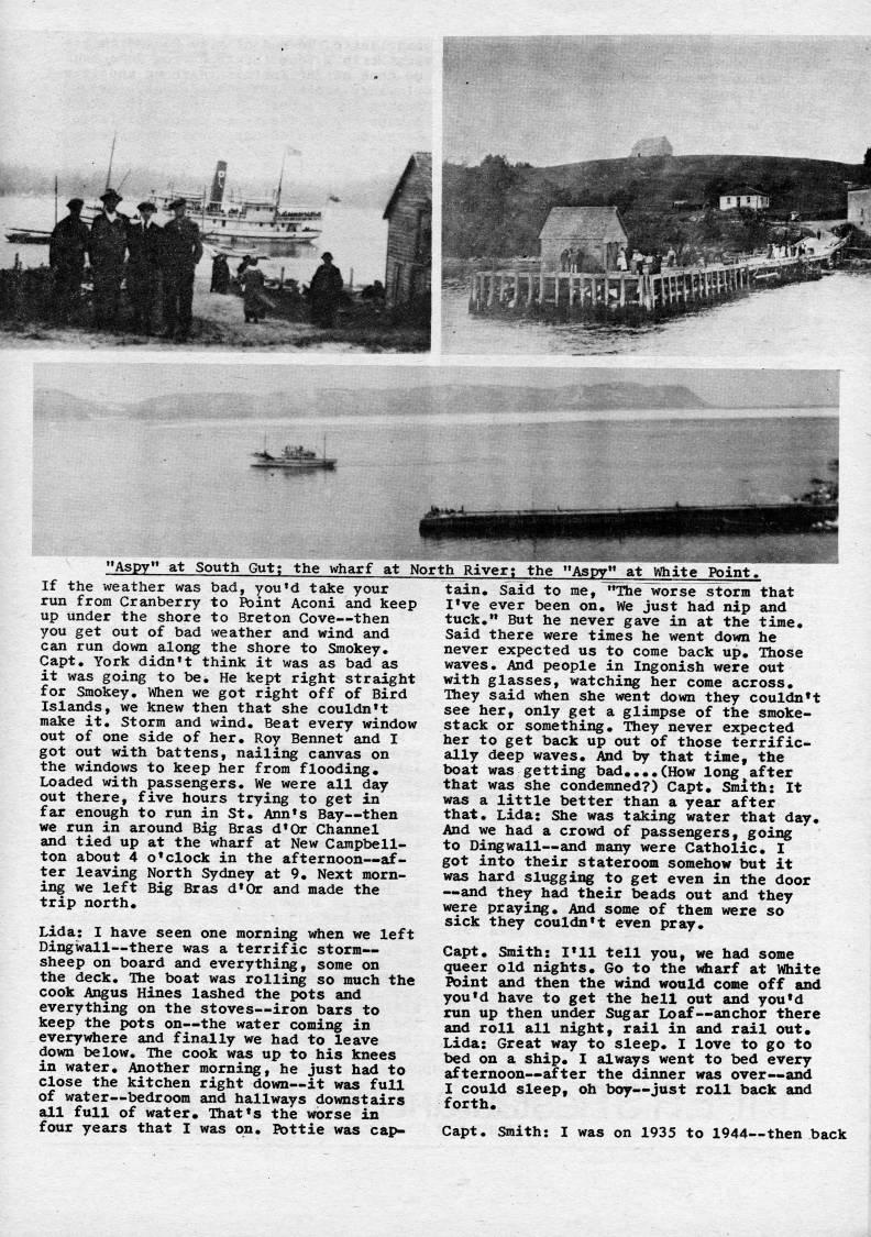 Published by Ronald Caplan on 1976/8/1 (349 reads)~,-y?'??''p "Aspy" at South Gut; the wharf at North River; the "Aspy" at White Point. If the weather was bad, you'd take your run from Cranberry to Point Aconi and keep up under the shore to Breton Cove • then you get out of bad weather and wind and can run down along the shore to Sraokey. Capt, York didn't think it was as bad as it was going to be* He kept right straight for Smokey. When we got right off of Bird Islands, we knew then that she couldn't raake it. Storra and wind. Beat every window out of one side of her. Roy Bennet and 1 got out with battens, nailing canvas on the windows to keep her from flooding. Loaded with passengers. We were all day out there, five hours trying to get in far enough to run in St. Ann's Bay • then we run in around Big Bras d'Or Channel and tied up at the wharf at New Campbell? ton about 4 o'clock in the afternoon • af? ter leaving North Sydney at 9. Next morn? ing we left Big Bras d'Or and made the trip north. Lida: I have seen one morning when we left Dingwall • there was a terrific storm- sheep on board and everything, some on the deck. The boat was rolling so much the cook Angus Hines lashed the pots and everything on the stoves • iron bars to keep the pots on • the water coming in everywhere and finally we had to leave down below. The cook was up to his knees in water. Another morning, he just had to close the kitchen right down • it was full of water • bedroom and hallways downstairs all full of water. That's the worse in four years that I was on. Pottie was cap? tain. Said to me, "The worse storm that I've ever been on. We just had nip and tuck." But he never gave in at the time. Said there were times he went down he never expected us to come back up. Ihose waves. And people in Ingonish were out with glasses, watching her come across. Ihey said vrtien she went down they couldn't see her, only get a glimpse of the smoke? stack or soraething. They never expected her to get back up out of those terrific? ally deep waves. And by that tirae, the boat was getting bad....(How long after that was she condemned?) Capt. Smith: It was a little better than a year after that. Lida: She was taking water that day. And we had a crowd of passengers, going to Dingwall • and raany were Catholic. I got into their stateroora soraehow but it was hard slugging to get even in the door • and they had their beads out and they were praying. And some of them were so sick they couldn't even pray. Capt. Smith: I'll tell you, we had sorae queer old nights. Go to the v'arf at White Point and then the wind would corae off and you'd have to get the hell out and you'd run up then under Sugar Loaf • anchor there and roll all night, rail in and rail out. Lida: Great way to sleep. I love to go to bed on a ship. I always went to bed every afternoon • after the dinner was over • and I could sleep, oh boy • just roll back and forth. Capt. Smith: I was on 1935 to 1944 • then back