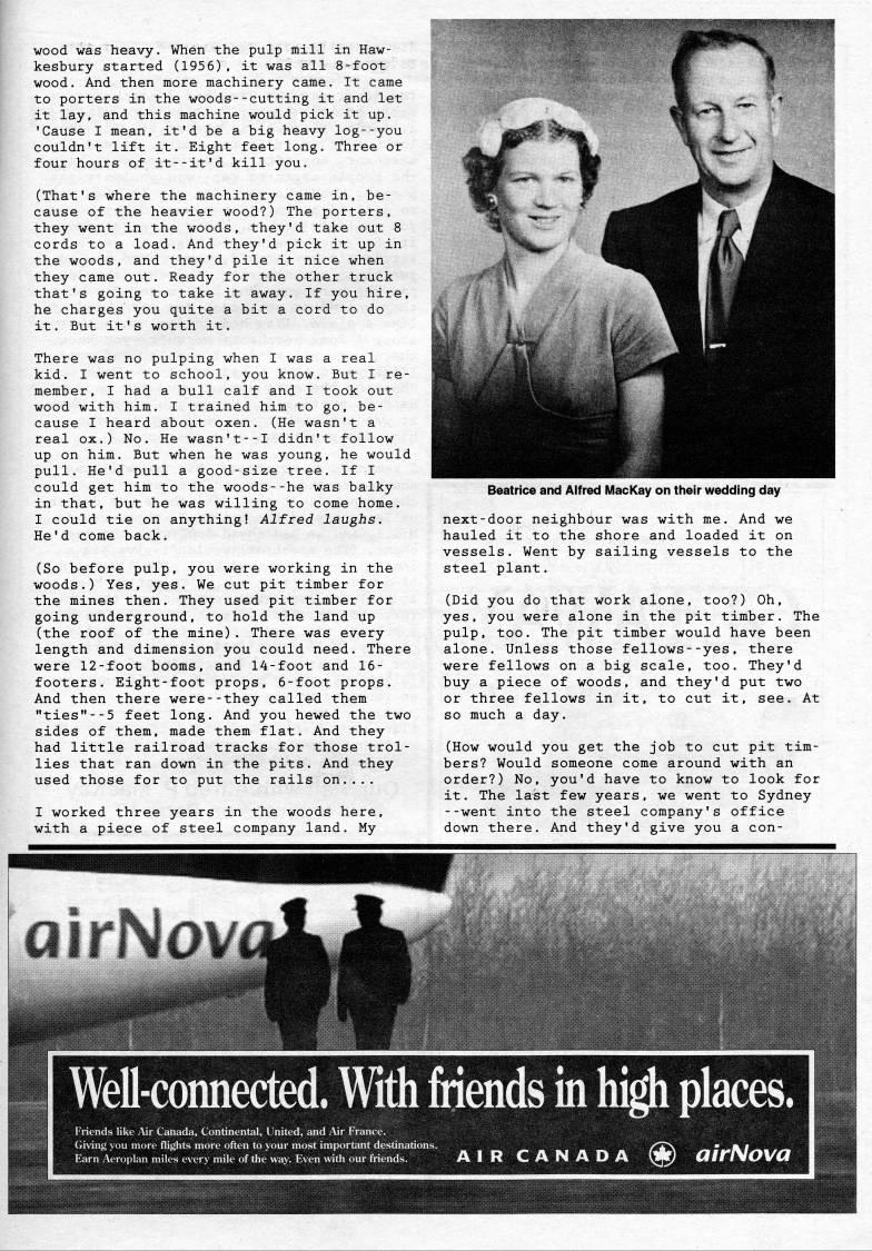 wood was heavy. When the pulp mill in Haw? kesbury started (1956) , it was all 8-foot wood. And then more machinery came. It came to porters in the woods--cutting it and let it lay, and this machine would pick it up. 'Cause I mean, it'd be a big heavy log--you couldn't lift it. Eight feet long. Three or four hours of it--it'd kill you. (That's where the machinery came in, be? cause of the heavier wood?) The porters, they went in the woods, they'd take out 8 cords to a load. And they'd pick it up in the woods, and they'd pile it nice when they came out. Ready for the other truck that's going to take it away. If you hire, he charges you quite a bit a cord to do it. But it's worth it. There was no pulping when I was a real kid. I went to school, you know. But I re? member, I had a bull calf and I took out wood with him. I trained him to go. be? cause I heard about oxen. (He wasn't a real ox.) No. He wasn't--I didn't follow up on him. But when he was young, he would pull. He'd pull a good-size tree. If I could get him to the woods--he was balky in that, but he was willing to come home. I could tie on anything! Alfred laughs. He'd come back. (So before pulp, you were working in the woods.) Yes, yes. We cut pit timber for the mines then. They used pit timber for going underground, to hold the land up (the roof of the mine). There was every length and dimension you could need. There were 12-foot booms, and 14-foot and 16- footers. Eight-foot props, 6-foot props. And then there were--they called them "ties"--5 feet long. And you hewed the two sides of them, made them flat. And they had little railroad tracks for those trol? lies that ran down in the pits. And they used those for to put the rails on.... I worked three years in the woods here, with a piece of steel company land. My Beatrice and Alfred MacKay on their wedding day next-door neighbour was with me. And we hauled it to the shore and loaded it on vessels. Went by sailing vessels to the steel plant. (Did you do that work alone, too?) Oh, yes, you were alone in the pit timber. The pulp, too. The pit timber would have been alone. Unless those fellows--yes, there were fellows on a big scale, too. They'd buy a piece of woods, and they'd put two or three fellows in it, to cut it, see. At so much a day. (How would you get the job to cut pit tim? bers? Would someone come around with an order?) No, you'd have to know to look for it. The last few years, we went to Sydney --went into the steel company's office down there. And they'd give you a con- Well-connected. With friends in high places. AIR CANADA ' OitNova
