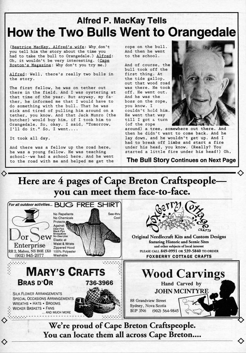 Alfred P. MacKay Tells How the Two Bulls Went to Orangedale (Beatrice MacKay. Alfred's wife: Why don't you tell him the story about the time you had to take the bull to Orangedale.) Alfred: Oh, it wouldn't be very interesting. (Cape Breton's Magazine: Why don't you try me.) Alfred: Well, there's really two bulls in the story. The first fellow, he was on tether out there in the field. And I was oystering at that time of the year. But anyway, my fa? ther, he informed me that I would have to do something with the bull. That he was sick and tired of pulling him around on a tether, you know. And that Jack Munro (the butcher) would buy him, if I took him to Orangedale. So, okay. I said, "Tomorrow, I'll do it." So, I went.... It took all day. And there was a fellow up the road here, he was a young fellow. He was teaching school--we had a school here. And he went to the road with me and helped me get the rope on the bull. And then he went to the school. And of course, the] bull took off the first thing. At the tide gallop, out that wood road was there. He took | off. He went out. And he was the boss on the rope, you know. I couldn't hold him. He went that way till I got a turn (of the rope around) a tree, somewhere out there. And then he didn't want to come back. And he lay down, and he wouldn't get up. And I had to break off limbs and start a fire under his head, you know. (Really? You started a little fire under his head!) Oh, The Bull Story Continues on Next Page O' Here are 4 pages of Cape Breton Craftspeople • you can meet them face-to-face* • O fPor all outdoor activities... BUC3 FREE SHIRTl See-thru Coo Enterprise Black Mosquitoes No-See-Ums Elastic at Waist & Wrists Zippered Hood RR 2, Mabou, NS BOE 1X0 100% Polyester (902) 945-2077 Washable O O Marys Crafts Bras d'Or Silk Flower arrangements Special Occasions arrangements Wreaths • hats • Brooms Wicker baskets • Fans | ... AND MUCH MORE <:TiArrs Original Needlecraft Kits and Custom Designs featuring Historic and Scenic Sites and odier subjects of local interest PLEASE CALL 849-0991 OR 539-5840 to order FOXBERRY COTTAGE CRAFTS Wood Carvings Hand Carved by JOHNMCINTYRE 88 Grandview Street Sydney, Nova Scotia ' " *- BIP 3N6 (902) 564-9845 %N'3' We're proud of Cape Breton Craftspeople. You can locate them all across Cape Breton.., O