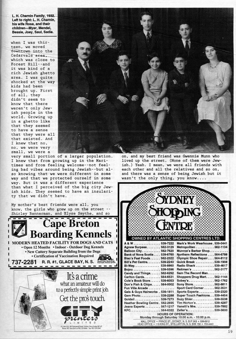 Published by Ronald Caplan on 1994/6/1 (284 reads)L. H. Chernin Family, 1932. Left to right: L. H. Chernin, his wife Rose, and their children • Myer, lUlendel, Bessie, Joey, Saul, Sadie. when I was thir? teen, we moved downtown into the Cedarvale area, which was close to Forest Hill--and it was kind of a rich Jewish ghetto area. I was quite shocked at the way kids had been brought up. First of all, they didn't seem to know that there weren't only Jew? ish people in the world. Growing up in a ghetto like that they seemed to have a sense that they were all that existed. And I knew that no, no, we were very small, we were a very small portion of a larger population. I knew that from growing up in the Mari? times and from feeling welcome--not feel? ing bad vibes around being Jewish--but al? so knowing that we were different in some way and that we protected ourself in some way. But it was a different experience than what I perceived of the big city Jew? ish kids. They seemed to have an insulari? ty that we didn't have. My mother's best friends were all, you know, the girls who grew up on the street -- Shirley Bannerman, and Elyse Smythe, and so on, and my best friend was Gwennie Munn who lived up the street. (None of them were Jew? ish.) Yeah. I mean, we were all friends with each other and all the relatives and so on, and there was a sense of being Jewish but it wasn't the only thing, you know.... Cape Breton Boarding Kennels MODERN HEATED FACILITY FOR DOGS AND CATS • Open 12 Months • Indoor - Outdoor Dog Kennels • New Cattery Separate Building from the Dogs • Certification of Vaccination Required JSgi' 737-2281 R- R- #i, glace bay, n. s. iT.vs: Itsacrime what an amateur will do to a perfectly simple print job. Get the pros touch A&W; 539-7222 Mark's Work Wearhouse. Agnew Surpass 562-3129 Metropolitan Balloon City 562-7620 Munroe's Barber Shop.., Bank of Nova Scotia 539-6760 Northern Reflections Biao's Fast Foods 562-2322 Olympic Shoe Repair Bill's Pet Centre 539-2243 Quick Break Bi-Way 539-8860 Radio Shack Bojou 539-5596 Reitman's Candy and Things 562-6292 Sam The Record Man Carlton Cards 564-6531 Shoppers Drug Mart Cole's Book Store 539-6053 Sobey's Don's Fish & Chips 564-0002 Sony Store. Fun Villa Arcade Sport Card Corner Gals & Guys Hairworks . 539-1811 Sports Experts , Gem Photo 539-2288 Super Touch Fashions.., Goldsil 539-7273 Suzy Shier Heather Bowling Centre. 562-2695 Tim Horton's Jeans Experts 567-1217 Vanelli's Mrs KFC 564-6322 Zeller's HOURS OF OPERATION: Monday through Saturday 10:00 a.m. -10:00 p.m. 539-0441 562-1134 564-6788 564-8112 539-1908 539-4617 562-3177 562-1144 562-1762 562-8811 562-3531 539-2320 539-4454 539-5538 539-4287 539-7882 539-5600