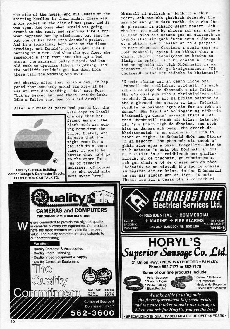 Published by Ronald Caplan on 1994/6/1 (269 reads)the side of the house. And Big Jessie of the Knitting Needles in their midst. There was a big pocket on the side of her gown, and it was open. And once when Donald was going around in the reel, and spinning like a top, what happened but by mischance, but that he put one of his feet into Jessie's pocket. And in a twinkling, both were on the floor crawling, and Donald's foot caught like a herring in a net. And when she got free, she resembled a ship that came through a bad storm, the mainsail badly ripped. And Don? ald took to upstairs like a lightning, and the bailiffs couldn't get him down from there till the wedding was over. And shortly after that notable day, it hap? pened that somebody asked Big Rory if he was at Donald's wedding. "No," says Rory, "but my beaver hat was there, and it looks like a fellow that was on a bad drunk!" After a number of years had passed by, the wife says to Donald one day that her friend Anna of the Blacksmith was com? ing home from the United States, and in case that she might come for a ceilidh in a short time, it would be better that he'd go to the store for a jug of treacle-- ' .. ' ' .... ?? molasses. of course Quality Cameras Building, I '-' • '?' ' . ., , comer Georges Dorchester Street '? ''' '?'1' '''' PEOPLE YOU CAN TALK TO. ?? 'ome sweet bread D6mhnall ri mullach a' bhibhir a chur ceart, ach sin cha ghabhadh deanamh; bha car m6r ann gu'n dara taobh, is e cho Ikn de phreasan ri adhairc seann mhairt. Ach cha be' sin cuid bu mhiosa ach mar a bha e tuiteam sios air aodann gus an cuireadh an t-sr6n stad air gach darna ceum a dheanadh e, a chionn gun d'fhalbh an rola p'ipeir. 'N uair chunnaic Catriona a staid anns an robh D6mhnall, spion i am bibhir thar a chinn; chuir i neapaigeann am broinn na linig, is sp'rr i sin mu cheann e. Thug iad an aghaidh air tigh Dh6mhnaill is am piobaire a' cluich gu h-aigeanntach, "D6 chuireadh mulad ort oidhche do bhainnse?" 'N uair r'inig iad an ceann-uidhe bha Ddmhnall cho toilichte, cridheil, 's nach robh fios aige de dheanadh e ris fh'in. Bha e'n diiil gun robh a thrioblaidean uile seachad. Chuir e air na brdgan bainnse is bha e gluasad cho aotrom ri ian. Th6isich ruidhle na bainnse agus sin far an robh an danns'! Bha Niall a' Ghliogain ag r'dh--is b'ainmeil gu danns' e--nach fhaca e lei? thid Dh6mhnaill riamh air drlar. Leis cho l'n 's a bha'n tigh de dhaoine, cha robh 'ite an dannsa ach beag. Bha sreath de bhoirionnaich 'n an suidhe air fuirm an taobh an tighe, is Se6naid Mh6r nam Bioran 'n am meadhon. Bha p6ca m6r air taobh a' ghiiin aice agus a bhial fosgailte. Uair de na h-uairean 'n uair bha D6mhnall a' dol mu'n cuairt 's a' ruidhleadh mar ghille- mirein, gu d6 thachair, gu tubaisteach, ach gun chuir e t6 de chasan ann am p6ca Shednaid, is an tiotadh bha iad le ch'ile am m'garan air an ilrlar, is cas Dh6mhnaill an s's mar sgadan ann an lion. 'N uair fhuair ise air a casan bha i coltach ri camieiismF RESIDENTIAL -f COMIVIERCIAL 4- MARINE 4- FIRE ALARMS li <267 BADDECK NS BOEIBO NORTH SYDNEY! 794-8348 HORYL'S [Superior Sausage Co. jCtd. 21 Union Hwy. • NEW WATERFORD • B1H 4K4 Phone 862-7177 or 862-7178 Some of our fine products include: * Polish Sausage fi'''-'M * Calami * Kolbassa * Garlic Bologna MK'''''' * '?* Pepperoni * White Pudding 'P''% * Medium Hot Pepperoni * Black Pudding '''' * sliced Pizza Pepperoni We take pride in using only the finest government inspected meats, and the care it takes to make our sausages. When you ask for HoiyVs, you get the best. • SPECIALIZING IN QUALITY DELI MEATS FOR OVER 60 YEARS •