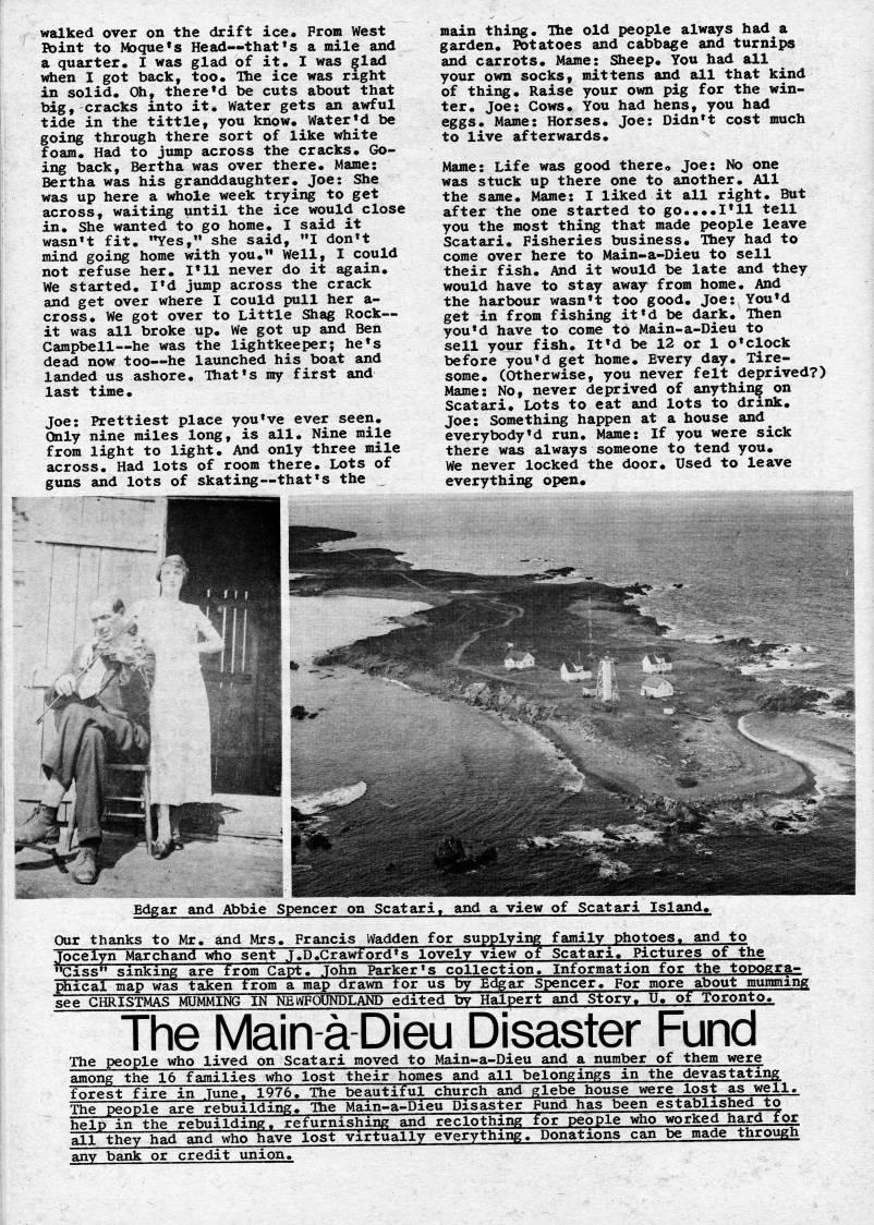 walked over on the drift ice. From West Point to Moque's Head • that's a mile and a quarter. I was glad of it. I was ??lad nrfaen I got back, too. Ihe ice was right in solid. Oh, there'd be cuts about that big, cracks into it. Water gets an awful tide in the tittle, you know. Water'd be going through there sort of like white foam. Had to jump across the cracks. Go? ing back. Bertha was over there. Mame: Bertha was his granddaughter. Joe: She was up here a whole week trying to get across, waiting until the ice would close in. She wanted to go home. I said it wasn't fit. "Yes," she said, "I don't mind goii' home with you." Well, I could not refuse her. I'll never do it again. We started. I'd jurap across the crack and get over where I could pull her a- cross. We got over to Little Shag Rock • it was all broke up. We got up and Ben Campbell • he was the lightkeeper; he's dead now too • he launched his boat and landed us ashore. That's ray first and last time. Joe: Prettiest place you've ever seen. Only nine miles long, is all. Nine raile frora light to light. And only three mile across. Had lots of room there. Lots of guns and lots of skating • that's the main thing. Ihe old people always had a garden. Potatoes and cabbage and turnips and carrots. Mame: Sheep. You had all your own socks, mittens and all that kind of thing. Raise your own pig for the win? ter. Joe: Cows. You had hens, you had eggs. Mame: Horses. Joe: Didn't cost much to live afterwards. Mame: Life was good there. Joe: No one was stuck up there one to another. All the sarae. Marae: I liked it all right. But after the one started to go....I'll tell you the most thing that made people leave Scatari. Fisheries business. Ihey had to come over here to Main-a-Dieu to sell their fish. And it would be late and they would have to stay away from home. And the harbour wasn't too good. Joe: You'd get in frora fishing it'd be dark. Then you'd have to come to Main-a-Dieu to sell your fish. It'd be 12 or 1 o'clock before you'd get home. Every day. Tire? some. (Otherwise, you never felt deprived?) Mame: No, never deprived of anything on Scatari. Lots to eat and lots to drink. Joe: Something happen at a house and everybody'd run. Mame: If you were sick there was always someone to tend you. We never locked the door. Used to leave everything open. gar and Abbie Spencer on Scatari, and a view of Scatari Island. Our thanks to Mr. and Mrs. Francis Wadden for su _____'' upplying faraily photoes. and to Jocelyn Marchand vtho sent J.D.Crawford's lovely view of Scatari. Pictures of the "Giss'' sinking are frora Capt. John Parker's collection. Inforraation for the to"bogra- phieal raap was taken frora a raap drawn tor us by Edgar Spencer. For raore about mumming see CHRISTMAS MUMMING IN NEWFOUNDLAND edited by Halpert and Story. U. of Toronto. The Main-a Dieu Disaster Fund The people who lived on Scatari moved to Main-a-Dieu and a nuraber of them were among the 16 families who lost their homes and all belongings in the devastating forest fire in June. 1976. The beautiful church and glebe house were lost as well. The people are rebuilding. Ihe Mam-a-Dieu Disaster Fund has been established to help in the rebuilding, refurnishing and reclothing for people who worked hardTor all they had and who have lost virtually everything. Donations can be raade through any bank or credit union.