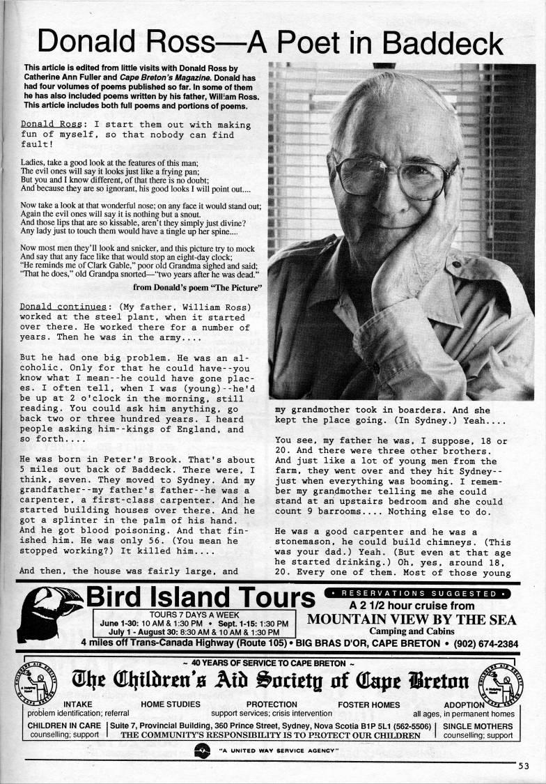 Published by Ronald Caplan on 1994/6/1 (727 reads)Donald Ross • A Poet in Baddeck This article is edited from little visits with Donald Ross by Catherine Ann Fuller and Cape Breton's Magazine. Donald has had four volumes of poems published so far. In some of them he has also included poems written by his father, William Ross. This article includes both full poems and portions of poems. Donald Ross: I start them out with making fun of myself, so that nobody can find fault! Ladies, take a good look at the features of this man; The evil ones will say it looks just like a frying pan; But you and I know different, of that there is no doubt; And because they are so ignorant, his good looks I will point out.... Now take a look at that wonderful nose; on any face it would stand out; Again the evil ones will say it is nothing but a snout. And those lips that are so kissable, aren't they simply just divine? Any lady just to touch them would have a tingle up her spine.... Now most men they'll look and snicker, and this picture try to mock And say that any face like that would stop an eight-day clock; "He reminds me of Clark Gable," poor old Grandma sighed and said; "That he does," old Grandpa snorted • "two years after he was dead." from Donald's poem "The Picture' Donald continues : (My father, William Ross) worked at the steel plant, when it started over there. He worked there for a number of years. Then he was in the army.... But he had one big problem. He was an al? coholic. Only for that he could have--you know what I mean--he could have gone plac es. I often tell, when I was (young)--he' be up at 2 o'clock in the morning, still reading. You could ask him anything, go back two or three hundred years. I heard people asking him--kings of England, and so forth.... He was born in Peter's Brook. That's about 5 miles out back of Baddeck. There were, I think, seven. They moved to Sydney. And my grandfather--my father's father--he was a carpenter, a first-class carpenter. And he started building houses over there. And he got a splinter in the palm of his hand. And he got blood poisoning. And that fin? ished him. He was only 56. (You mean he stopped working?) It killed him.... And then, the house was fairly large, and my grandmother took in boarders. And she kept the place going. (In Sydney.) Yeah.... You see, my father he was, I suppose, 18 or 20. And there were three other brothers. And just like a lot of young men from the farm, they went over and they hit Sydney-- just when everything was booming. I remem? ber my grandmother telling me she could stand at an upstairs bedroom and she could count 9 barrooms.... Nothing else to do. He was a good carpenter and he was a stonemason, he could build chimneys. (This was your dad.) Yeah. (But even at that age he started drinking.) Oh, yes, around 18, 20. Every one of them. Most of those young Bird Island Tours • ?'SSSSSS'' MOUNTAIN VIEW BY THE SEA Camping and Cabins 4 miles off Trans-Cafiada Highway (Route 105) * BIG BRAS D'OR, CAPE BRETON • (902) 674-2384 TOURS 7 DAYS A WEEK June1-30: 10 AM & 1:30 PM • Sept. 1-15:1:30 PM July 1 - August 30: 8:30 AM & 10 AM & 1:30 PM ~ 40 YEARS OF SERVICE TO CAPE BRETON • a| ?t|c (Hiiiihvm'B AiJi 'orietQ of (Hape Mntan INTAKE HOME STUDIES PROTECTION FOSTER HOMES ADOPTION probiem identification; referral support services; crisis intervention all ages, in permanent homes CHILDREN IN CARE I Suite 7, Provincial Building, 360 Prince Street, Sydney, Nova Scotia BIP 5L1 (562-5506) I SINGLE MOTHERS counselling; support I THE COMMUNITY'S RESPONSffilLITY IS TO PROTECT OUR CHILDREN I counselling; support '3 • *A UNITED WAV SERVICE AGENCY"