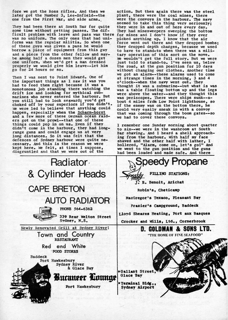fore we got the Ross rifles. And then we later got the Number 3, Lee-Enfield • the one frora the First War, and side arras.. They had been there at South Bar for quite sorae tirae without getting passes. Ihe dif? ficult problera with leave and pass was there was no uniforra. The only ones that had uni- forras was the regular railitia. So when one of these guys was given a pass he would borrow a piece of equipraent frora this guy and a piece from the other fellow and raay? be araong half a dozen raen they would get one uniforra. When we'd get a man dressed properly we would give him leave • let him go for 24 hours or so. Then I was sent to Point Edward. One of the important things as I saw it was you had to feed them right because it was a monotonous job standing there watching the drift ice and looking for mythical sub? marines who never entered the harbour. But you still had to look seaward| you'd get choked off by your superiors if you didn't. We were led to believe that anything could happen, especially when the Scharn-horst and a few more of these German ocean raid- ers got on the prowl • that one of these things could pop in on us. Even if they didn't corae in the harbour, they had long- range guns and could engage us at very long distances. So it was felt that the defences of Sydney harbour were quite ne? cessary. And this is the reason we were kept here, we felt, at tiraes I suppose, disgruntled and that we were out of the action. But then again there was the steel plant, there were the coal raines, there were the convoys in the harbour. The navy seeraed to take this thing very seriously; they were in and out of here every day. They had rainesweepers sweeping the bottom for raines and I don't knoiv if they ever picked anything up. I know that the air force went out there and they dropped bombs; they dropped depth charges, because we used to have to stand-to when there was a mili? tary operation of this sort on the move. We wouldn't get the full story. But we were just told to stand-to. I've seen us, below the road, at the gun position for 10 days without changing our clothes. Another time we got an alarm • these alarms used to come at strange tiraes in the raorning, 3 and 4 o'clock • when the navy went out. They thought it was a submarine • but what is was was a table floating bottom up and the legs were above the water • and they thought this was periscopes. There were ships sunk • a- bout 4 railes fidm Low Point lighthouse, so if the eneray was on the bottora there, he could very easily sneak in with a convoy that was coraing through the boora gates • so we had to cover these convoys. I remeraber one Sunday raorning about quarter to six • we were in the washroom at South Bar shaving. And I heard a shell approach? ing frora the harbour. With half my face shaved and the other half with lather, I hollered, "Alarm, come on, let's gol" And we went to the gun position and the guns had been loaded and raade safe. And there Radiator- & Cylinder Heads CAPE BRETON AUTO RADIATOR PHONE 564-6362 339 Rear Welton Street Sydney, N.S. Newly Renovated Grill at Sydney RiverI Town and Country RESTAURANT Red ond White FOOD STORES Baddeck Port Hawkesbury Sydney River & Glace Bay Port Hawkesbury Speedy Propane FILLIJ?5 STATIONS: J' B. Benoit, Arichat Robin's, Cheticamp MacGregor's Texaco, Pleasant Bay Prazier's Campground, Baddeck Lloyd Sheares Heating, FOrt aux Basques Crocker and Wills?? Ltd., Comerbrook D. GOLDMAN & SONS LTD. "Tilt HOME OK FINE SEAFOOD" |??Gallant Street Glace Bay • Terninal Bldg.? Sydney Airport