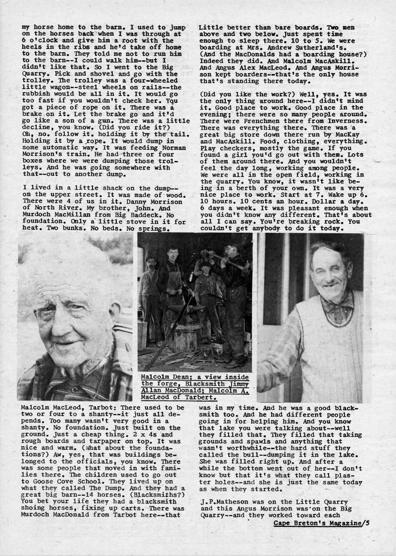 Published by Ronald Caplan on 1976/12/1 (339 reads)my horse home to the barn. I used to jump on the horses back when I was through at 6 o'clock and give him a root with the heels in the ribs and he'd take off home to the barn. They told me not to run him to the barn • I could walk him • but I didn't like that. So I went to the Big Quarry. Pick and shovel and go with the trolley. Ihe trolley was a four-wheeled little wagon--steel wheels on rails • the rubbish would be all in it. It would go too fast if you wouldn't check her. Yqu got a piece of rope oh it. There was a brake on it. Let the brake go and it'd go like a son of a gun. There was a little decline, you know. (Did you ride it?) Oh, no. follow it. holding it by the tail. Holding it by a .rope. It would dump in some automatic way. It was feeding Norman Morrison's train. He had three or four boxes where we were dumping those trol? leys. And he was going somewhere with that • out to another dump. I lived in a little shack on the dump- on the upper street. It was made of wood. There were 4 of us in it. Danny Morrison of North River. My brother, John. And Murdoch MacMillan from Big Baddeck. No foundation. Only a little stove in it for heat. Two bunks. No beds. No Little better than bare boards. Two men above and two below. Just spent time enough to sleep there. 10 to 5. Wfe were boarding at Mrs. Andrew Sutherland's. (And the MacDonalds had a boarding house?) Indeed they did. And Malcolm MacAskill. And Angus Alex MacLeod. And Angus Morri? son kept boarders • that's the only house that's standing there today. (Did you like the work?) Well, yes. It was the only thing around here • I didn't mind it. Good place to work. Good place in the evening; there were so many people around. There were Frenchmen there from Inverness. There was everything there. There was a great big store down there run by MacKay and MacAskill. Food, clothing, everything. Play checkers, mostly the game. If you found a girl you'd go out with them. Lots of them around there. And you wouldn't feel the day long, working among people. We were all in the open field, working in the quarry. You know, it wasn't like be? ing in a berth of your own. It was a very nice place to work. Start at 7. Wake up 6. 10 hours. 10 cents an hour. Dollar a day. 6 days a week. It was pleasant enough when you didn't know any different. That's about all I can say. You're breaking rock. You couldn't get anybody to do it today. Malcolm Dean; a view inside the forge. Blacksmith Jimmy Allan MacDonald; Malcolm A, MacLeod of Tarbert. Malcolm MacLeod, Tarbot: There used to be two or four to a shanty • it just all de? pends. Too many wasn't very good in a shanty. No foundation. Just built on the ground. Just a cheap thing, 2 x 4s and rough boards and tarpaper on top. It was nice and warm, (v lhat about the founda? tions?) Aw, yes, that was buildings be? longed to the officials, you know. There was some people that moved in with fami? lies there. The children used to go out to Goose Cove School, They lived up on what they called The Dump, And they had a great big barn • 14 horses, (Blacksmiths?) You bet your life they had a blacksmith shoing horses, fixing up carts. There was Murdoch MacDonald from Tarbot here • that was in my time. And he was a good black? smith too. And he had different people going in for helping him. And you know that lake you were talking about • well they filled that. They filled that taking grounds and spawls and anything that wasn't worthwhile • the hard stuff they called the bull • dumping it in the lake. She was filled right up. And after a while the bottom went out of her • I don't know but that it's what they call plas? ter holes • and she is just the same today as when they started, J.P,Matheson was on the Little Quarry and this Angus Morrison was'on the Big Quarry • and they worked toward each Cape Breton's Magazine/5