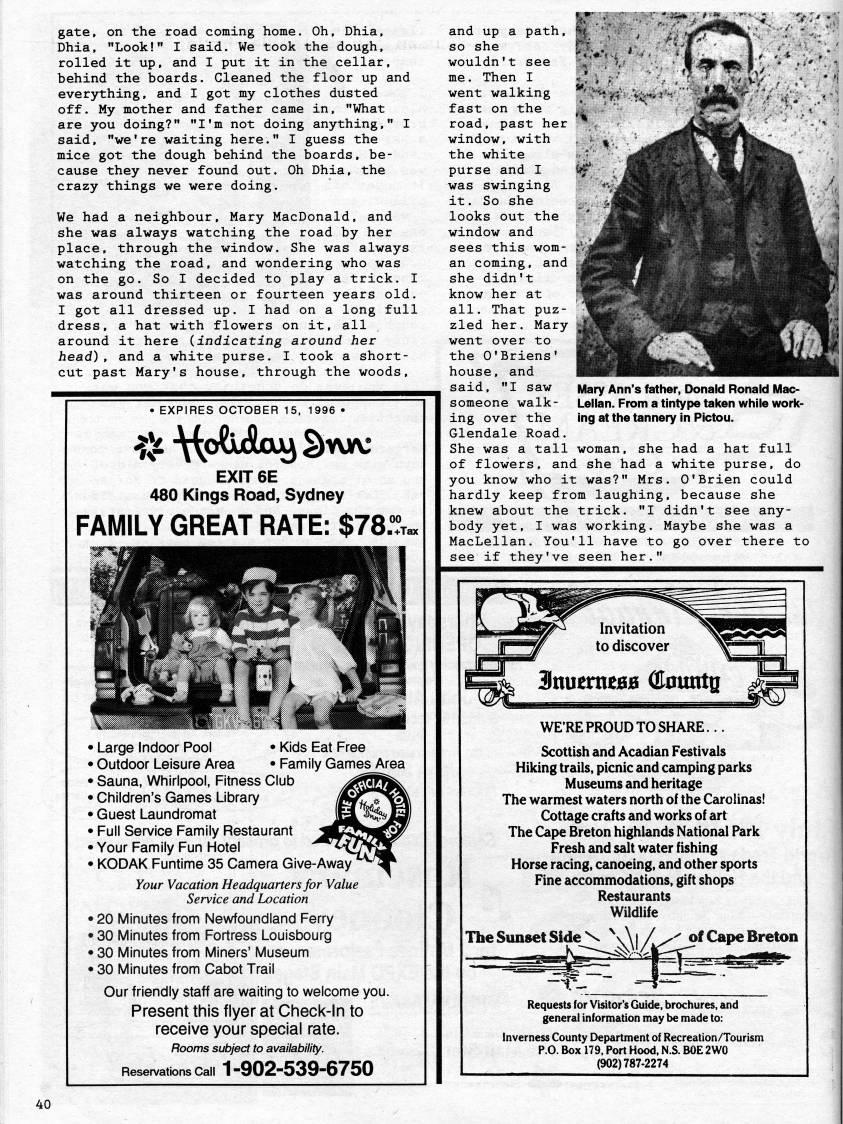 Published by Ronald Caplan on 1996/6/1 (212 reads)gate, on the road coming home. Oh, Dhia, Dhia, "Look!" I said. We took the dough, rolled it up, and I put it in the cellar, behind the boards. Cleaned the floor up and everything, and I got my clothes dusted off. My mother and father came in, "What are you doing?" "I'm not doing anything," I said, "we're waiting here." I guess the mice got the dough behind the boards, be? cause they never found out. Oh Dhia, the crazy things we were doing. We had a neighbour, Mary MacDonald, and she was always watching the road by her place, through the window. She was always watching the road, and wondering who was on the go. So I decided to play a trick. I was around thirteen or fourteen years old. I got all dressed up. I had on a long full dress, a hat with flowers on it, all around it here (indicating around her head), and a white purse. I took a short? cut past Mary's house, through the woods. • EXPIRES OCTOBER 15, 1996 • EXIT 6E 480 Kings Road, Sydney FAMILY GREAT RATE: $78." 00 +Tax • Large Indoor Pool • Kids Eat Free • Outdoor Leisure Area • Family Games_Area • Sauna, Whirlpool, Fitness Club • Children's Games Library • Guest Laundromat • Full Service Family Restaurant • Your Family Fun Hotel • KODAK Funtime 35 Camera Give-/ Your Vacation Headquarters for Value Service and Location • 20 Minutes from Newfoundland Ferry • 30 Minutes from Fortress Louisbourg • 30 Minutes from Miners' Museum • 30 Minutes from Cabot Trail Our friendly staff are waiting to welcome you. Present this flyer at Check-In to receive your special rate. Rooms subject to availability. Reservations Call 1 -902-539-6750 and up a path, so she wouldn't see me. Then I went walking fast on the road, past her window, with the white purse and I was swinging it. So she looks out the window and sees this wom? an coming, and she didn't know her at all. That puz? zled her. Mary went over to the O'Briens' house, and said, "I saw someone walk? ing over the Glendale Road. She was a tall woman, she had a hat full of flowers, and she had a white purse, do you know who it was?" Mrs. O'Brien could hardly keep from laughing, because she knew about the trick. "I didn't see any? body yet, I was working. Maybe she was a MacLellan. You'll have to go over there to see if they've seen her." Mary Ann's father, Donald Ronald Mac? Lellan. From a tintype taken while work? ing at the tannery in Pictou. WE'RE PROUD TO SHARE... Scottish and Acadian Festivals Hiking trails, picnic and camping parks Museums and heritage The warmest waters north of the Carolinas! Cottage crafts and works of art The Cape Breton highlands National Park Fresh and salt water fishing Horse racing, canoeing, and other sports Fine accommodations, gift shops Restaurants Wildlife The Sunset Side of Cape Breton Requests for Visitor's Guide, brochures, and general information may be made to: Inverness County Department of Recreation/Tourism P.O. Box 179. Port Hood, N.S. BOE 2W0 (902)787.2274