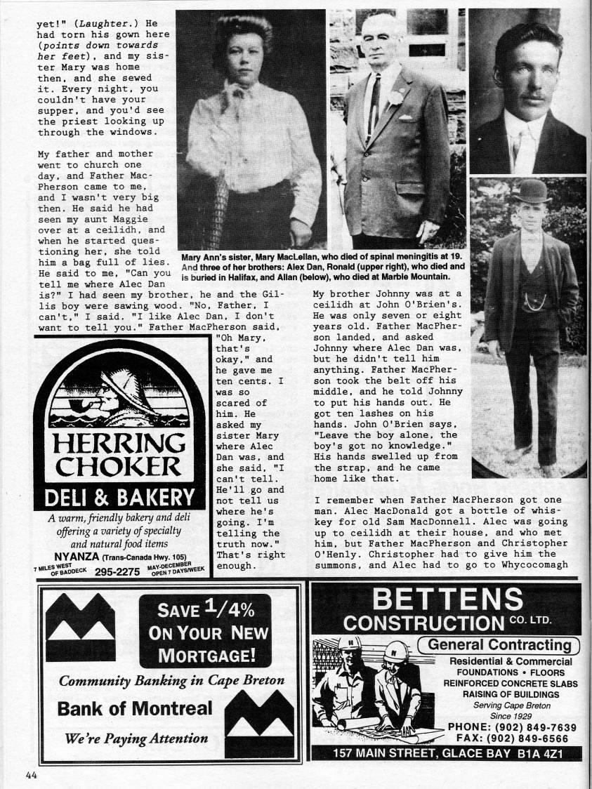 Published by Ronald Caplan on 1996/6/1 (235 reads)yet!" (Laughter.) He had torn his gown here (points down towards her feet), and my sis? ter Mary was home then, and she sewed it. Every night, you couldn't have your supper, and you'd see the priest looking up through the windows. My father and mother went to church one day, and Father Mac? Pherson came to me, and I wasn't very big then. He said he had seen my aunt Maggie over at a ceilidh, and when he started ques? tioning her, she told him a bag full of lies. He said to me, "Can you tell me where Alec Dan is?" I had seen my brother, he and the Gil? lis boy were sawing wood. "No, Father, I can't," I said. "I like Alec Dan, I don't want to tell you." Father MacPherson said, "Oh Mary, that's okay," and he gave me ten cents. I was so scared of him. He asked my sister Mary where Alec Dan was, and she said, "I can't tell. He'11 go and not tell us where he's going. I'm telling the truth now." That's right enough. Mary Ann's sister, Mary MacLellan, who died of spinal meningitis at 19. And three of her brothers: Alex Dan, Ronald (upper right), who died and is buried in Halifax, and Allan (below), who died at Marble Mountain. My brother Johnny was at a ceilidh at John O'Brien's. He was only seven or eight years old. Father MacPher? son landed, and asked Johnny where Alec Dan was, but he didn't tell him anything. Father MacPher? son took the belt off his middle, and he told Johnny to put his hands out. He got ten lashes on his hands. John O'Brien says, "Leave the boy alone, the boy's got no knowledge." His hands swelled up from the strap, and he came home like that. A warm, friendly bakery and deli offering a variety of specialty and natural food items NYANZA fTrans-Canada Hwy. 105) '??"'S.tS?? 295-2275 "SJSfS?lS,e? I remember when Father MacPherson got one man. Alec MacDonald got a bottle of whis? key for old Sam MacDonnell. Alec was going up to ceilidh at their house, and who met him, but Father MacPherson and Christopher O'Henly. Christopher had to give him the summons, and Alec had to go to Whycocomagh tt SaveV4% On Your New Mortgage! Community Banking in Cape Breton Bank of Montreal We*re Paying Attention ape nreton BETTENS CONSTRUCTION'=?"'' [ General Contracting' Residential & Commercial FOUNDATIONS • FLOORS REINFORCED CONCRETE SLABS RAISING OF BUILDINGS Serving Cape Breton Since 1929 PHONE: (902) 849-7639 FAX: (902) 849-6566 157 MAIN STREET, GLACE BAY B1A 4Z1