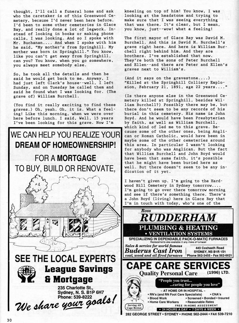 thought, I'll call a funeral home and ask who the caretaker is of this Greenwood Ce? metery, because I'd never been here before. I'd been to some other cemeteries in Glace Bay, and really done a lot of legwork. In? stead of looking in books or making phone calls, I was looking. And so I spoke with Mr. Buchanan.... And when I spoke with him he said, "My mother's from Springhill. My mother was born in Springhill." You know, like you can't get away from Springhill, can you? You know, when you go somewhere, you always meet somebody else. So, he took all the details and then he said he would get back to me. Anjrway, I had just left Clark's house--well, I left Sunday, and on Tuesday he called them and said he found what I was looking for. (The grave of) William Burchell. (You find it really exciting to find these graves.) Oh, yeah. Oh, it is. What a feel? ing! Like this morning, when we were over here before lunch. I said. Well, 15 years I've been looking for this grave. Now I'm WE CAN HELP YOU REALIZE YOUR DREAM OF HOMEOWNERSHIP! FOR A MORTGAGE TO BUY, BUILD OR RENOVATE, kneeling on top of him! You know, I was looking at the headstone and trying to make sure that I was seeing everything that was there. It's clear, but I mean, you know, just--wow! what a feeling! The first mayor of Glace Bay was David M. Burchell. And this is David M. Burchell's grave right here. And here is William Bur? chell right behind him. And they are brothers. I've established that now. They're both the sons of Peter Burchell and Ellen--and there are Peter and Ellen's graves next to William's. (And it says on the gravestone....) "Killed at the Springhill Colliery Explo? sion, February 21, 1891, age 22 years...." (Is there anyone else in the Greenwood Ce? metery killed at Springhill, besides Wil? liam Burchell?) Possibly there may be, but there don't seem to be any records of his burial in this cemetery. His name is John Boyd. And he would have been Presbyterian by faith, as well as William Burchell, which kind of led me to this grave. Be? cause some of the other ones, being Angli? can or Roman Catholic, would have been in maybe some of the other cemeteries around this area. In particular I wasn't looking for anybody who was Anglican. But the fact that William Burchell and John Boyd would have been that same faith, it's possible that he might have been buried here as well. But there doesn't seem to be any in? dication of it yet. I haven't given up. I'm going to the Hard? wood Hill Cemetery in Sydney tomorrow.... I'm going to go over there tomorrow morning and see if there's something there. There's a John Boyd (living) here in Glace Bay that I'm in touch with today, who's one of the SEE THE LOCAL EXPERTS League Savings 8 Mortgage 235 Charlotte St., Sydney, N.S. BIP6H7 Phone:539-8222 A. / Ross RUDDERHAM PLUMBING & HEATING • VENTILATION SYSTEMS SPECIALIZING IN DEPENDABLE PACK-O-MATIC FURNACES Replacements also available in any make ot furnace! Sales & service for world famous ., • _ T TTZ T~ T' , '''' - V I 443 Coxheath Road Buderus Cast Iron sydney,nsbirisi coal, wood and oil fired furnaces ' Phone 562-3455 ?? Fax 562-6621 CAPE CARE SERVICES Quality Personal Care ('''s) ltd. "People you trust... ...caring for people you love' ~ AT HOME OR IN HOSPITAL - • RN's (and RN Foot Care Specialists) • CNA's • Blood Work • Screened • Bonded • Insured • Home Care Workers • Reasonable Rates /'Serving All' FREE IN-HOME ASSESSMENT KaElIl5l22J MHI!MII:kfJ.yA'JHM.M'i=f.l'.Ud=r??a 282 GEORGE STREET • SYDNEY • PHONE 562-2444 • FAX 539-7210