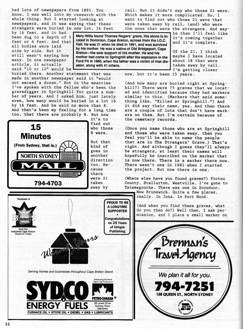 had lots of newspapers from 1891. You know, I was well into my research with the whole thing. But I started looking at newspapers, and it was saying that these strangers were buried in one lot, 16 feet by 16 feet, and it had been dug to a depth of 5 feet or 6 feet. And that all bodies were laid side by side. But it still wasn't saying how many. In one newspaper article, it actually said "10 or 12" would be buried there. Another statement that was made in another newspaper said it "would not exceed a dozen." But in the meantime I've spoken with the fellow who's been the gravedigger in Springhill for quite a num? ber of years. And I asked him, just lately even, how many would be buried in a lot 16 by 16 feet. And he said no more than 8. And that's been my feeling for a long time, too, that there are probably 8. But now it's to find out who those were. Mary Willa found Thomas Rogers' grave. His stone is lo? cated in Dominion, Cape Breton, across from the I.O.C. Hall. He was 21 when he died in 1891, and was survived by his mother. He was a native of Old Bridgeport, Cape Breton • the sole support of his mother. He and his mother had come to Springhill after the explosion in the Ford Pit in 1880, when his father was a victim of that dis? aster, along with 41 others. rail. But it didn't say who those 21 were. Which makes it more complicated. So, I want to find out who those 21 were that were taken away by rail, (and) who were the ones that were the strangers. And may? be then I'll feel like it's coming together and it's complete. now, but it's been Of the 21, I think maybe I have located about 18 that were taken away by rail. I'm getting closer 15 years. 15 Minutes (From Sydney, that Is.) I NORTH SYDNEY ' 794-4703 But that kind of goes in another direction too. Be? cause there were 21 taken away by (And how many are buried right at Spring? hill?) There were 75 graves that we locat? ed and identified because they had markers similar to this. (Markers that said some? thing like, "Killed at Springhill.") And it did say their name, yes. And then there are a couple of lots that don't have mark? ers on them. But I'm certain because of the cemetery records. (Once you name those who are at Springhill and those who were taken away, then you feel you'll be able to name the people that are in The Strangers' Grave.) That's right. And although I guess they'll always be strangers, at least their names will hopefully be inscribed on the marker that is now there. There is a marker there now. There wasn't one in 1981 when I started the project. But now there is one. (Where else have you found graves?) Pictou County. Stellarton, Westville. I've gone to Tatamagouche. There was one in Scoudouc, New Brunswick. Quite a few places, really. In lona. In Port Hood. from the Industrial Cape Breton Board of Trade Serving homes and businesses throughout Cape Breton Island Distributing the White ''''''''B ''HH''B''. '''Bh '''''' Maple Products SYDEOi' 'y ?? '''gi'P''r PETRa(ANADA