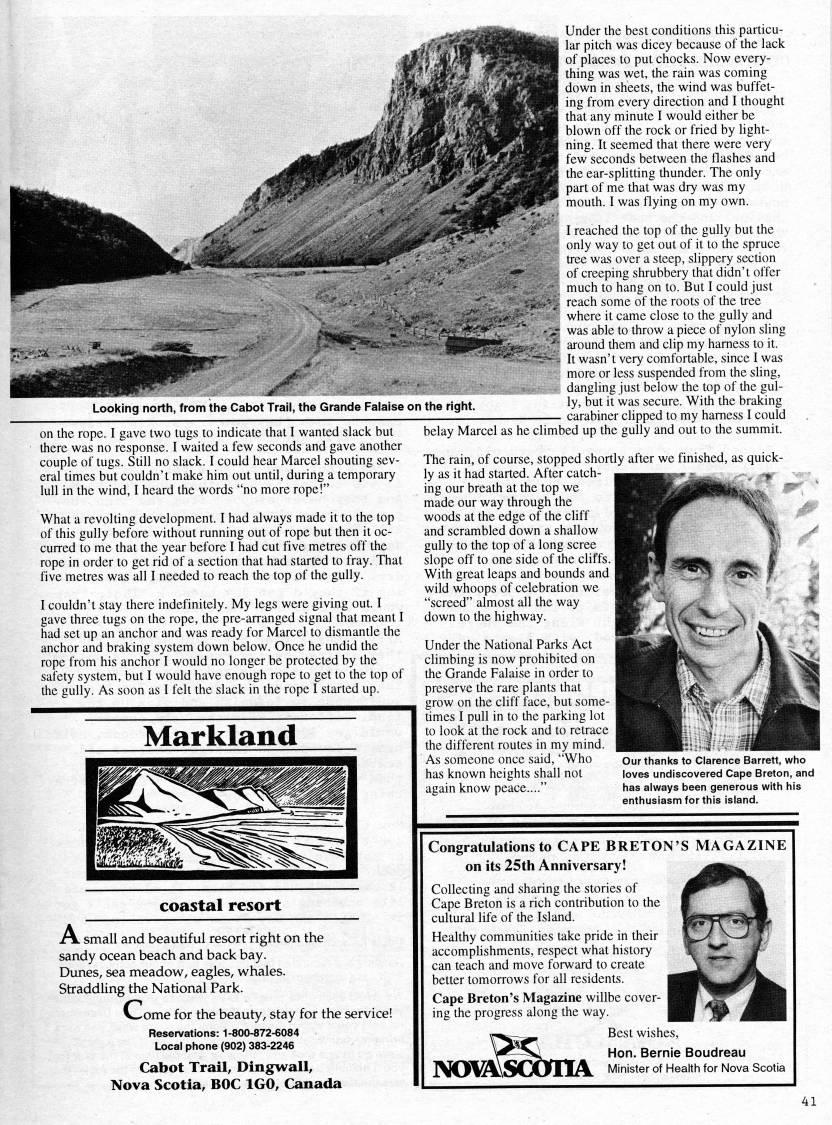 Looking north, from the Cabot Trail, the Grande Falaise on the right on the rope. I gave two tugs to indicate that I wanted slack but there was no response. I waited a few seconds and gave another couple of tugs. Still no slack. I could hear Marcel shouting sev? eral times but couldn't make him out until, during a temporary lull in the wind, I heard the words "no more rope!" What a revolting development. I had always made it to the top of this gully before without running out of rope but then it oc? curred to me that the year before I had cut five metres off the rope in order to get rid of a section that had started to fray. That five metres was all I needed to reach the top of the gully. I couldn't stay there indefinitely. My legs were giving out. I gave three tugs on the rope, the pre-arranged signal that meant I had set up an anchor and was ready for Marcel to dismantle the anchor and braking system down below. Once he undid the rope from his anchor I would no longer be protected by the safety system, but I would have enough rope to get to the top of the gully. As soon as I felt the slack in the rope I started up. Under the best conditions this particu? lar pitch was dicey because of the lack of places to put chocks. Now every? thing was wet, the rain was coming down in sheets, the wind was buffet? ing from every direction and I thought that any minute I would either be blown off the rock or fried by hght? ning. It seemed that there were very few seconds between the flashes and the ear-sphtting thunder. The only part of me that was dry was my mouth. I was flying on my own. I reached the top of the gully but the only way to get out of it to the spruce tree was over a steep, slippery section of creeping shrubbery that didn't offer much to hang on to. But I could just reach some of the roots of the tree where it came close to the gully and was able to throw a piece of nylon sling around them and clip my harness to it. It wasn't very comfortable, since I was more or less suspended from the shng, dangling just below the top of the gul? ly, but it was secure. With the braking carabiner clipped to my harness I could Markland coastal resort J small and beautiful resort right on the sandy ocean beach and back bay. Dunes, sea meadow, eagles, whales. Straddling the National Park. V'ome for the beauty, stay for the service! Reservations: 1-800-872-6084 Local phone (902) 383-2246 Cabot Trail, Dingwall, Nova Scotia, BOC IGO, Canada belay Marcel as he climbed up the gully and out to the summit. The rain, of course, stopped shortly after we finished, as quick? ly as it had started. After catch? ing our breath at the top we made our way through the woods at the edge of the chff and scrambled down a shallow gully to the top of a long scree slope off to one side of the cliffs. ] With great leaps and bounds and wild whoops of celebration we "screed" almost all the way down to the highway. Under the National Parks Act climbing is now prohibited on the Grande Falaise in order to preserve the rare plants that grow on the cliff face, but some? times I pull in to the parking lot to look at the rock and to retrace the different routes in my mind. As someone once said, "Who our thanks to Clarence Barrett, who has known heights shall not loves undiscovered Cape Breton, and again know peace...." has always been generous with his enthusiasm for this island. Congratulations to CAPE BRETON'S MAGAZINE on its 25th Anniversary! Collecting and sharing the stories of Cape Breton is a rich contribution to the cultural life of the Island. Healthy communities take pride in their accomphshments, respect what history can teach and move forward to create better tomorrows for all residents. Cape Breton's Magazine willbe cover? ing the progress along the way. ivomsGonA Best wishes, Hon. Bernie Boudreau Minister of Health for Nova Scotia