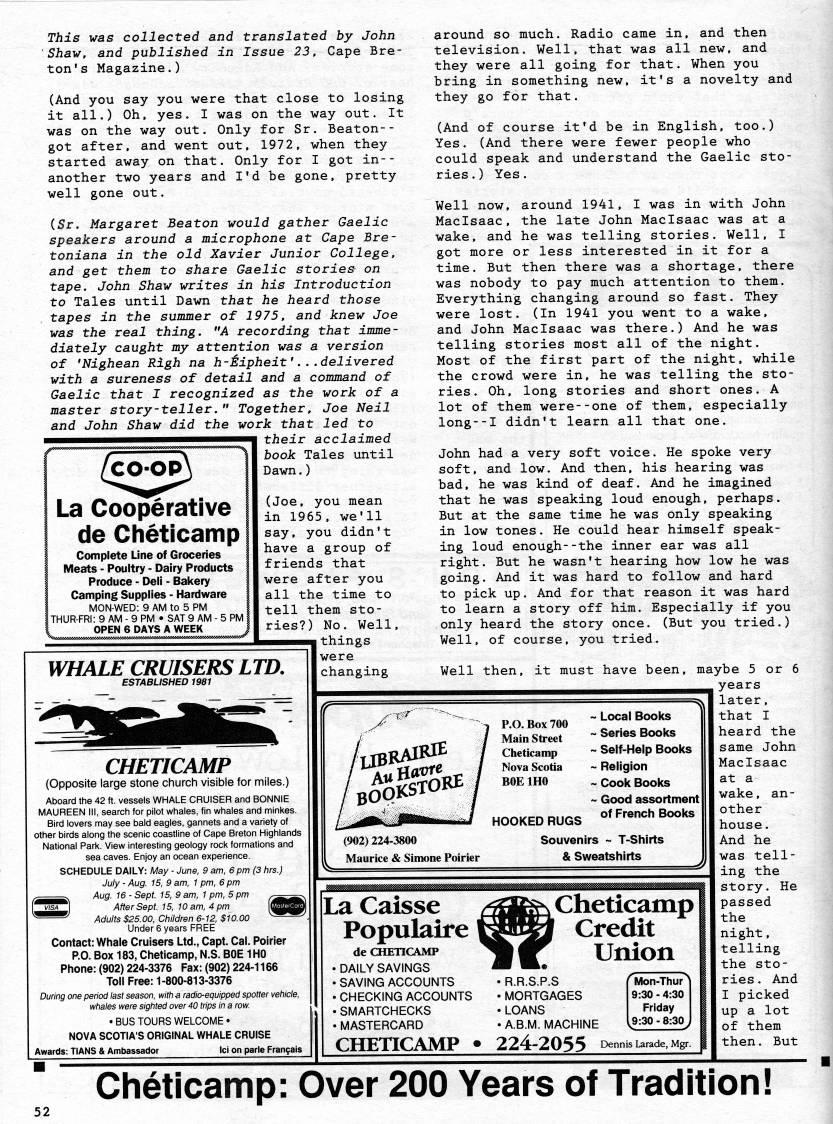Published by Ronald Caplan on 1996/12/1 (209 reads)This was collected and translated by John Shaw, and published in Issue 23, Cape Bre? ton's Magazine.) (And you say you were that close to losing it all.) Oh, yes. I was on the way out. It was on the way out. Only for Sr. Beaton-- got after, and went out, 1972, when they started away on that. Only for I got in-- another two years and I'd be gone, pretty well gone out. {Sr. Margaret Beaton would gather Gaelic speakers around a microphone at Cape Bre? toniana in the old Xavier Junior College, and get them to share Gaelic stories on tape. John Shaw writes in his Introduction to Tales until Dawn that he heard those tapes in the summer of 1975, and knew Joe was the real thing. "A recording that imme? diately caught my attention was a version of 'Nighean Righ na h-tipheit'...delivered with a sureness of detail and a command of Gaelic that I recognized as the work of a master story-teller." Together, Joe Neil and John Shaw did the work that led to their acclaimed La Cooperative de Cheticamp Complete Line of Groceries Meats - Poultry - Dairy Products Produce - Deli - Bakery Camping Supplies - Hardware MON-WED: 9 AM to 5 PM THUR-FRI: 9 AM - 9 PM • SAT 9 AM - 5 PM OPEN 6 DAYS A WEEK WHALE CRUISERS LTD. ESTABLISHED 1981 book Tales until Dawn.) (Joe, you mean in 1965, we'll say, you didn't have a group of friends that were after you all the time to tell them sto? ries?) No. Well, things were changing CHETICAMP (Opposite large stone church visible for miles.) Aboard the 42 ft. vessels WHALE CRUISER and BONNIE MAUREEN III, search for pilot whales, fin whales and minkes. Bird lovers may see bald eagles, gannets and a variety of other birds along the scenic coastline of Cape Breton Highlands National Park. View interesting geology rock formations and sea caves. Enjoy an ocean experience. SCHEDULE DAILY: May - June, 9 am, 6 pm (3 hrs.) July - Aug. 15, 9 am, 1 pm, 6 pm f'''' Aug. 16 - Sept. 15, 9 am, 1 pm, 5 pm l'w''j After Sept. 15, 10 am, 4 pm Adults $25.00. Children 6-12, $10.00 Under 6 years FREE Contact: Whale Cruisers Ltd., Capt. Cal. Poirier P.O. Box 183, Cheticamp, N.S. BOE IHO Phone: (902) 224-3376 Fax: (902) 224-1166 Toll Free: 1-800-813-3376 During one period last season, with a radio-equipped spotter vehicle, whales were sighted over 40 trips in a row. • BUS TOURS WELCOME • NOVA SCOTIA'S ORIGINAL WHALE CRUISE Awards: TIANS & Ambassador lei on parle Frangais /ilBRAl' (902) 224-3800 Maurice & Simone Poirier La Caisse Populaire de CHETICAMP • DAILY SAVINGS • SAVING ACCOUNTS • CHECKING ACCOUNTS • SMARTCHECKS • MASTERCARD CHETICAMP - around so much. Radio came in, and then television. Well, that was all new, and they were all going for that. When you bring in something new, it's a novelty and they go for that. (And of course it'd be in English, too.) Yes. (And there were fewer people who could speak and understand the Gaelic sto? ries .) Yes. Well now, around 1941, I was in with John Maclsaac, the late John Maclsaac was at a wake, and he was telling stories. Well, I got more or less interested in it for a time. But then there was a shortage, there was nobody to pay much attention to them. Everything changing around so fast. They were lost. (In 1941 you went to a wake, and John Maclsaac was there.) And he was telling stories most all of the night. Most of the first part of the night, while the crowd were in, he was telling the sto? ries. Oh, long stories and short ones. A lot of them were--one of them, especially long--I didn't learn all that one. John had a very soft voice. He spoke very soft, and low. And then, his hearing was bad, he was kind of deaf. And he imagined that he was speaking loud enough, perhaps. But at the same time he was only speaking in low tones. He could hear himself speak? ing loud enough--the inner ear was all right. But he wasn't hearing how low he was going. And it was hard to follow and hard to pick up. And for that reason it was hard to learn a story off him. Especially if you only heard the story once. (But you tried.) Well, of course, you tried. Well then, it must have been, maybe 5 or 6 I years later, that I heard the same John Maclsaac at a wake, an? other house. And he was tell? ing the story. He passed the night, telling the sto? ries . And I picked up a lot of them then. But • .O. Box 700 -Local Books lain Street ~ Series Books :heticamp ~ Self-Help Books Nova Scotia ~ Religion BOE IHO . Cook Books ' Good assortment HOOKED RUGS ?* F'-'n'h Books Souvenirs ~ T-Shirls & Sweatshirts Cheticamp Credit Union • R.R.S.P.S • MORTGAGES • LOANS • A.B.M. MACHINE 224-2055 Dennis Larade, Mgr. Mon-Thur 9:30 - 4:30 Friday '9:30 - 8:30j 52 Cheticamp: Over 200 Years of Tradition!
