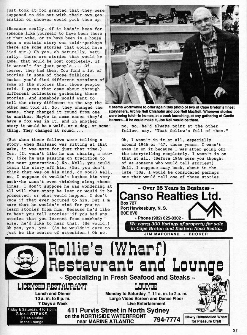 Published by Ronald Caplan on 1996/12/1 (145 reads)just took it for granted that they were supposed to die out with their own gen? eration or whoever would pick them up. (Because really, if it hadn't been for someone like yourself to have been there ' at that wake, or to have been in a house when a certain story was told--perhaps there are some stories that would have died out.) Oh yes, oh naturally, natu? rally, there are stories that would be gone, that would be lost completely, if it weren't for just people.... Of course, they had them. You find a lot of stories in some of those folklore books; you'd find different versions of some of the stories that those people told. I guess that came about through different collectors gathering those stories. And somebody would want to tell the story different to the way the other man told it. So, they changed the names, they changed it round from one to another. Maybe in some cases they'd have a fox was in it, and in another story it would be a wolf, or a dog, or some thing. They changed it roind.... '''' * ' ''m n seems worthwhile to offer again this photo of two of Cape Breton's finest storytellers, Archie Neil Chishoim and Joe Neil MacNeil. Wherever stories were being told • in homes, at a book launching, at any gathering of Gaelic learners • if he could make it, Joe Neil would be there. (But when these fellows were telling a story, when Maclsaac was sitting at that wake, it was more for just that time.) Yes. (It wasn't like he was sharing a sto? ry, like he was passing on tradition to the next generation.) No. Well, you could learn the story off him. (But you don't think that was on his mind, do you?) Well, no, I suppose it wouldn't bother him very much--he wasn't even thinking along those lines. I don't suppose he was wondering at all will that story be lost or would it be preserved, or what would happen. I don't know if that ever occured to him. But I'm sure that he wouldn't mind for you to learn stories from him. Because he'd like to hear you tell stories--if you had any stories that you learned from somebody else, he'd like to hear that. (He would.) Oh yes, yes, yes. (So he wouldn't care to just be the centre of attention.) Oh no. no, no, he'd always point at the other fellow, say, "That fellow's full of them." Oh, I wasn't in it at all, especially around 1946 or '47, those years. I wasn't even in on it because I was after going off the storytelling completely. I wasn't in on that at all. (Before 1946 were you thought of as someone who would tell stories?) Well, I suppose away back, about in the late '30s, I would be considered perhaps one that would tell one of those stories. ~ Over 25 Years in Business ~ Canso Realties Ltd. Box 727 Port Hawkesbury, N. S. BOE 2V0 ?? Phone (902) 625-0302 ? We carry 300 listings of property for sale in Cape Breton and Eastem Nova Scotia. JiiA iUIARCHAND (' Rome's (WharD Restaurant and Lounge ~ Specializing in Fresh Seafood and Steaks -' LICENSED RESTi'URMT LOUNCS Monday to Saturday * 11 a. m. to 2 a. m. Large Video Screen and Dance Floor Live Entertainment riday & Saturday, 4 to 9 p.m 2-for-1 STEAKS in the Lounge Lunch and Dinner 10 a. m. to 9 p. m. 7 Days a Week 411 Purvis Street in North Sydney on the NORTHSIDE WATERFRONT • . ___- near MARINE ATLANTIC 7'4-7774 Newly Remodelled Wharf for Pleasure Craft