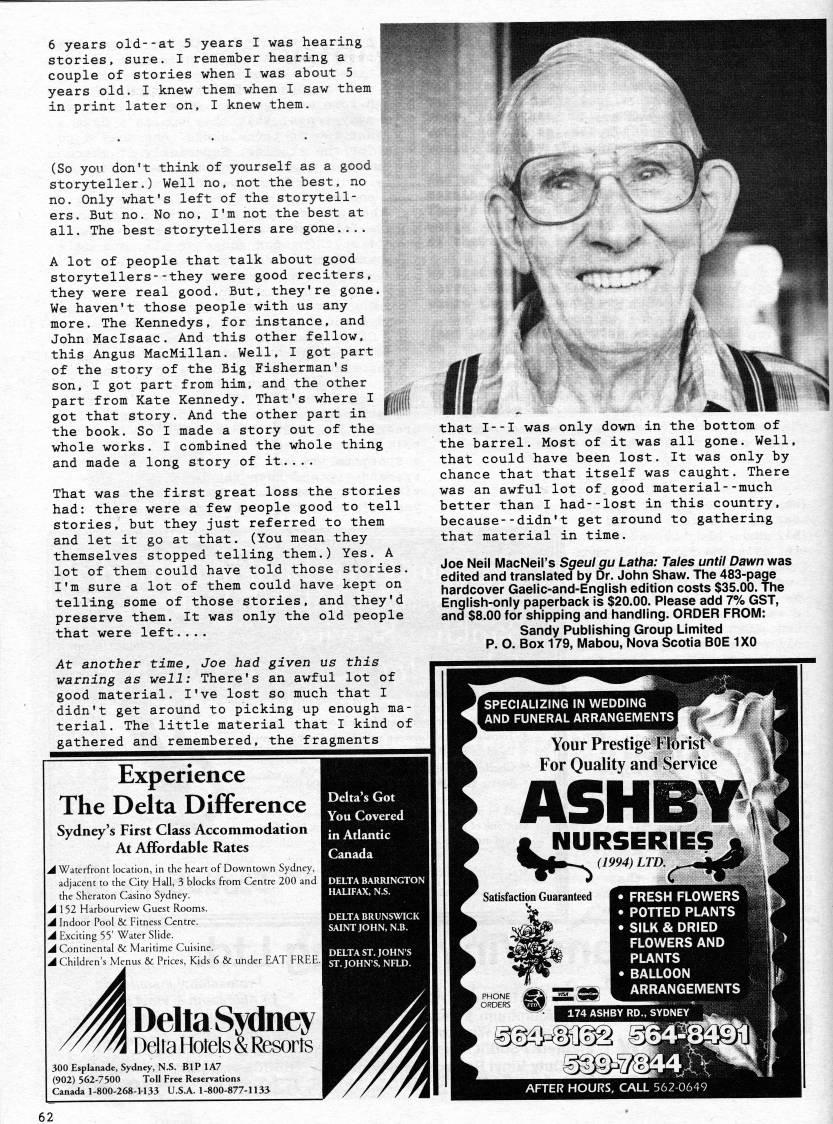 Published by Ronald Caplan on 1996/12/1 (308 reads)6 years old--at 5 years I was hearing stories, sure. I remember hearing a couple of stories when I was about 5 years old. I knew them when I saw them in print later on, I knew them. (So you don't think of yourself as a good storyteller.) Well no, not the best, no no. Only what's left of the storytell? ers. But no. No no, I'm not the best at all. The best storytellers are gone.... A lot of people that talk about good storytellers--they were good reciters, they were real good. But, they're gone. We haven't those people with us any more. The Kennedys, for instance, and John Maclsaac. And this other fellow, this Angus MacMillan. Well, I got part of the story of the Big Fisherman's son, I got part from him, and the other part from Kate Kennedy. That's where I got that story. And the other part in the book. So I made a story out of the whole works. I combined the whole thing and made a long story of it.... That was the first great loss the stories had: there were a few people good to tell stories, but they just referred to them and let it go at that. (You mean they themselves stopped telling them.) Yes. A lot of them could have told those stories. I'm sure a lot of them could have kept on telling some of those stories, and they'd preserve them. It was only the old people that were left.... At another time, Joe had given us this warning as well: There's an awful lot of good material. I've lost so much that I didn't get around to picking up enough ma? terial. The little material that I kind of gathered and remembered, the fragments Experience The Delta Difference Sydney's First Class Accommodation At Affordable Rates .'Waterfront location, in the heart of Downtown Sydney, adjacent to the City Hall, 3 blocks from Centre 200 and | the Sheraton Casino Sydney. A 152 Harbourview Guest Rooms. A Indoor Pool & Fitness Centre. A Exciting 55' Water Slide. A Continental & Maritime Cuisine. A Children's Menus & Prices, Kids 6 & under EAT FREE.I Deka's Got You Covered in Adantic Canada DELTA BRUNSWICK SAINT JOHN, N.B. DELTA ST. JOHNS ST.JOHNS, NFLD. that I--I was only down in the bottom of the barrel. Most of it was all gone. Well, that could have been lost. It was only by chance that that itself was caught. There was an awful lot of good material--much better than I had--lost in this country, because--didn't get around to gathering that material in time. Joe Nell MacNeil's Sgeul gu Latha: Tales until Dawn was edited and translated by Dr. John Shaw. The 483-page hardcover Gaelic-and-English edition costs $35.00. The English-only paperback is $20.00. Please add 7% GST, and $8.00 for shipping and handling. ORDER FROM: Sandy Publishing Group Limited P. O. Box 179, Mabou, Nova Scotia BOE 1X0 Delia Sydney | Delta Hotels & Resorts 300 Esplanade, Sydney, N.S. BlP 1A7 (902) 562-7500 Toll Free Reservations Canada 1-800-268-1133 U.S.A. 1-800-877-1133' SPECIALIZING IN WEDDING AND FUNERAL ARRANGEMENTS Your Prestige Fterisr' % For Quality and Service i NURSERIES (1994) LTD. Satisfaction Guaranteed ' FRESH FLOWERS • POTTED PLANTS > SILK & DRIED FLOWERS AND PLANTS > BALLOON ARRANGEMENTS 62