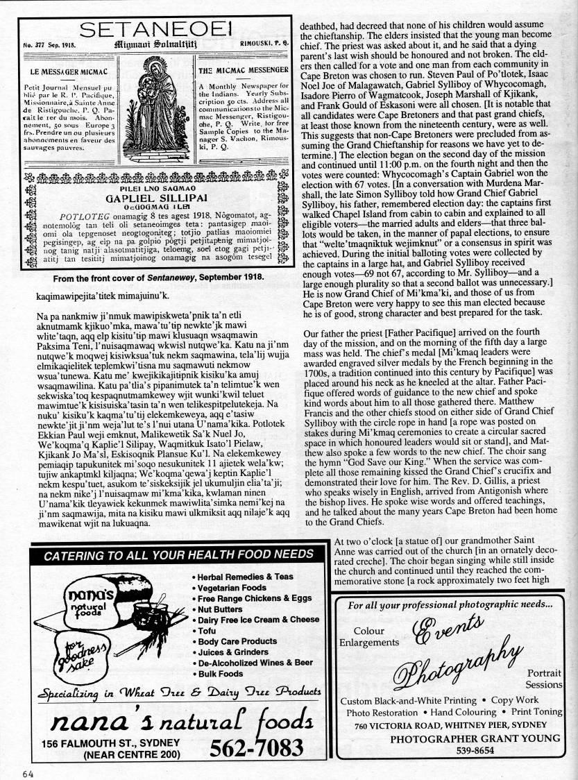 SETANEOEl No. 377 s?p. 1918. IHtnmaui 'nlnalttit; rimouski. -p. q. LEiWESSAGER MICMAC ;ue1 pu Petit Journal .U hlie par le R. ['. Missiomiaire.i .Sainte .-'nnfi de Risiigouclie, P. Q. Pa- cait le ler du mois. "Xbon- niiinent, 50 sous Europe 3 frs. Prendre unou plusieurs .-ibonncments en faveur des sauvages pauvres. TflE MICMAC MESSENGER A Monthly Nevvspafier for ttie Indians. Yearly Sub.s- cription 50 cts. .Address all cominunicationsto the Mic? mac MessenfJ'er, Ristigou- Dhe, P. Q. Write, lor free Sample Copies to t-he Ma- nag'er S. Vadion, Rimous? ki. P. Q. PILE! LNO SaQ/VVAO GAPLIEL SILLIPAI 0.-aOGMAa ILBi POT LOT EG onamagig 8 tes agest 1918. Nogomatot, ag- notemolog tan teli oli setaneoimges teta: pantasigep maoi- omi ola tepgenoset neogtogoniteg; totjio patlias maoiomiei pegisingep, ag eip na pa. golpio pogtji petjitaptenig mimatjai- nog tanig natji alasolniatitjiga, teloemg, soel etog gagi petji-' atitj tan tesititj mimatjoinog onamagiig na asogom tesegel From the front cover of Sentanewey, September 1918. kaqimawipejita'titek mimajuinu'k. Na pa nankmiw ji'nmuk mawipiskweta'pnik ta'n etli aknutmamk kjikuo'mka, mawa'tu'tip newkte'jk mawi wlite'taqn, aqq elp kisitu'tip mawi Idusuaqn wsaqmawin Paksima Teni, I'nuisaqmawaq wkwisl nutqwe'ka. Katu na ji'nm nutqwe'k moqwej kisiwksua'tuk nekm saqmawina, tela'lij wujja elmikaqielitek teplemkwi'tisna mu saqmawuti nekmow wsua'tunewa. Katu me' kwejikikajitipnikkisiku'ka amuj wsaqmawilina. Katu pa'tlia's pipanimutek ta'n telimtue'k wen sekwiska'toq kespaqnutmamkewey wjit wunki'kwil teluet mawimtue'kkisisuiska'tasin ta'n wen telikespitpelutekeja. Na nuku' kisiku'k kaqma'tu'tij elekemkeweya, aqq e'tasiw newkte'jit ji'nm weja'lut te's I'nui utana U'nama'kika. Potlotek Ekkian Paul weji emknut, Malikewetik Sa'k Nuel Jo, We'koqma'q Kaplie'l Silipay, Waqmitkuk Isato'l Pielaw, Kjikank Jo Ma'si, Eskisoqnik Plansue Ku'l. Na elekemkewey pemiaqip tapukunitek mi'soqo nesukunitek 11 ajietek wela'kw; tujiw ankaptmkl kiljaqna; We'koqma'qewa'j keptin Kaplie'l nekm kespu'tuet, asukom te'siskeksijik jel ukumuljin elia'ta'ji; na nekm nike'j I'nuisaqmaw mi'kma'kika, kwlaman ninen U'nama'kik tleyawiek kekunmek mawiwlita'simka nemi'kej na ji'nm saqmawija, mita na kisiku mawi ulkmiksit aqq nilaje'k aqq mawikenat wjit na lukuaqna. deathbed, had decreed that none of his children would assume the chieftanship. The elders insisted that the young man become chief. The priest was asked about it, and he said that a dying parent's last wish should be honoured and not broken. The eld? ers then called for a vote and one man from each community in Cape Breton was chosen to run. Steven Paul of Po'tlotek, Isaac Noel Joe of Malagawatch, Gabriel Sylliboy of Whycocomagh, Isadore Pierro of Wagmatcook, Joseph Marshall of Kjikank, and Frank Gould of Eskasoni were all chosen. [It is notable that all candidates were Cape Bretoners and that past grand chiefs, at least those known from the nineteenth century, were as well. This suggests that non-Cape Bretoners were precluded from as? suming the Grand Chieftanship for reasons we have yet to de? termine.] The election began on the second day of the mission and continued until 11:00 p.m. on the fourth night and then the votes were counted: Whycocomagh's Captain Gabriel won the election with 67 votes. [In a conversation with Murdena Mar? shall, the late Simon Sylliboy told how Grand Chief Gabriel Sylliboy, his father, remembered election day: the captains first walked Chapel Island from cabin to cabin and explained to all eligible voters • the married adults and elders • that three bal? lots would be taken, in the manner of papal elections, to ensure that "welte'tmaqniktuk wejimknut" or a consensus in spirit was achieved. During the initial balloting votes were collected by the captains in a large hat, and Gabriel Sylliboy received enough votes • 69 not 67, according to Mr. Sylliboy • and a large enough plurality so that a second ballot was unnecessary.] He is now Grand Chief of Mi'kma'ki, and those of us from Cape Breton were very happy to see this man elected because he is of good, strong character and best prepared for the task. Our father the priest [Father Pacifique] arrived on the fourth day of the mission, and on the morning of the fifth day a large mass was held. The chiefs medal [Mi'kmaq leaders were awarded engraved silver medals by the French beginning in the 1700s, a tradition continued into this century by Pacifique] was placed around his neck as he kneeled at the altar. Father Paci? fique offered words of guidance to the new chief and spoke kind words about him to all those gathered there. Matthew Francis and the other chiefs stood on either side of Grand Chief Sylliboy with the circle rope in hand [a rope was posted on stakes during Mi'kmaq ceremonies to create a circular sacred space in which honoured leaders would sit or stand], and Mat? thew also spoke a few words to the new chief The choir sang the hymn "God Save our King." When the service was com? plete all those remaining kissed the Grand Chief's crucifix and demonstrated their love for him. The Rev. D. Gillis, a priest who speaks wisely in Enghsh, arrived from Antigonish where the bishop lives. He spoke wise words and offered teachings, and he talked about the many years Cape Breton had been home to the Grand Chiefs. CATERING TO ALL YOUR HEALTH FOOD NEEDS • Herbal Remedies & Teas • Vegetarian Foods • Free Range Cliiclcens & Eggs • Nut Butters • Dairy Free Ice Cream & Cheese • Tofu • Body Care Products • Juices & Grinders • De-Alcoholized Wines & Beer • Bulk Foods <'b??.ciaLi2inQ in 'Wnaai 'xtt & U'airu 'xta 'Joducti nCLflCX i nataT.a[ fooai 562-7083 156 FALMOUTH ST., SYDNEY (NEAR CENTRE 200) At two o'clock [a statue of] our grandmother Saint Anne was carried out of the church [in an ornately deco? rated creche]. The choir began singing while still inside the church and continued until they reached the com? memorative stone [a rock approximately