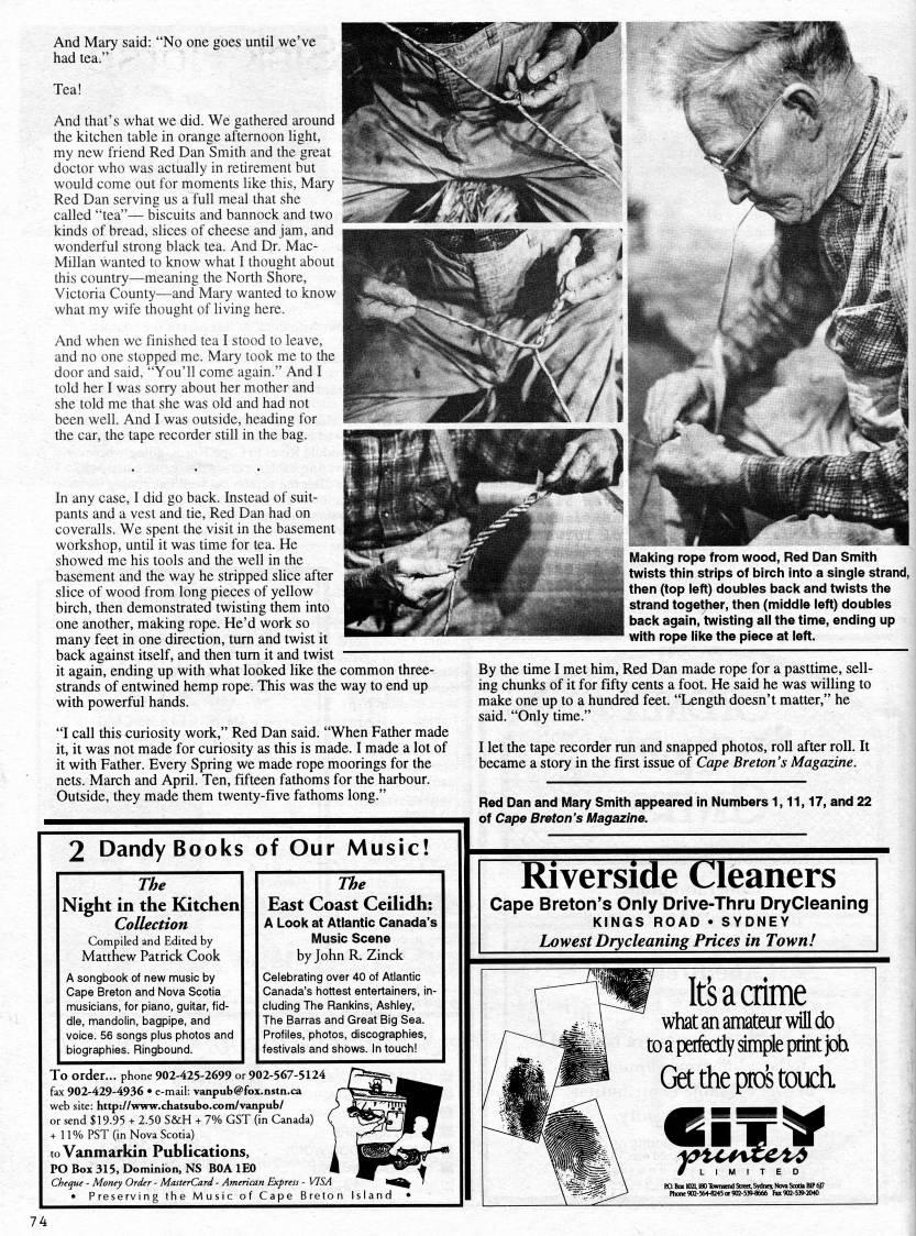 Published by Ronald Caplan on 1996/12/1 (191 reads)And Mary said: "No one goes until we've had tea." Tea! And that's what we did. We gathered around the kitchen table in orange afternoon light, my new friend Red Dan Smith and the great doctor who was actually in retirement but would come out for moments like this, Mary Red Dan serving us a full meal that she called "tea" • biscuits and bannock and two kinds of bread, slices of cheese and jam, and wonderful strong black tea. And Dr. Mac? Millan wanted to know what I thought about this country • meaning the North Shore, Victoria County • and Mary wanted to know what my wife thought of living here. And when we finished tea I stood to leave, and no one stopped me. Mary took me to the door and said, "You'll come again." And I told her I was sorry about her mother and she told me that she was old and had not been well. And I was outside, heading for the car, the tape recorder still in the bag. In any case, I did go back. Instead of suit- pants and a vest and tie. Red Dan had on coveralls. We spent the visit in the basement workshop, until it was time for tea. He showed me his tools and the well in the basement and the way he stripped slice after slice of wood from long pieces of yellow birch, then demonstrated twisting them into one another, making rope. He'd work so many feet in one direction, turn and twist it back against itself, and then turn it and twist it again, ending up with what looked like the common three- strands of entwined hemp rope. This was the way to end up with powerful hands. "I call this curiosity work," Red Dan said. "When Father made it, it was not made for curiosity as this is made. I made a lot of it with Father. Every Spring we made rope moorings for the nets. March and April. Ten, fifteen fathoms for the harbour. Outside, they made them twenty-five fathoms long." Making rope from wood, Red Dan Smith twists thin strips of birch into a single strand, then (top left) doubles back and twists the strand together, then (middle left) doubles back again, twisting all the time, ending up with rope like the piece at left. By the time I met him, Red Dan made rope for a pasttime, sell? ing chunks of it for fifty cents a foot. He said he was willing to make one up to a hundred feet. "Length doesn't matter," he said. "Only time." I let the tape recorder run and snapped photos, roU after roll. It became a story in the first issue of Cape Breton's Magazine. 2 Dandy Books of Our Music! The Night in the Kitchen Collection Compiled and Edited by Matthew Patrick Cook A songbook of new music by Cape Breton and Nova Scotia musicians, for piano, guitar, fid? dle, mandolin, bagpipe, and voice. 56 songs plus photos and biographies. Ringbound. The East Coast Ceilidh: A Look at Atlantic Canada's Music Scene by John R. Zinck Celebrating over 40 of Atlantic Canada's hottest entertainers, in? cluding The Rankins, Ashley, The Barras and Great Big Sea. Profiles, photos, discographies, festivals and shows. In touch! To order... phone 902-425-2699 or 902-567-5124 fax 902-429-4936 • e-mail: [email protected] web site: https//www.chatsubo.com/vanpub/ or send $19.95 + 2.50 S&H; + 7% GST (in Canada) + 11% PST (in Nova Scotia) to Vanmarkin Publications, PO Box 315, Dominion, NS BOA lEO Cheque - Money Order - MasterCard - American Express - VISA • Preserving the Music of Cape Breto Red Dan and Mary Smith appeared in Numbers 1,11,17, and 22 of Cape Breton's Magazine. Riverside Cleaners Cape Breton's Only Drive-Thru DryCleaning KINGS ROAD • SYDNEY Lowest Drycleaning Prices in Town! Its a Clime what an amateur will do to a perfectly simple print joh Gd; the pid touch M I T E D RO. Bm KKI. 180 Townstnd StiMt Sydney Nora Scotia MP 6J7 Phone 902-564?45 or 9a2-53 • 66 Ftt902-5??20?