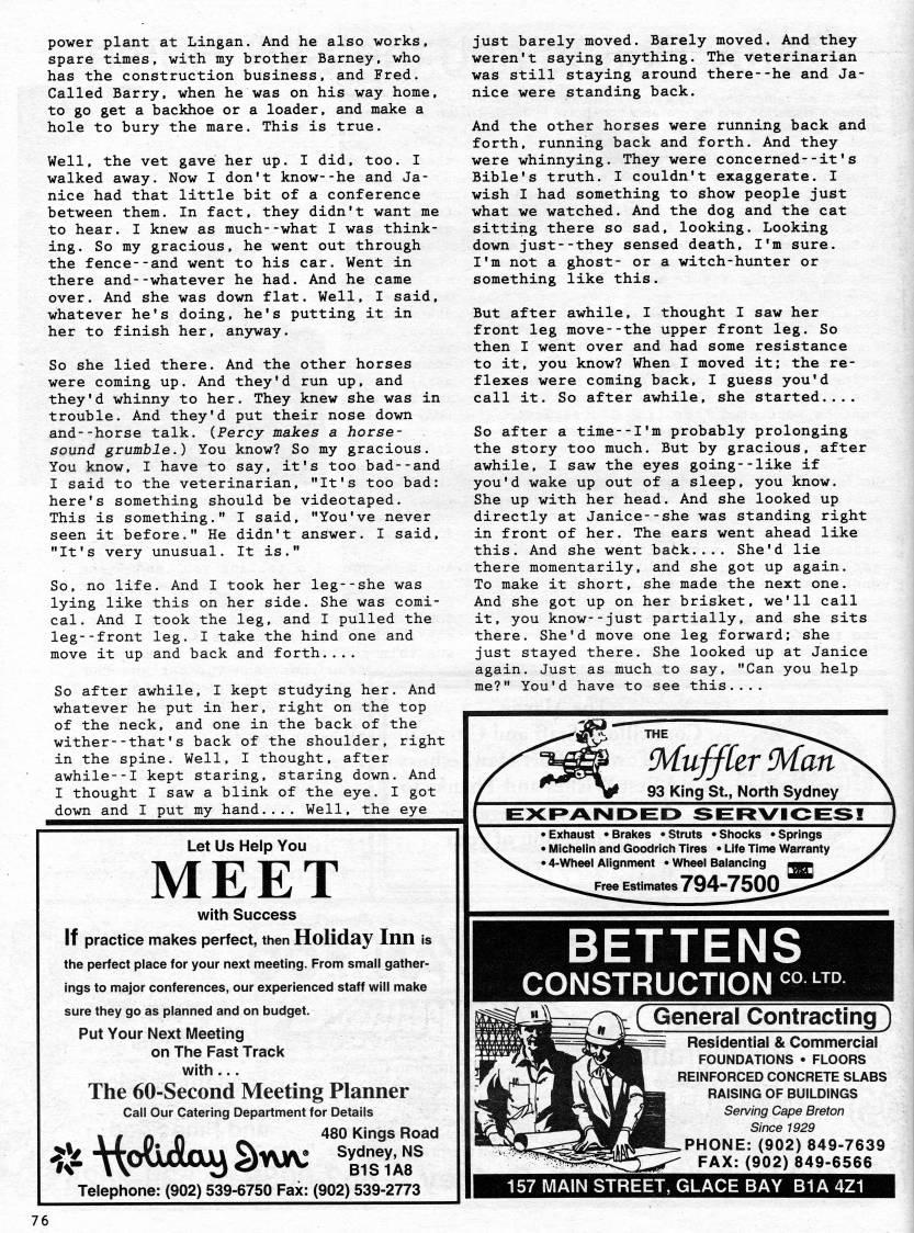 Published by Ronald Caplan on 1996/12/1 (150 reads)power plant at Lingan. And he also works, spare times, with my brother Barney, who has the construction business, and Fred. Called Barry, when he was on his way home, to go get a backhoe or a loader, and make a hole to bury the mare. This is true. Well, the vet gave her up. I did, too. I walked away. Now I don't know--he and Ja? nice had that little bit of a conference between them. In fact, they didn't want me to hear. I knew as much--what I was think? ing. So my gracious, he went out through the fence--and went to his car. Went in there and--whatever he had. And he came over. And she was down flat. Well, I said, whatever he's doing, he's putting it in her to finish her, anyway. So she lied there. And the other horses were coming up. And they'd run up, and they'd whinny to her. They knew she was in trouble. And they'd put their nose down and--horse talk. {Percy makes a horse- sound grumble.) You know? So my gracious. You know, I have to say, it's too bad--and I said to the veterinarian, "It's too bad: here's something should be videotaped. This is something." I said, "You've never seen it before." He didn't answer. I said, "It's very unusual. It is." So, no life. And I took her leg--she was lying like this on her side. She was comi? cal. And I took the leg, and I pulled the leg--front leg. I take the hind one and move it up and back and forth.... So after awhile, I kept studying her. And whatever he put in her, right on the top of the neck, and one in the back of the wither--that's back of the shoulder, right in the spine. Well, I thought, after awhile--I kept staring, staring down. And I thought I saw a blink of the eye. I got down and I put my hand.... Well, the eye Let Us Help You MEET with Success If practice makes perfect, then Holiday Inn is the perfect place for your next meeting. From small gather? ings to major conferences, our experienced staff will make sure they go as planned and on budget. Put Your Next Meeting on The Fast Track with... The 60-Second Meeting Planner Call Our Catering Department for Details 480 Kings Road Telephone: (902) 539-6750 Fax: (902) 539-2773 'v-(oWcxxj' just barely moved. Barely moved. And they weren't saying anything. The veterinarian was still staying around there--he and Ja? nice were standing back. And the other horses were running back and forth, running back and forth. And they were whinnying. They were concerned--it's Bible's truth. I couldn't exaggerate. I wish I had something to show people just what we watched. And the dog and the cat sitting there so sad, looking. Looking down just--they sensed death, I'm sure. I'm not a ghost- or a witch-hunter or something like this. But after awhile, I thought I saw her front leg move--the upper front leg. So then I went over and had some resistance to it, you know? When I moved it; the re? flexes were coming back, I guess you'd call it. So after awhile, she started.... So after a time--I'm probably prolonging the story too much. But by gracious, after awhile, I saw the eyes going--like if you'd wake up out of a sleep, you know. She up with her head. And she looked up directly at Janice--she was standing right in front of her. The ears went ahead like this. And she went baCk.... She'd lie there momentarily, and she got up again. To make it short, she made the next one. And she got up on her brisket, we'll call it, you know--just partially, and she sits there. She'd move one leg forward: she just stayed there. She looked up at Janice again. Just as much to say, "Can you help me?" You'd have to see this.... Muffler Man 93 King St., North Sydney iD SERVIOES! • Exhaust • Brakes 'Struts • Shocks • Springs • Michelin and Goodrich Tires • Life Time Warranty • 4-Wheel Alignment • Wheel Balancing 8 Estimates 794-7500 BETTENS CONSTRUCTION'"' • General ContractingJ Residential & Commercial FOUNDATIONS • FLOORS REINFORCED CONCRETE SLABS RAISING OF BUILDINGS Serving Cape Breton Since 1929 PHONE: (902)849-7639 FAX: (902)849-6566 157 MAIN STREET, GLACE BAY B1A4Z1 76