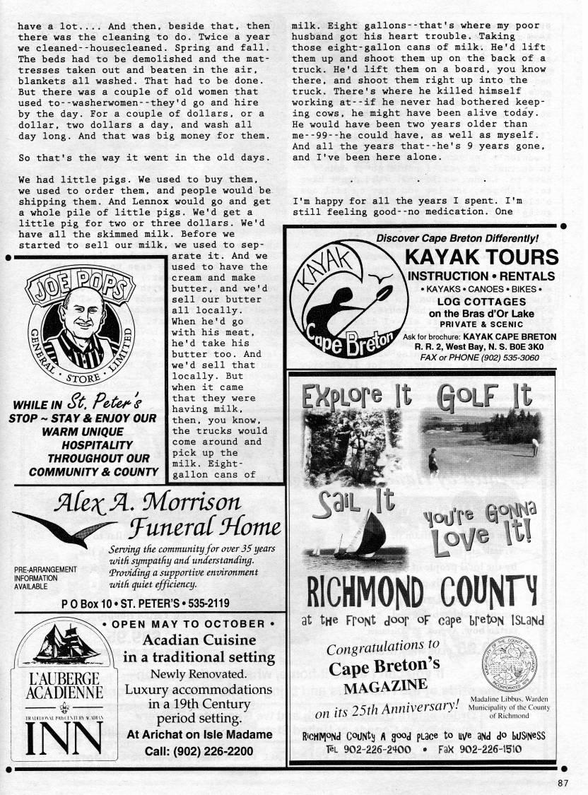 Published by Ronald Caplan on 1996/12/1 (136 reads)have a lot.... And then, beside that, then there was the cleaning to do. Twice a year we cleaned--housecleaned. Spring and fall. The beds had to be demolished and the mat? tresses taken out and beaten in the air, blankets all washed. That had to be done. But there was a couple of old women that used to--washerwomen--they'd go and hire by the day. For a couple of dollars, or a dollar, two dollars a day, and wash all day long. And that was big money for them. So that's the way it went in the old days. milk. Eight gallons--that's where my poor husband got his heart trouble. Taking those eight-gallon cans of milk. He'd lift them up and shoot them up on the back of a truck. He'd lift them on a board, you know there, and shoot them right up into the truck. There's where he killed himself working at--if he never had bothered keep? ing cows, he might have been alive today. He would have been two years older than me--99--he could have, as well as myself. And all the years that--he's 9 years gone, and I've been here alone. We had little pigs. We used to buy them, we used to order them, and people would be shipping them. And Lennox would go and get a whole pile of little pigs. We'd get a little pig for two or three dollars. We'd have all the skimmed milk. Before we started to sell our milk, we used to sep- Iarate it. And we used to have the cream and make butter, and we'd sell our butter all locally. When he'd go with his meat, he'd take his butter too. And we'd sell that locally. But when it came that they were having milk, then, you know, the trucks would come around and pick up the milk. Eight- gallon cans of WHILE IN St. Pete'e STOP ~ Sr4y & ENJOY OUR WARM UNIQUE HOSPITALITY THROUGHOUT OUR COMMUNITY & COUNTY Me?cJ'* Morrison J'umraiHomt PRE-ARRANGEMENT INFORMATION AVAILABLE Strving the community for over 3 S years witk sympathy and understanding. Providing a supportive environment with quiet efficiency. P 0 Box 10 • ST. PETER'S • 535-2119 UAUBERGE ACADIENNE TKI)III()I. i'MIKIMl KI VCADIW INN • OPEN MAY TO OCTOBER • Acadian Cuisine in a traditional setting Newly Renovated. Luxury accommodations in a 19th Century period setting. At Arichat on Isle Madame Call: (902) 226-2200 I'm happy for all the years I spent. I'm still feeling good--no medication. One Discover Cape Breton Differently! KAYAK TOURS INSTRUCTION • RENTALS • KAYAKS • CANOES • BIKES • LOG COTTAGES on the Bras d'Or Lake PRIVATE & SCENIC Ask for brochure: KAYAK CAPE BRETON R. R. 2, West Bay, N. 8. BOE 3K0 FAX or PHONE (902) 535-3060 RICHMOND mm at tHe FroNt door OF cape bretof' IStaNd Congratulations to Cape Breton's MAGAZINE on its 25th Anniversary! Madaline Libbus. Warden Municipality of the County of Richmond RiCHMONd CoUNti) A good place to liVe aNd do bUSsNeSS PL 902-226-2400 • FaK 902-226-1510