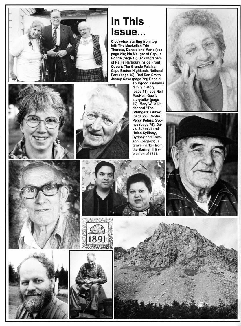 Published by Ronald Caplan on 1996/12/1 (128 reads)In This Issue... Clockwise, starting from top left: The MacLellan Trio • Theresa, Donald and Marie (see page 28); Ida Mauger of Cap La Ronde (page 1); Jack Ingraham of Neil's Harbour (Inside Front Cover); The Grande Falaise, Cape Breton Highlands National Park (page 38); Red Dan Smith, Jersey Cove (page 72); Ranald Thurgood, Gabarus family history (page 11); Joe Neil MacNeil, Gaelic storyteller (page 49); Mary Willa Lit? tler and "The Strangers' Grave" (page 29). Centre: ,''' Percy Peters, Syd- Mm '''y (pag? 75); Da- '??1 vid Schmidt and Helen Sylliboy, Sydney and Eska? soni (page 63); a grave marker from the Springhill Ex? plosion of 1891.