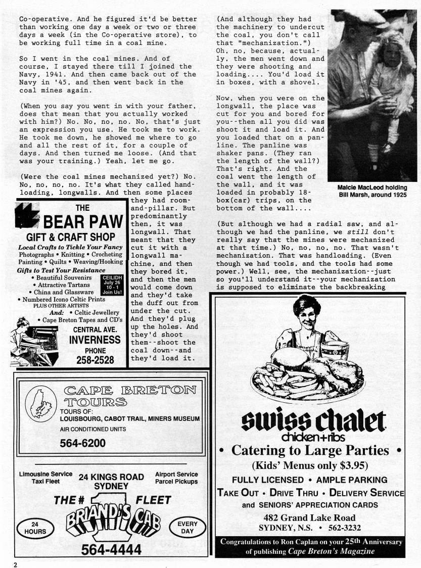 Published by Ronald Caplan on 1997/6/1 (445 reads)Co-operative. And he figured it'd be better than working one day a week or two or three days a week (in the Co-operative store), to be working full time in a coal mine. So I went in the coal mines. And of course, I stayed there till I joined the Navy, 1941. And then came back out of the Navy in '45, and then went back in the coal mines again. (When you say you went in with your father, does that mean that you actually worked with him?) No. No, no, no. No, that's just an expression you use. He took me to work. He took me down, he showed me where to go and all the rest of it, for a couple of days. And then turned me loose. (And that was your training.) Yeah, let me go. (Were the coal mines mechanized yet?) No. No, no, no, no. It's what they called hand- loading, longwalls. And then some places they had room- itjj' THE m BEAR PAW GIFTS CRAFT SHOP Local Crafts to Tickle Your Fancy Photographs • Knitting • Crocheting Painting • Quilts • Weaving/Hooking Gifts to Test Your Resistance • Beautiful Souvenirs • Attractive Tartans • China and Glassware • Numbered Icono Celtic Prints PLUS OTHER ARTISTS And: • Celtic Jewellery • Cape Breton Tapes and CD's CENTRAL AVE. INVERNESS PHONE 258-2528 and-pillar. But predominantly then, it was longwall. That meant that they cut it with a longwall ma? chine, and then they bored it, and then the men would come down and they'd take the duff out from under the cut. And they'd plug up the holes. And they'd shoot them--shoot the coal down--and they'd load it. TOURS OF: LOUISBOURG, CABOT TRAIL, MINERS MUSEUM AIR CONDITIONED UNITS 564-6200 Limousine Service Taxi Fleet 24 KINGS ROAD SYDNEY THE it (And although they had the machinery to undercut the coal, you don't call that "mechanization.") Oh, no, because, actual? ly, the men went down and they were shooting and loading.... You'd load it in boxes, with a shovel. Now, when you were on the longwall, the place was cut for you and bored for ' you--then all you did was shoot it and load it. And you loaded that on a pan- line. The panline was shaker pans. (They ran the length of the wall?) That's right. And the coal went the length of the wall, and it was loaded in probably 18- box(car) trips, on the bottom of the wall.... Malcle MacLeod holding Bill Marsh, around 1925 (But although we had a radial saw, and al? though we had the panline, we still don't really say that the mines were mechanized at that time.) No, no, no, no. That wasn't mechanization. That was handloading. (Even though we had tools, and the tools had some power.) Well, see, the mechanization--just so you'll understand it--your mechanization is supposed to eliminate the backbreaking 564-4444 $iui$$ Chalet chickan+ribs • Catering to Large Parties (Kids' Menus only $3.95) FULLY LICENSED • AMPLE PARKING Take Out • Drive Thru • Delivery Service and SENIORS' APPRECIATION CARDS 482 Grand Lake Road SYDNEY, N.S. • 562-3232 Congratulations to Ron Caplan on your 25th Anniversary of publishing Cape Breton's Magazine
